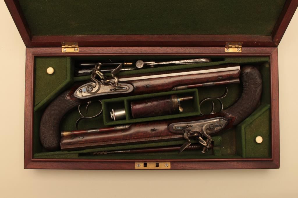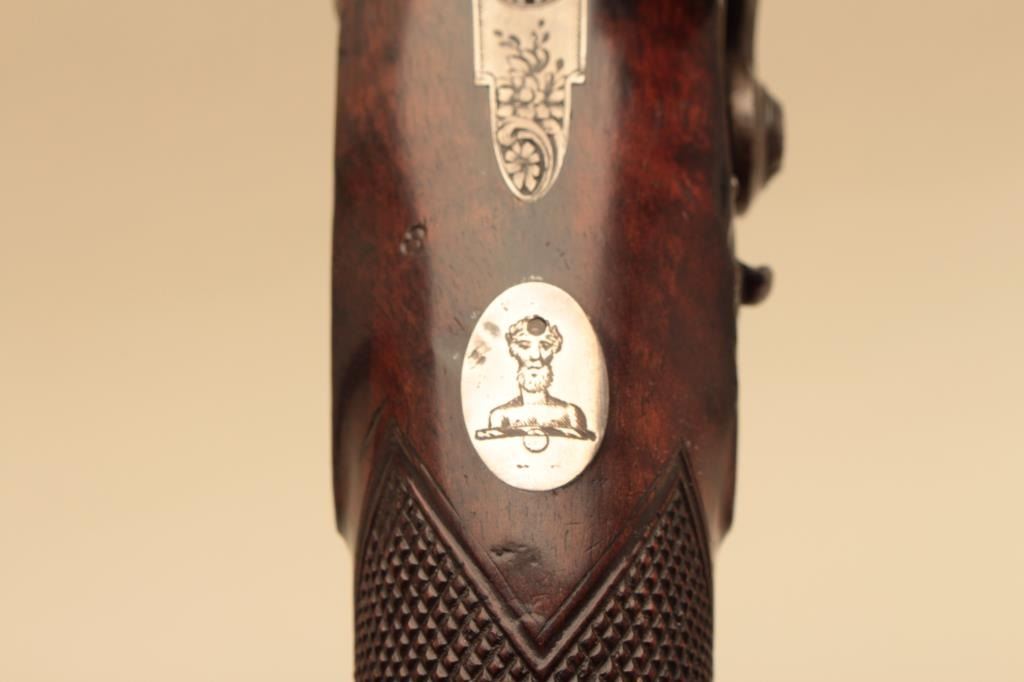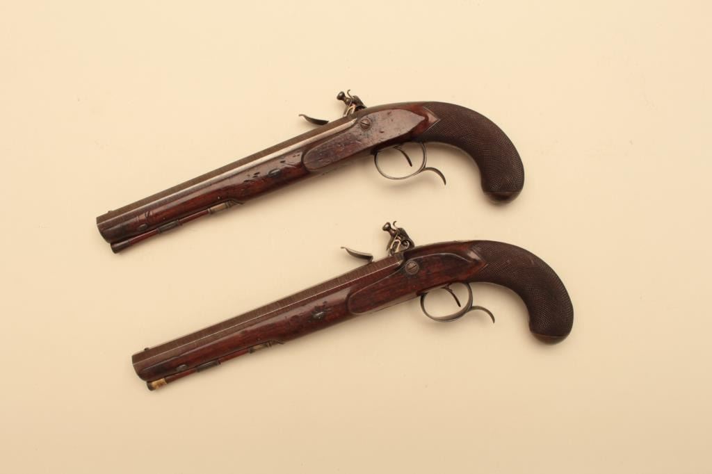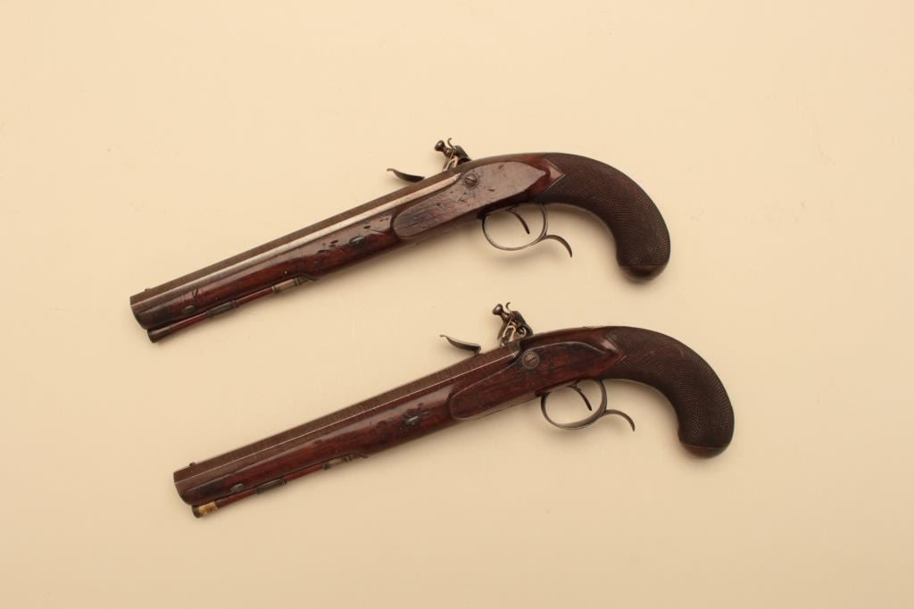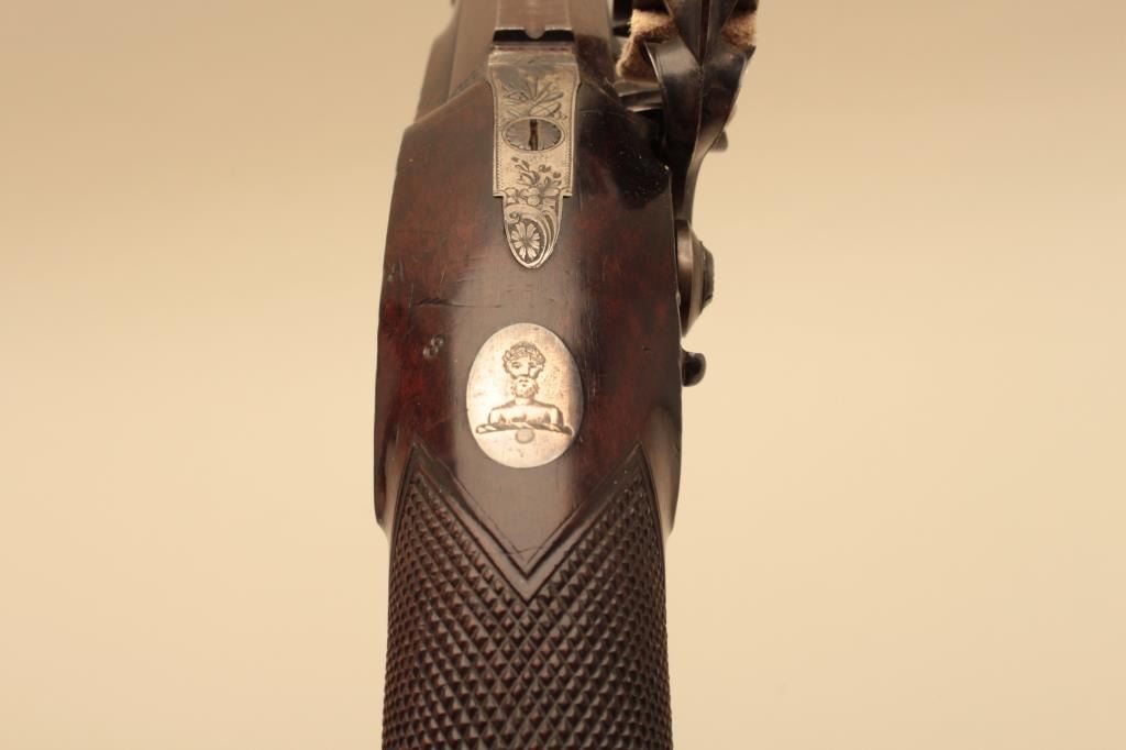 Pair of John Manton flintlock dueling pistols in case with accessories. Measures 15 ½” overall with 9 ½” barrels of .58 caliber smoothbore. Most of the brown and case hardened English finished remain. The stocksare very good with crisp checkering and some minor dents and scratches. Sharp markings and crisp edges. In original English case showing John Manton label in the lid. Correct style English leather covered flask, moldand screw driver. The wrist is inlaid with a silver plaque that is engraved. A crest of bearded man wearing wreath on head (Similar to ancient coins). The pair show Manton quality features with gold plugs andwaterproof pans. An exceptional set by top maker to British royalty. (Antique) Est.: $15,000-$30,000