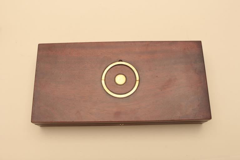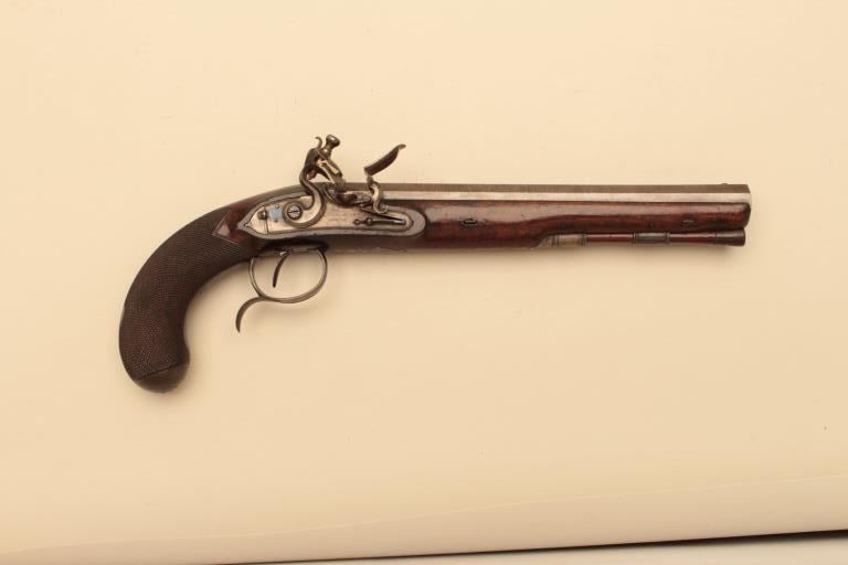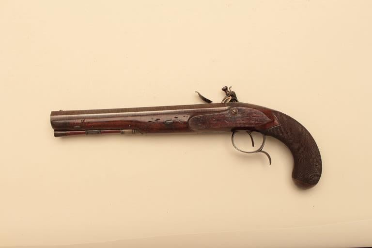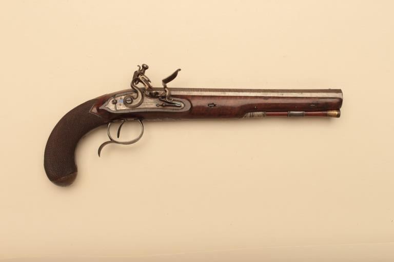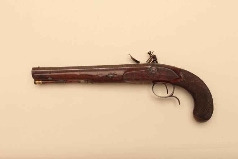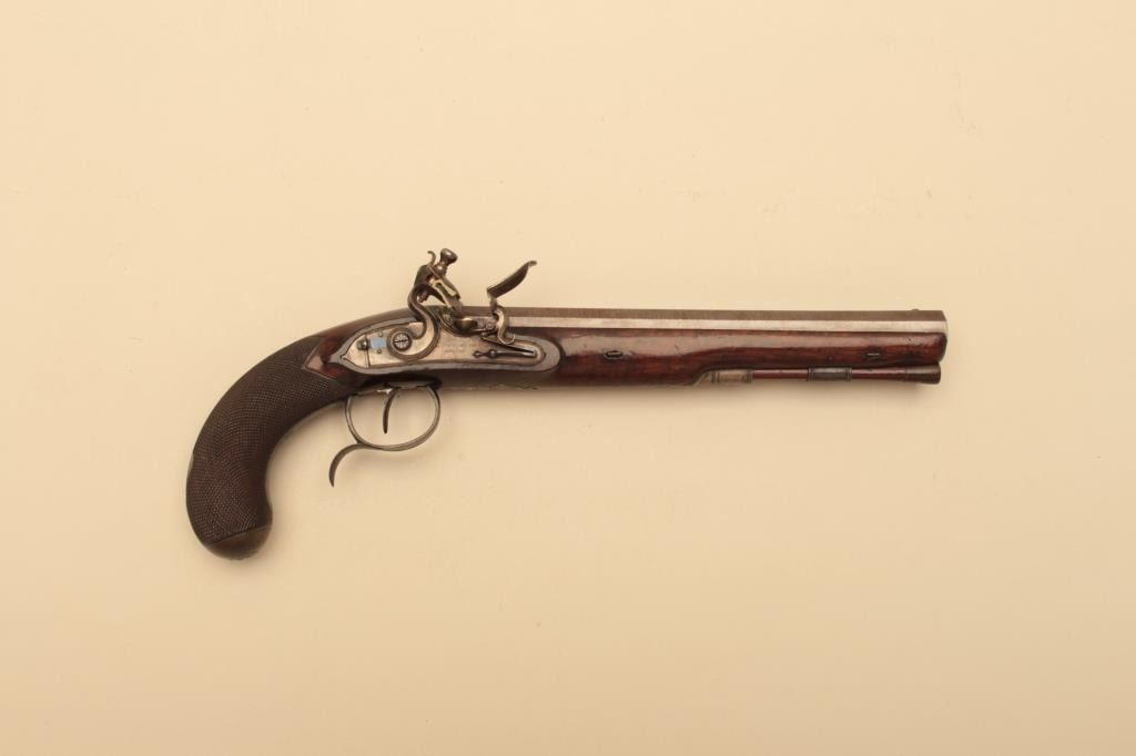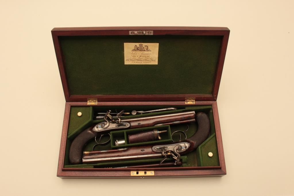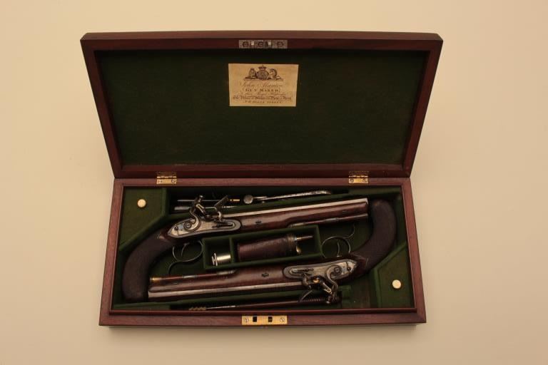 Pair of John Manton flintlock dueling pistols in case with accessories. Measures 15 ½” overall with 9 ½” barrels of .58 caliber smoothbore. Most of the brown and case hardened English finished remain. The stocksare very good with crisp checkering and some minor dents and scratches. Sharp markings and crisp edges. In original English case showing John Manton label in the lid. Correct style English leather covered flask, moldand screw driver. The wrist is inlaid with a silver plaque that is engraved. A crest of bearded man wearing wreath on head (Similar to ancient coins). The pair show Manton quality features with gold plugs andwaterproof pans. An exceptional set by top maker to British royalty. (Antique) Est.: $15,000-$30,000