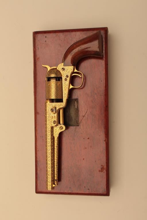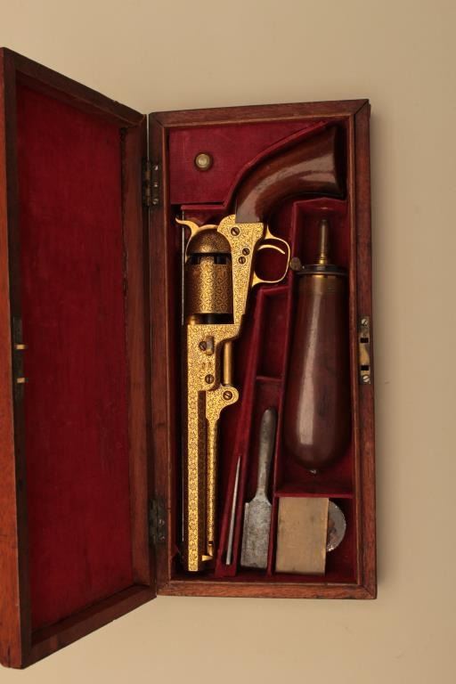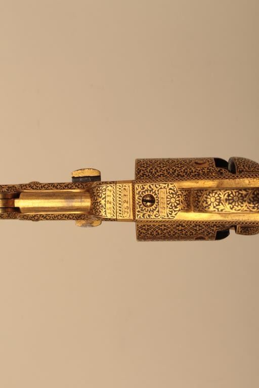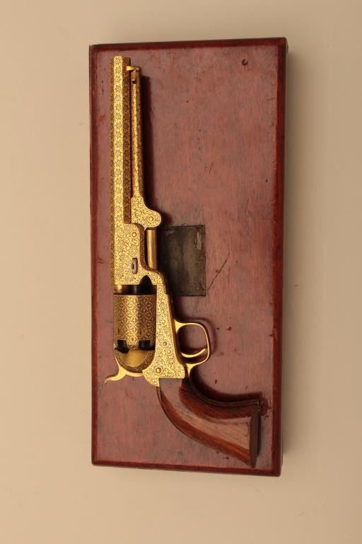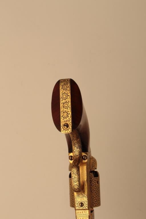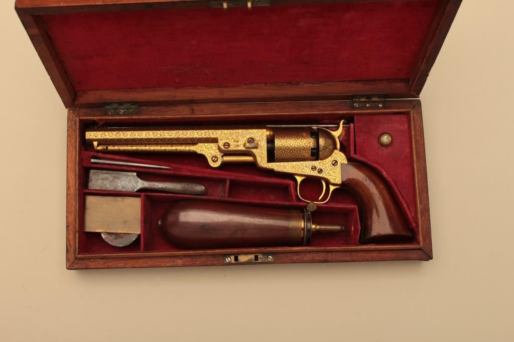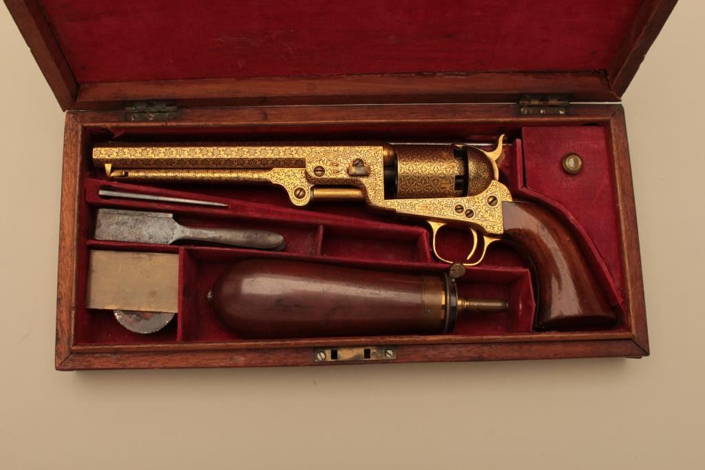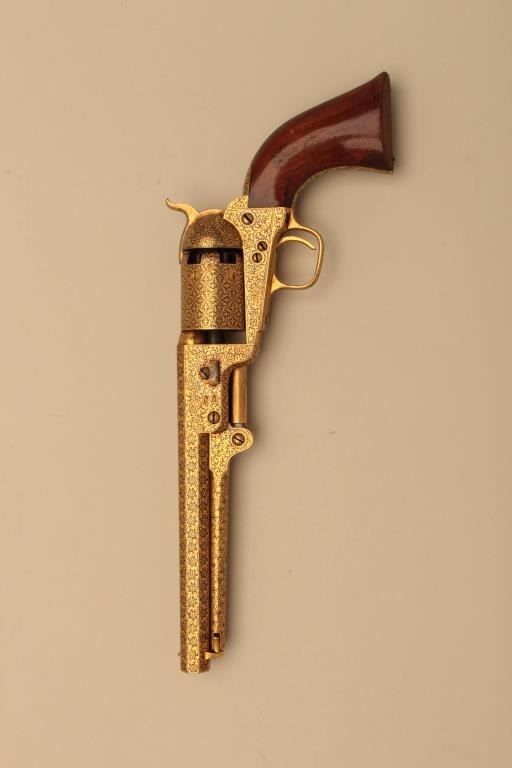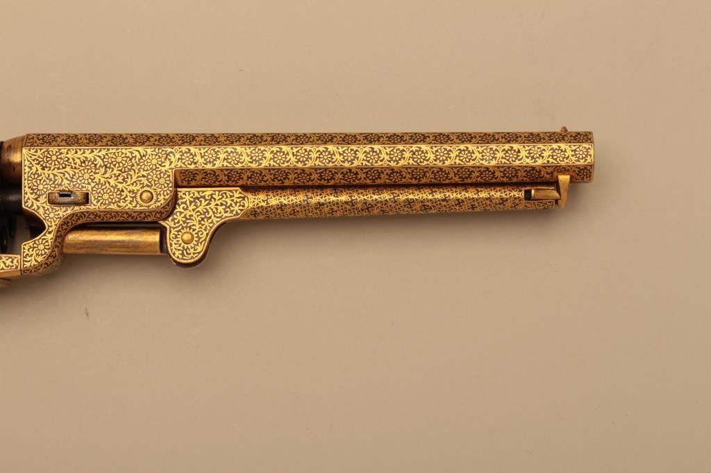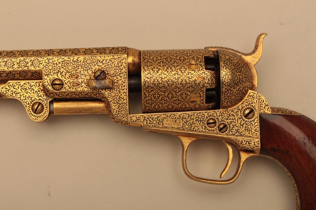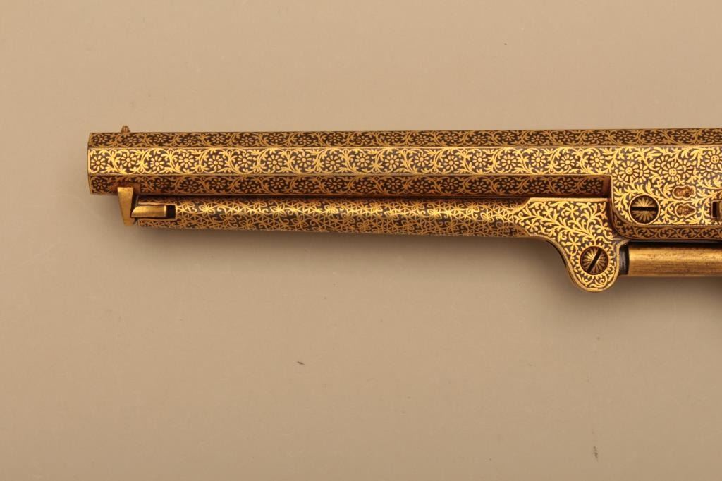 Colt 1851 Navy Revolver London Series with full and ornate of the period Indian gold Damascus decoration, S/N 35232 (Refer ‘The Colt Engraving” book volume 1 pages 217-223 for similar but not as finely detailedexamples). The revolver is all matching with excellent grips and fine overall condition with gold almost 100% intact and of exception and detailed quality. Contained within original to the period Colt Navy case withdesirable Navy marked flask and full accessories. The case is good to very good condition with minor wear and marks to outside case. The best of this type we have examined in 50 years of collecting andbrokering fine Colt percussion. Fit for a Maharaja! (Antique) Est.: $25,000-$50,000