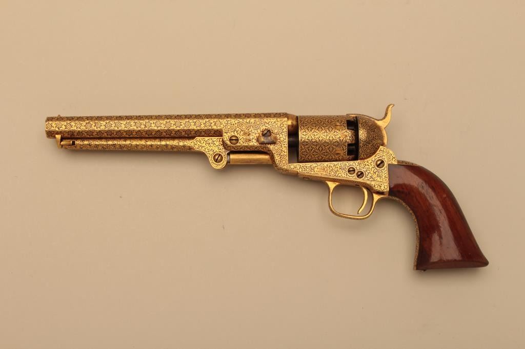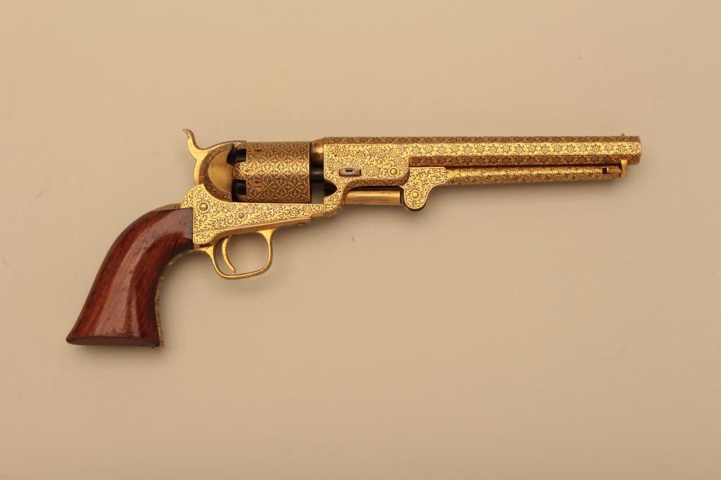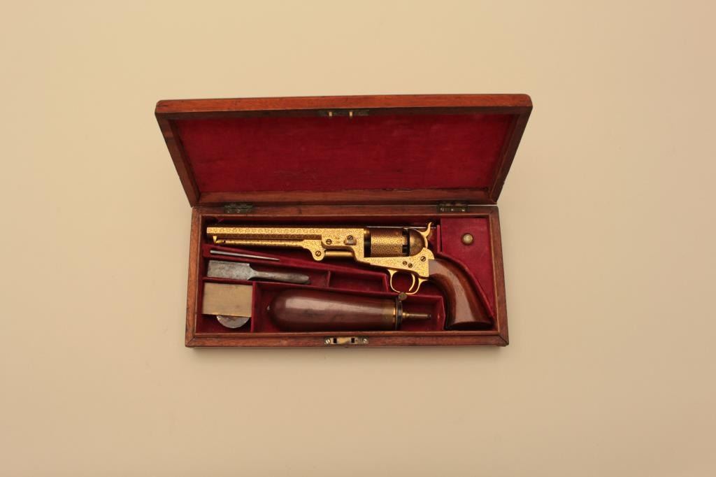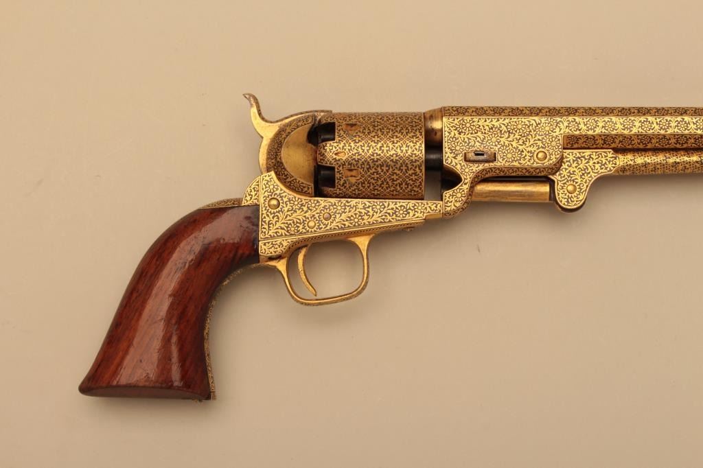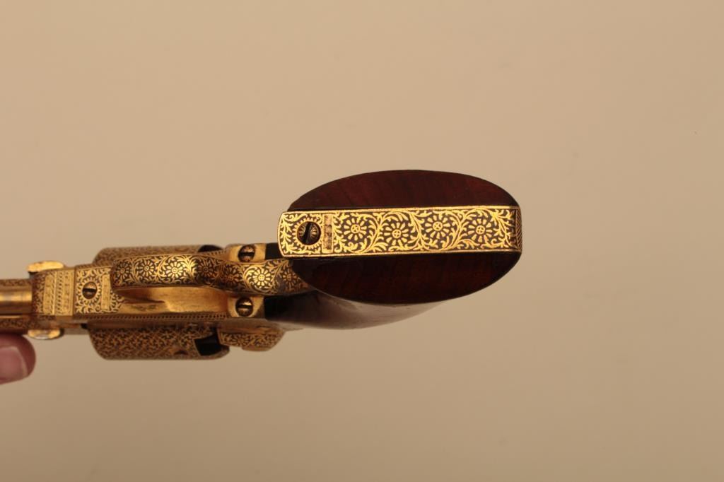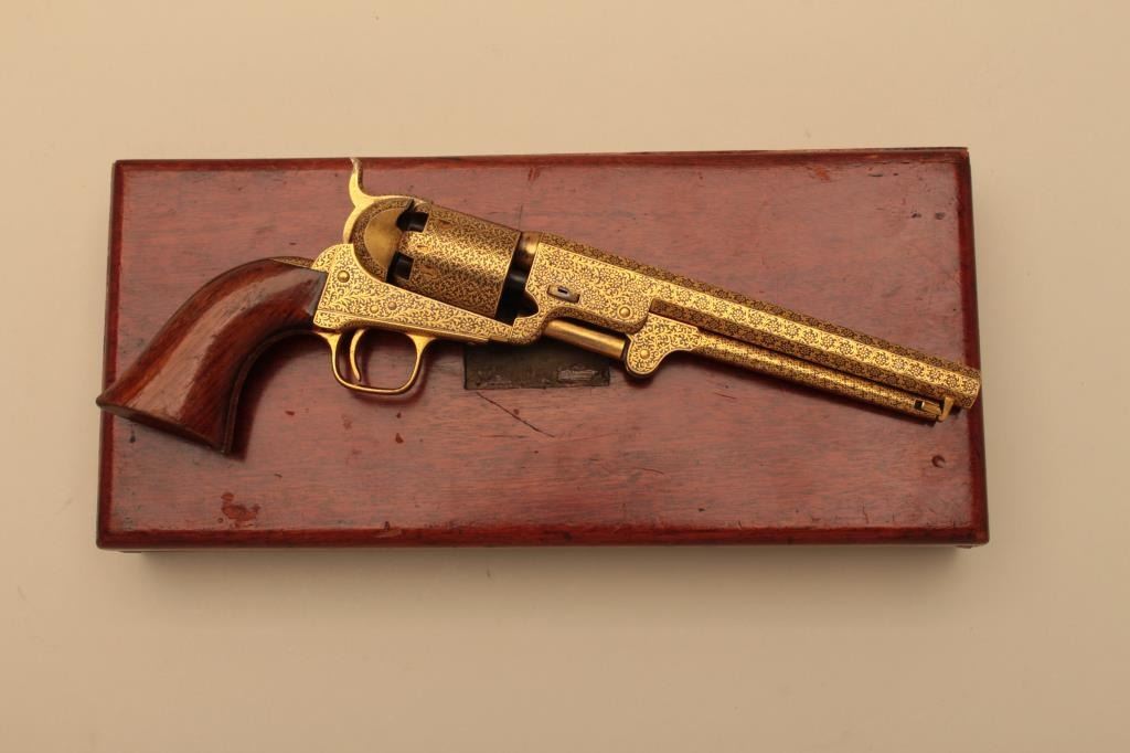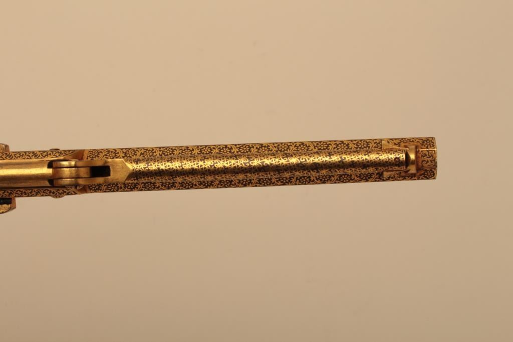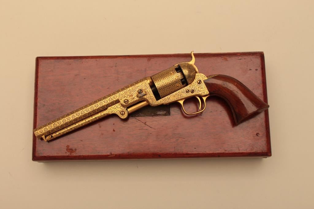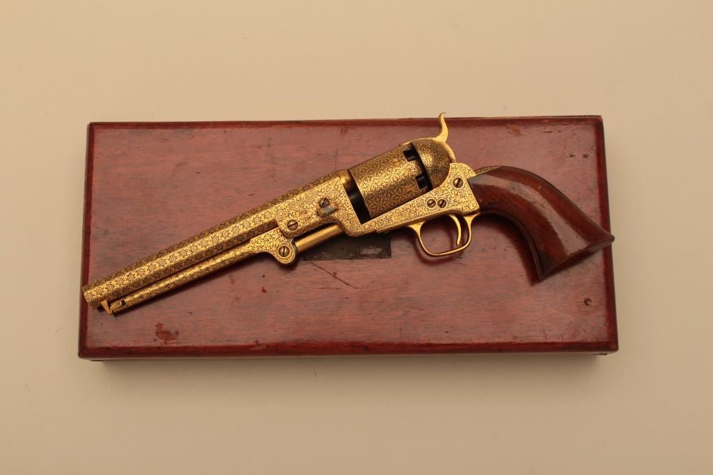 Colt 1851 Navy Revolver London Series with full and ornate of the period Indian gold Damascus decoration, S/N 35232 (Refer ‘The Colt Engraving” book volume 1 pages 217-223 for similar but not as finely detailedexamples). The revolver is all matching with excellent grips and fine overall condition with gold almost 100% intact and of exception and detailed quality. Contained within original to the period Colt Navy case withdesirable Navy marked flask and full accessories. The case is good to very good condition with minor wear and marks to outside case. The best of this type we have examined in 50 years of collecting andbrokering fine Colt percussion. Fit for a Maharaja! (Antique) Est.: $25,000-$50,000