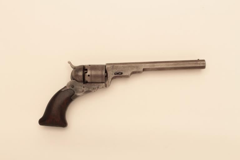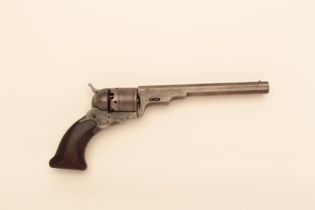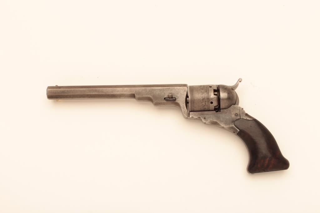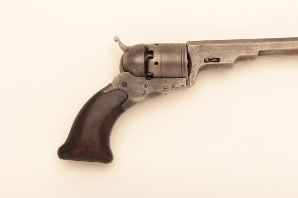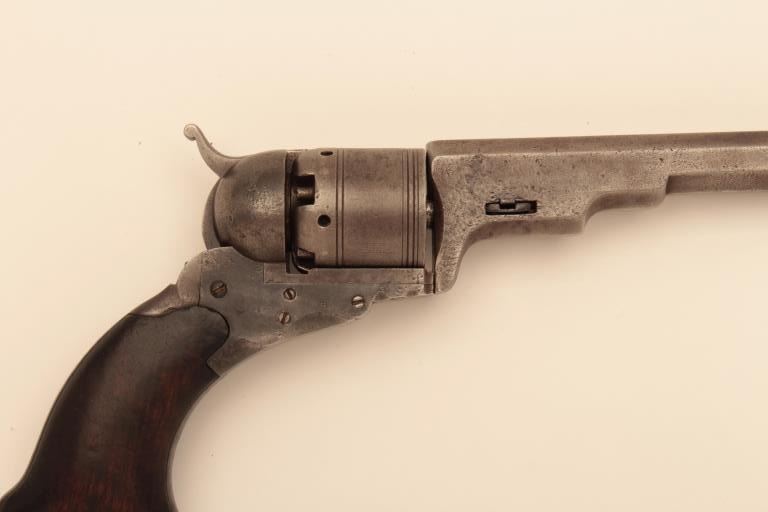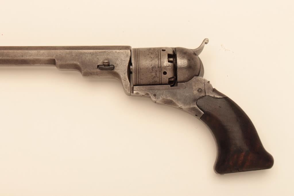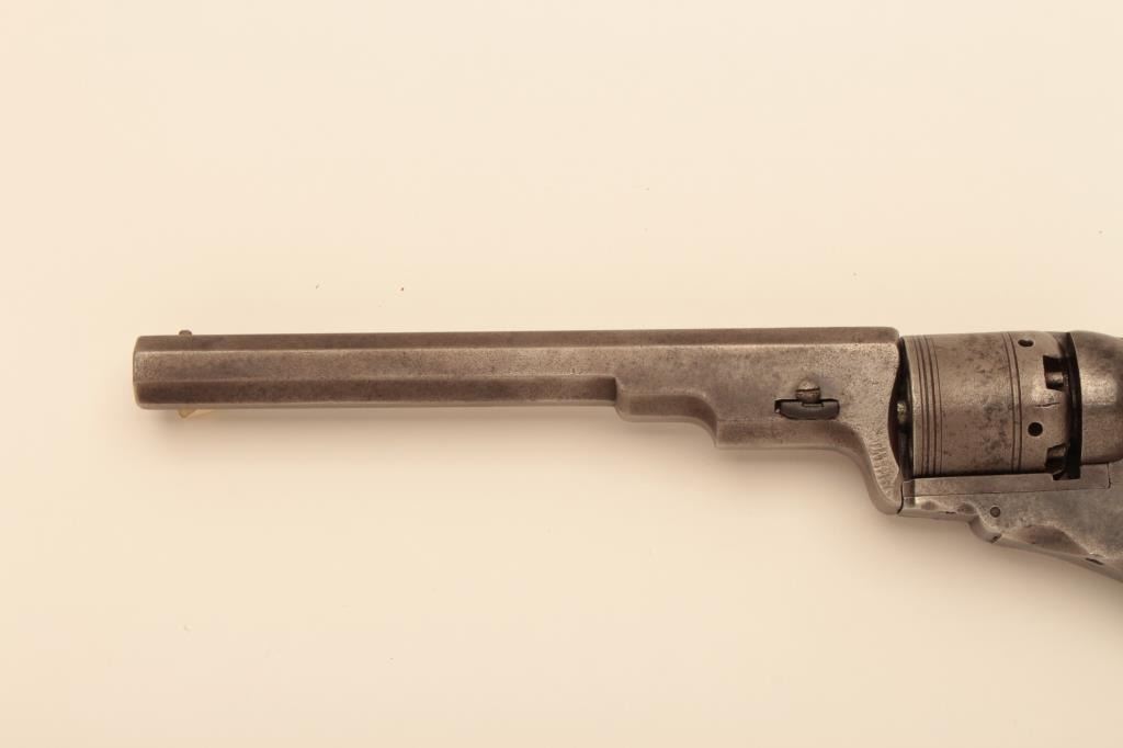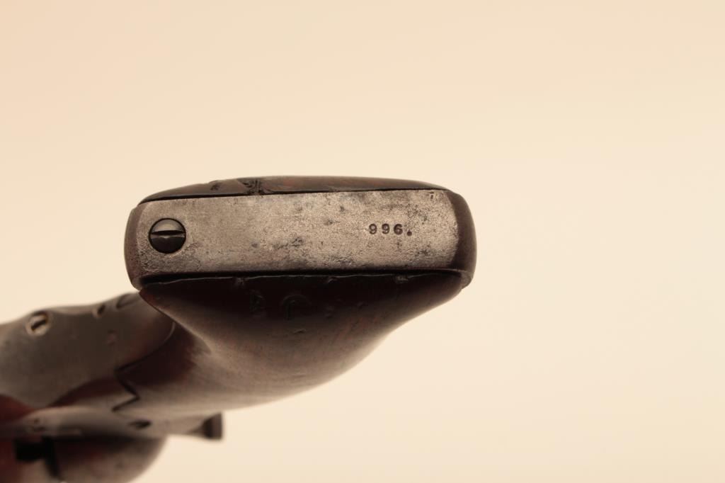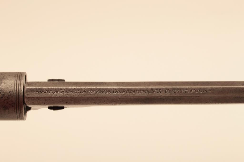Colt Texas Paterson with a 7 ½” barrel in .36 caliber, S/N 996 remaining in fair to good condition with excellent provenance and illustrated history. Pictured on page 155 of R.L. Wilsons “The Paterson Book”. ProvenanceHerb Glass Sr. 1946, Charles Nichols 1946-1998, Jay Brown 1998-2004, Denny (Mr. Paterson) Levett, Bobby Smith, Lou Steadman 2004-2006, Eugene Mathis 2006-2010, and a prominent southern California collector ofnote. This subject Paterson has seen some restoration and freshening to markings and stampings along with light cleaning. The wedge is an excellent replacement. . The grips show wear from carry but generally good to very good. The Colt has a good general appearance with faint traces of finish within patina. The cylinder shows 10%-20% scene with “Olt” of Colt remaining. The mechanism works and the gun locks up. One of onlyapproximately 1000 made of which 180 were acquired for Texas. The Walker and Paterson were termed as museum quality due to their rarity and importance by Joe Kindig in the 1930’s who was considered the dean of