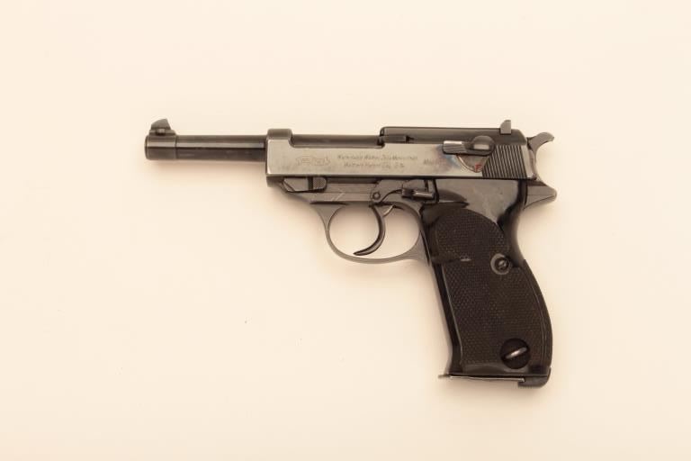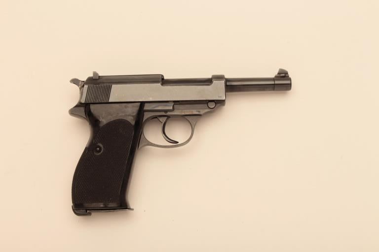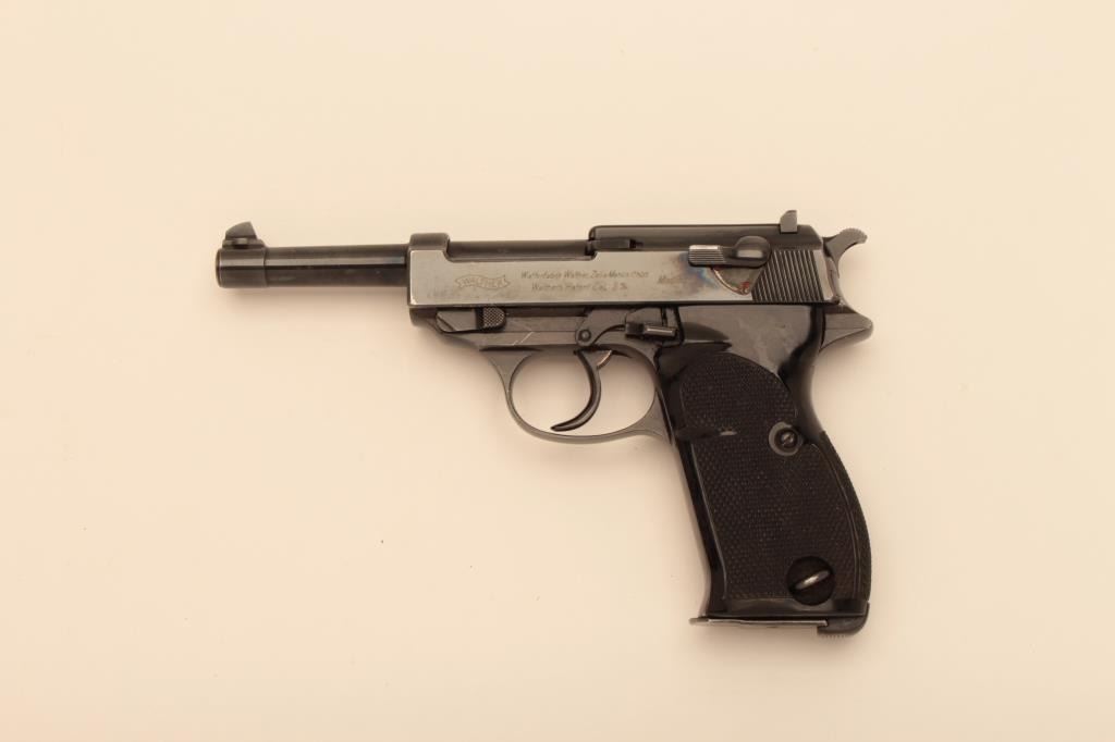 Walther HP, #H1515, 9mm, 5" barrel, high polish blue, retangular firing pin, checkered plastic grips. Pistol is in fine condition overall, showing approximately 95% original finish, thinning on the edges. Matchingbarrel with good bore, some light erosion. Magazine numbered 1293. (C&R/PPT) Est. $1250-2500