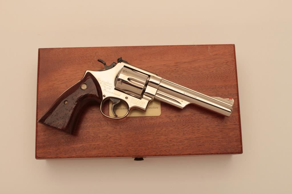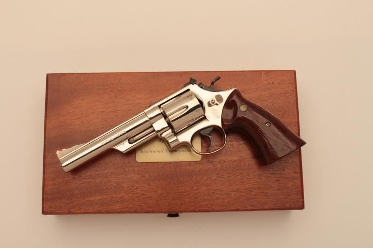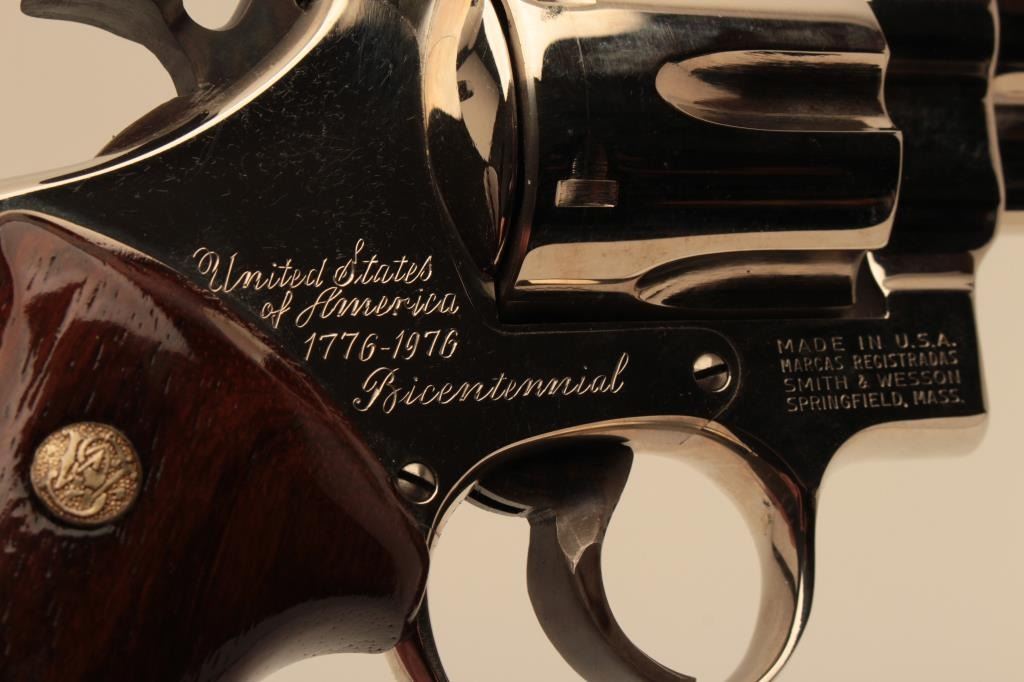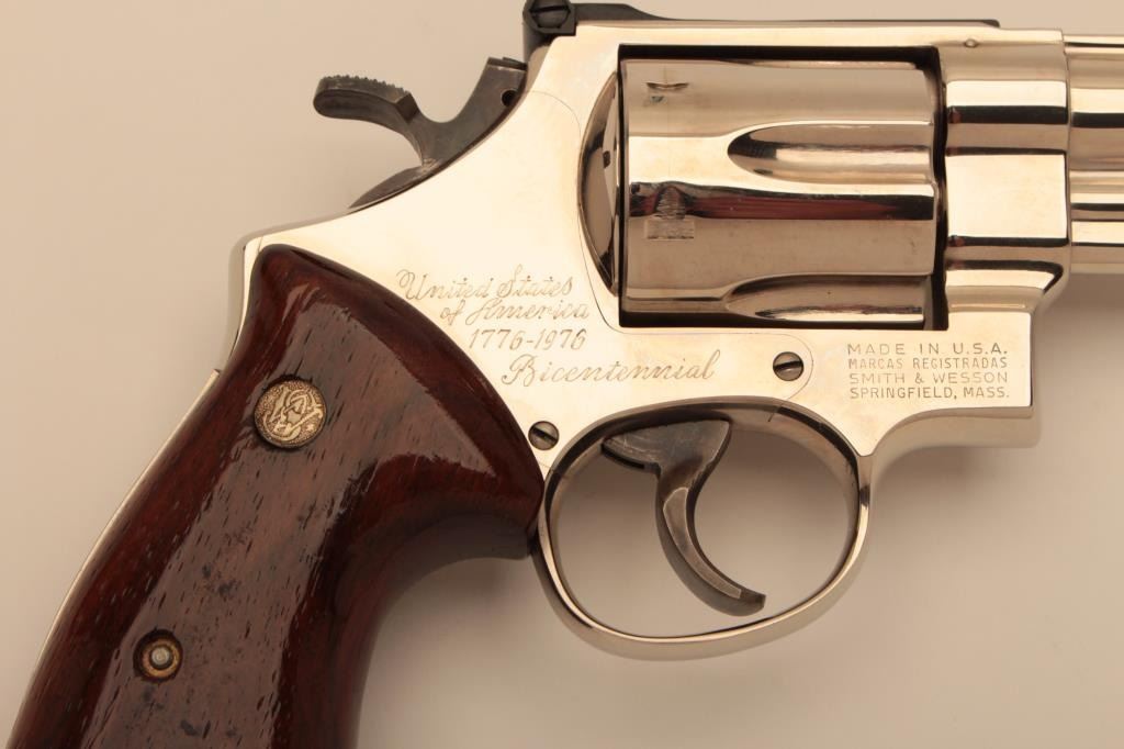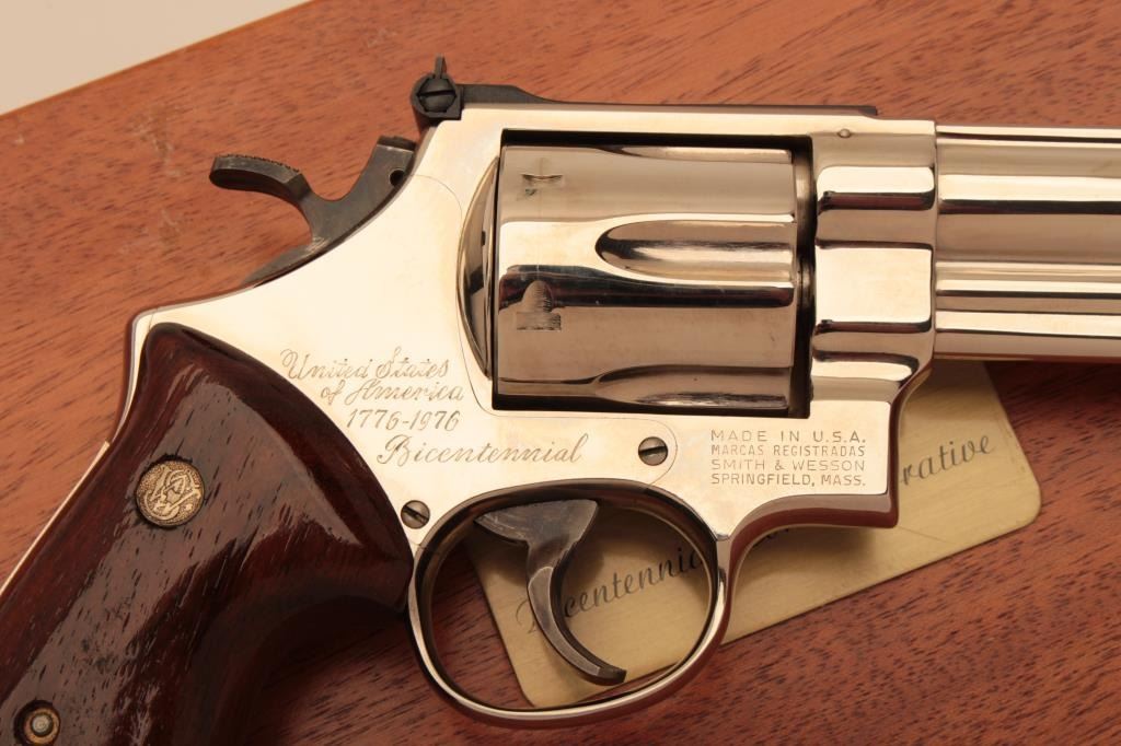 Very few known of this Smith & Wesson United States of America Bicentennial DA Commemorative revolver, .41 Magnum caliber, 6” barrel, nickel finish, smooth wood medallion combat grips, S/N N144905; overalllike new condition with factory wood display case showing Commemorative plaque on top of lid. (C&R Commemorative). Est.: $3,000-$6,000.