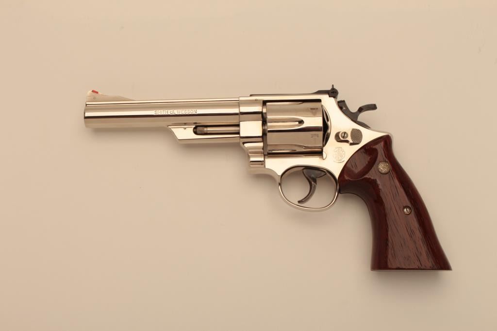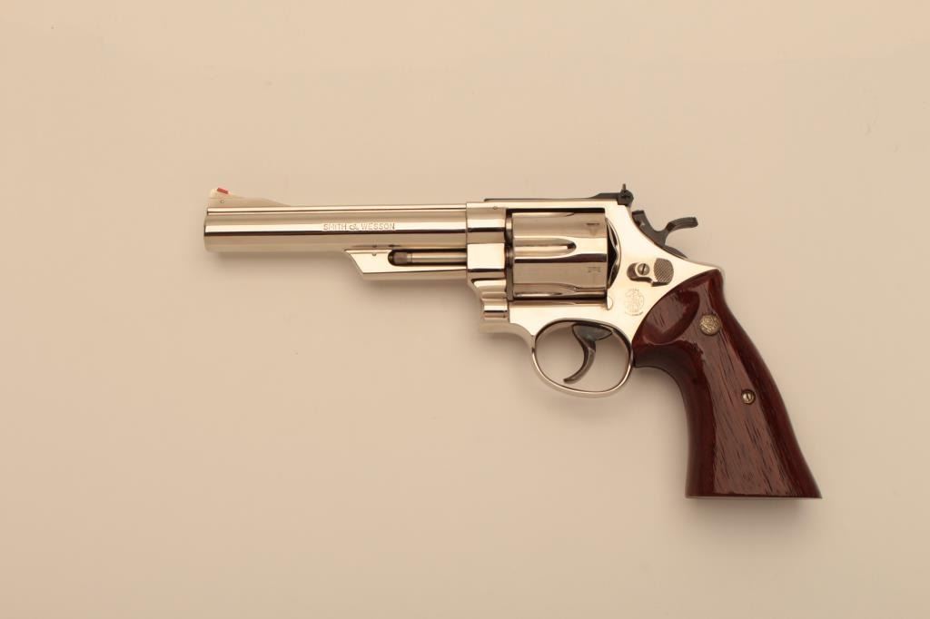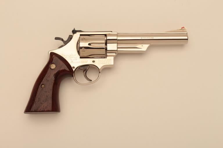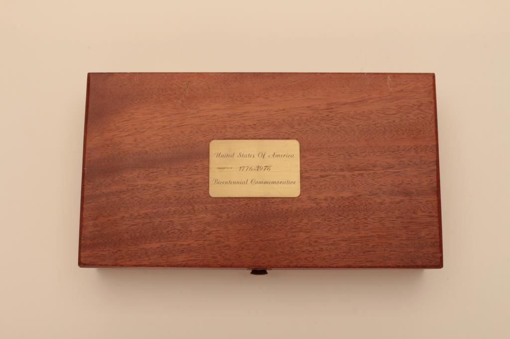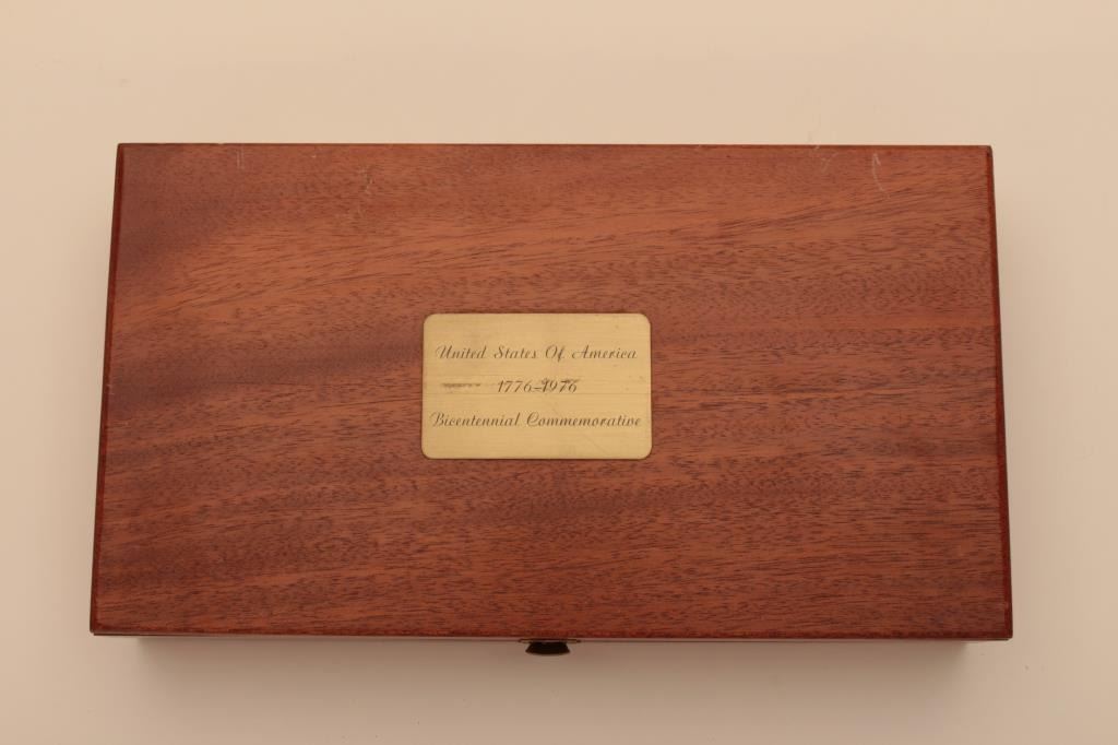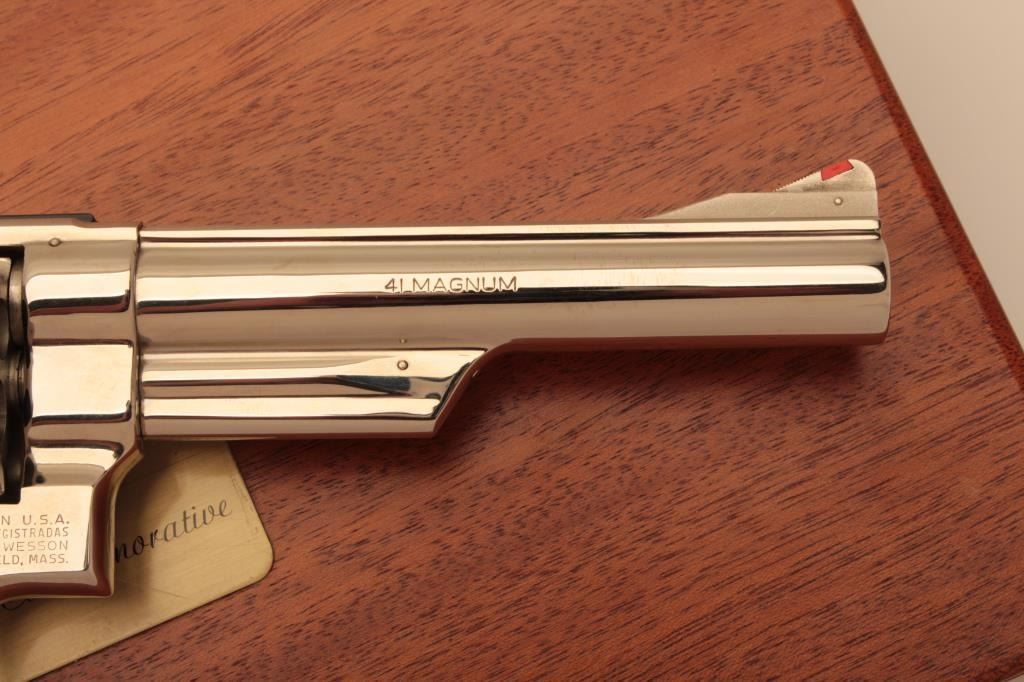 Very few known of this Smith & Wesson United States of America Bicentennial DA Commemorative revolver, .41 Magnum caliber, 6” barrel, nickel finish, smooth wood medallion combat grips, S/N N144905; overalllike new condition with factory wood display case showing Commemorative plaque on top of lid. (C&R Commemorative). Est.: $3,000-$6,000.