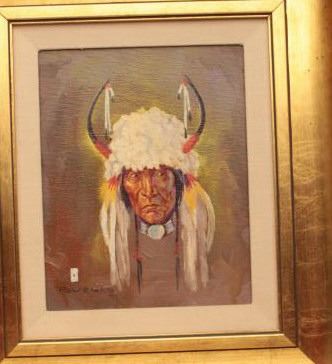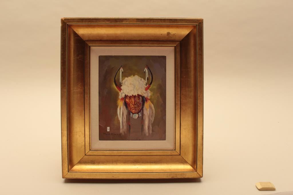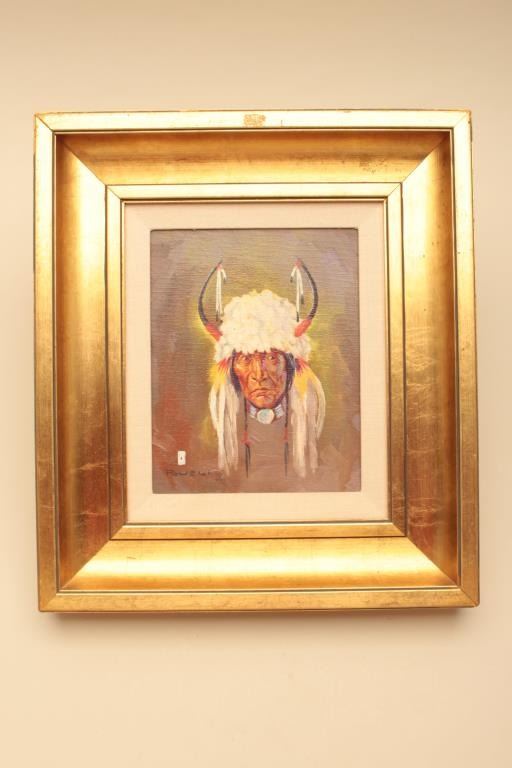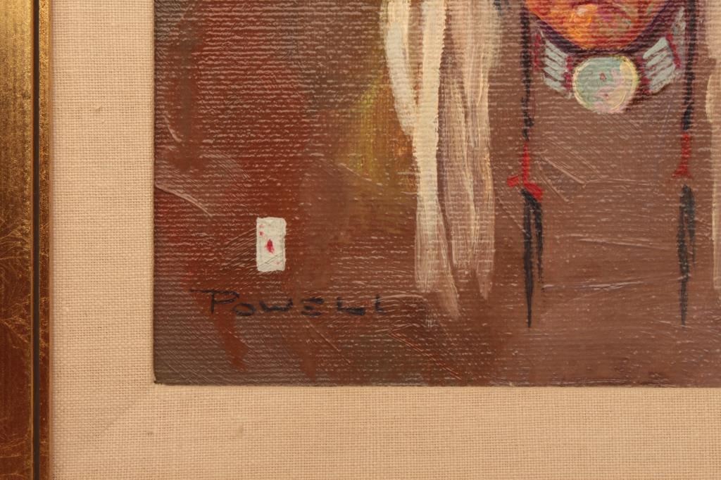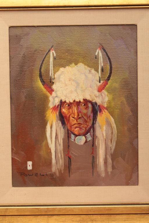 Original oil painting on canvas signed lower left “Ace Powell” with vignette of playing cards. Shows brave in white buffalo headdress with horns. Measures approximately 10” x 8” image only. Nicely framed. Est.: $1500-$3000
