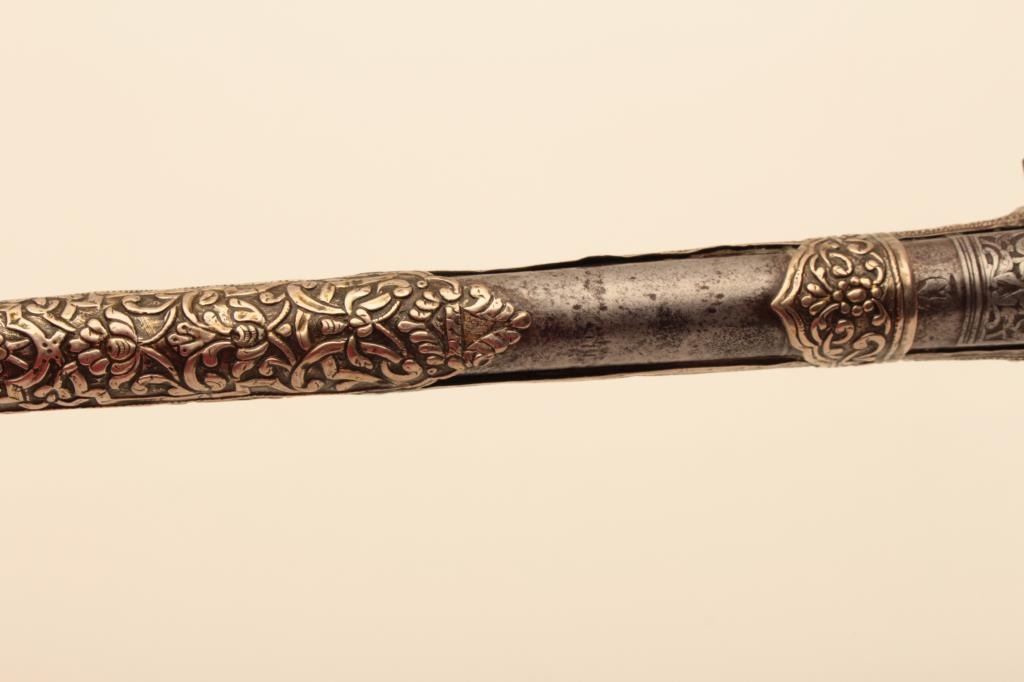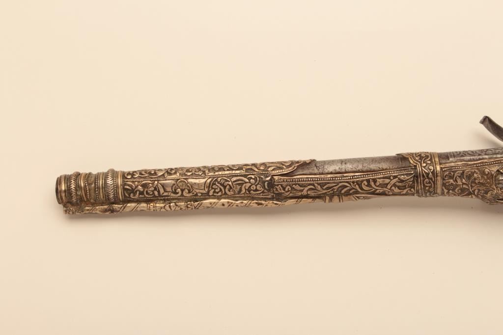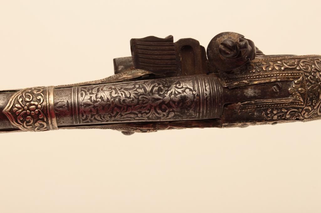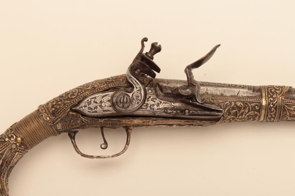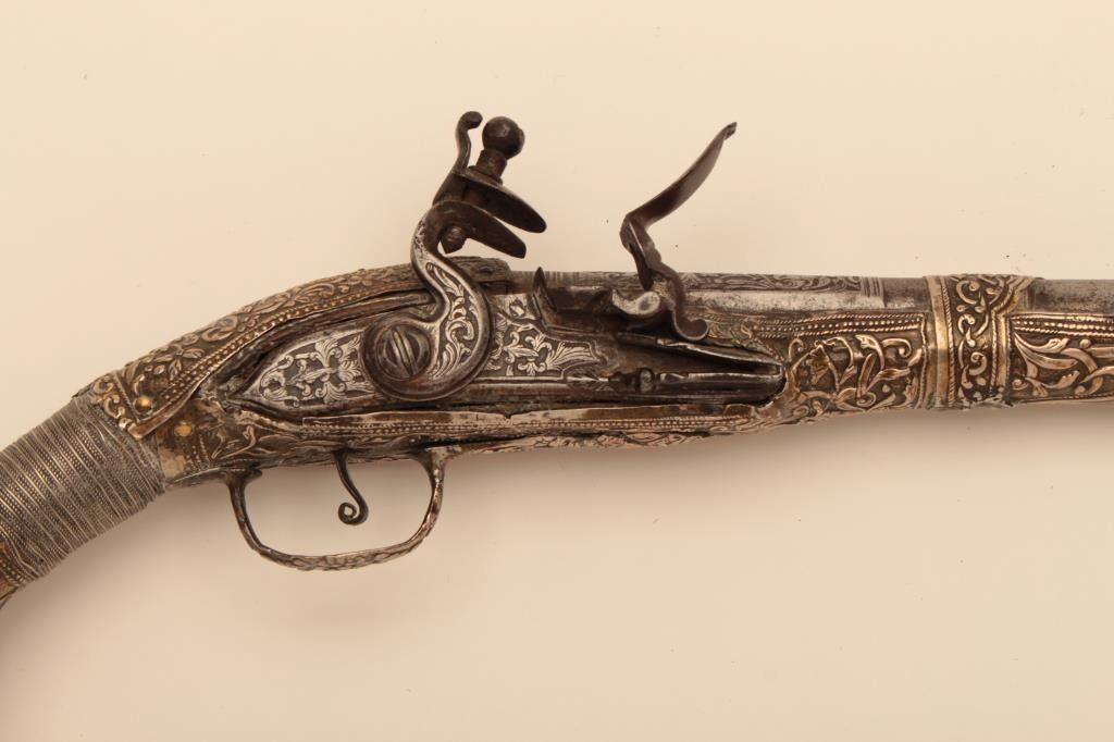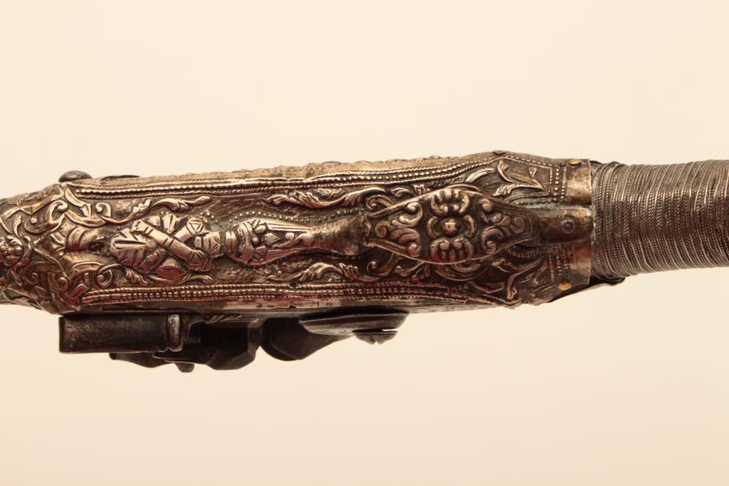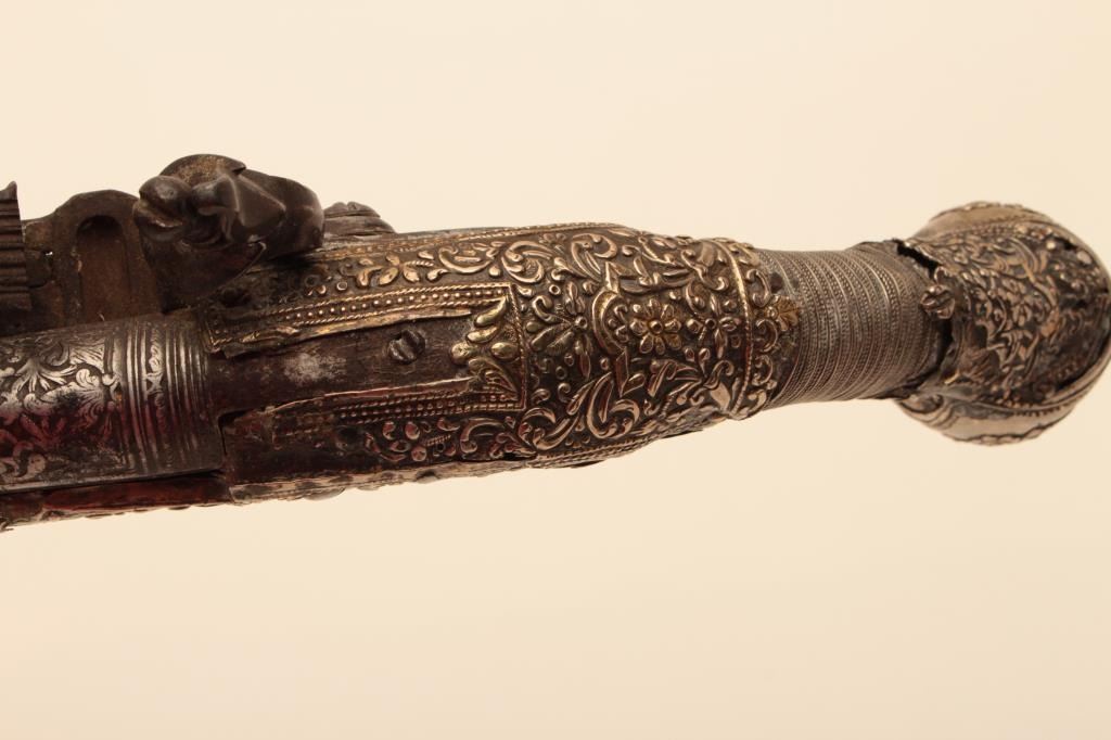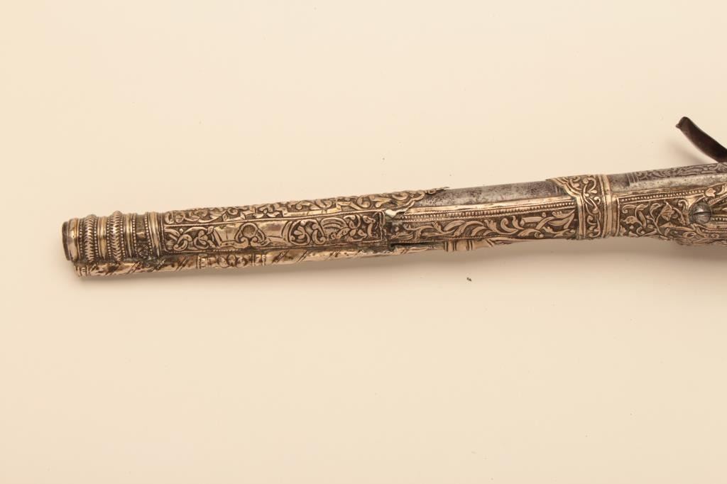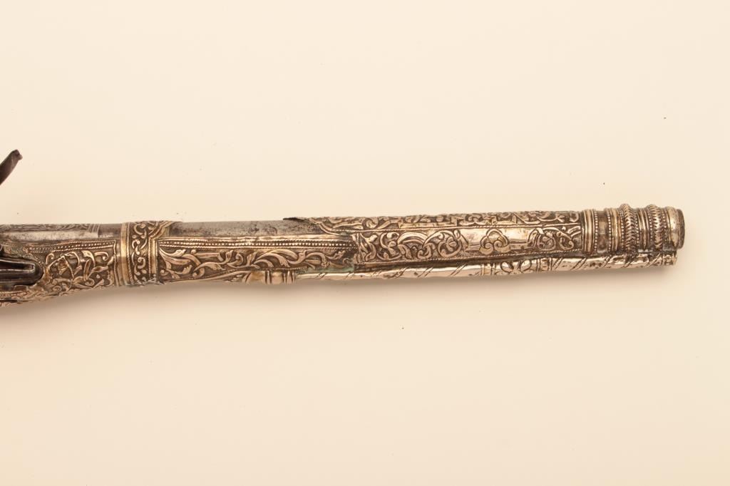 Pair of ornate and high quality silver stocked Chieftains pistols with Ottoman (Turk) silver maker’s marks in the stocks. Measures 21 ½” overall with 14 ¾” barrels of .62 caliber smoothbore. The locks and barrels are deeply engraved in a scroll motif. The stocks are nicely cast and chiseled with wire wrap to wrists. The condition is very good plus with minor damage to the silver and slight aging. A much better set of higherquality than normally found. (Antique) Est.: $2000-$4000