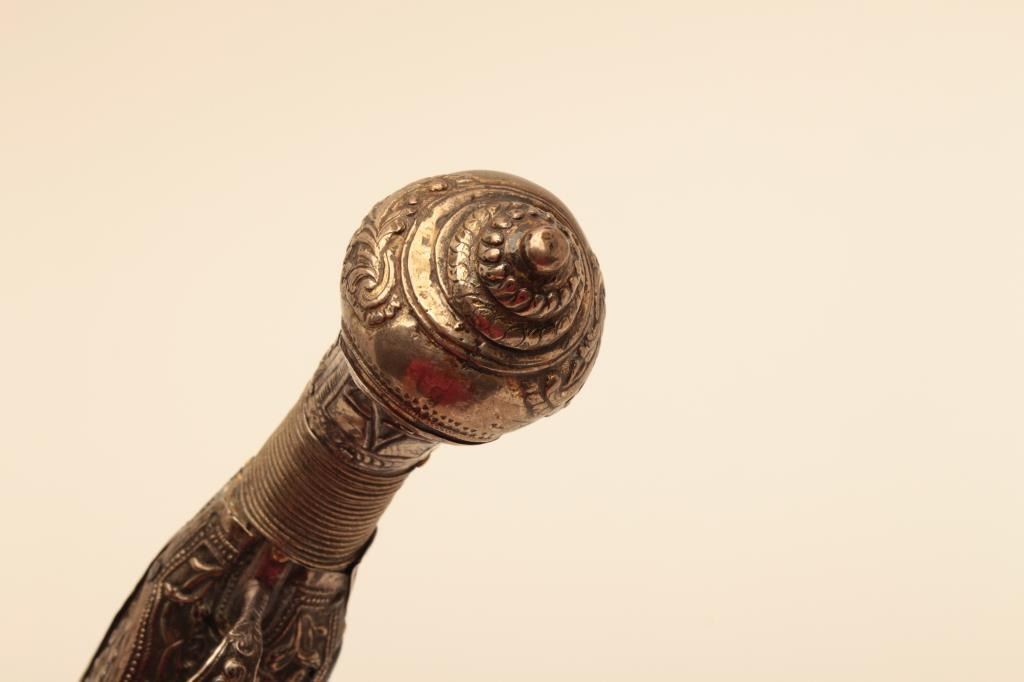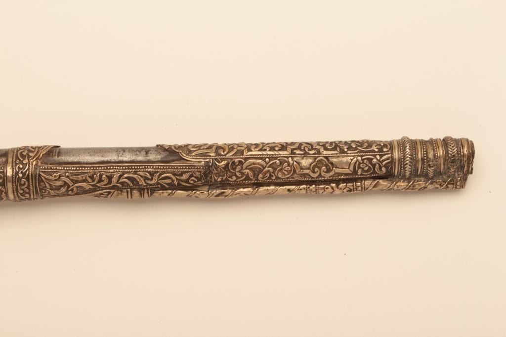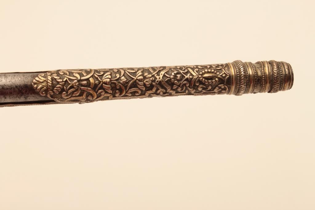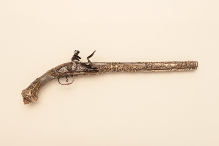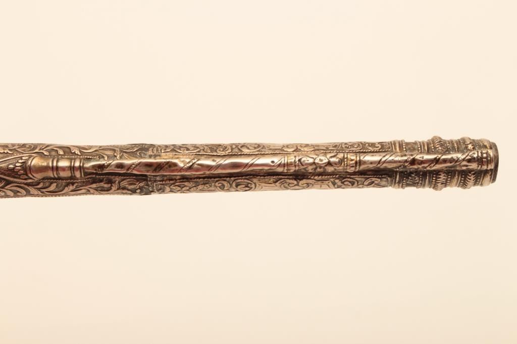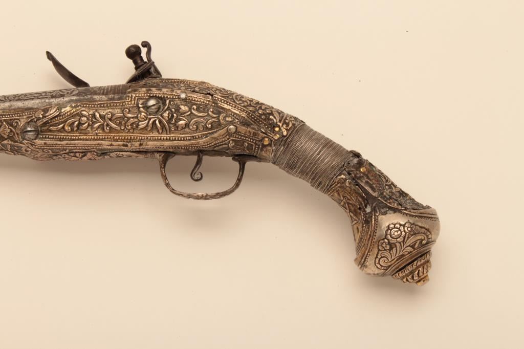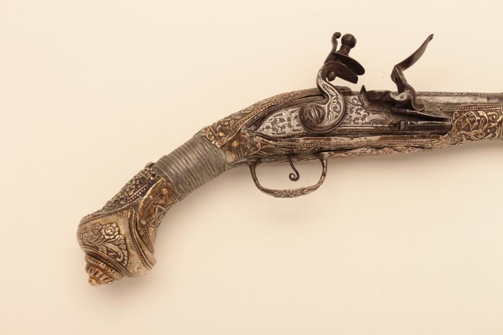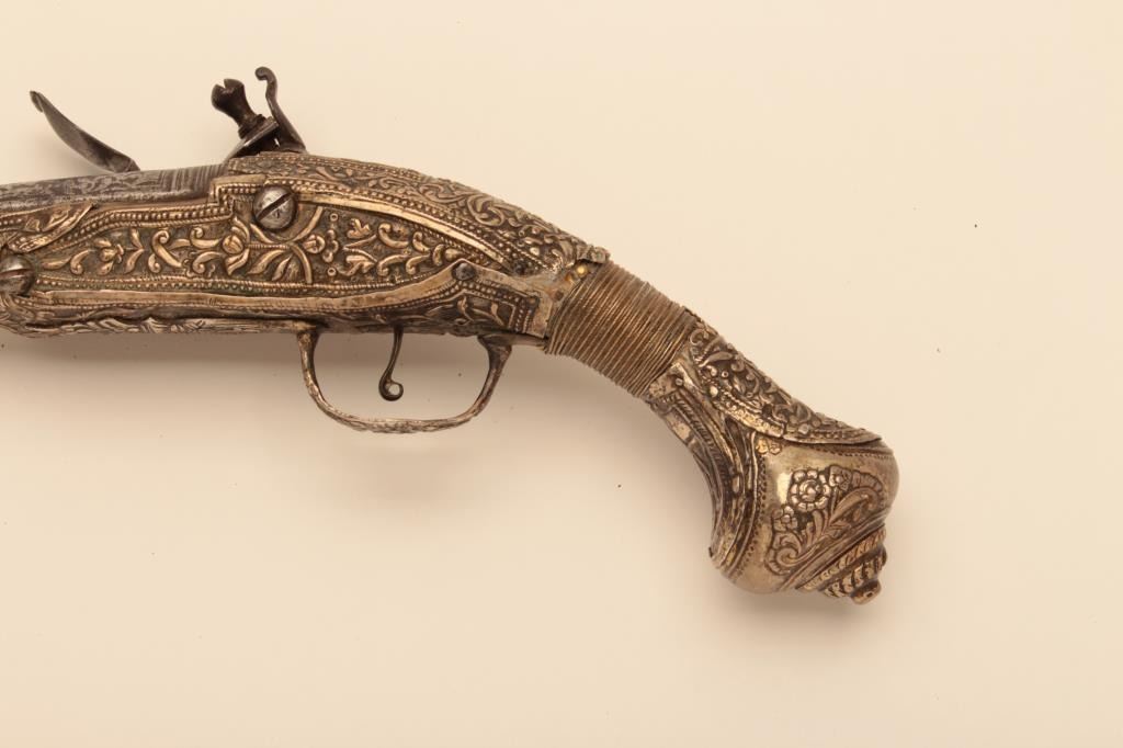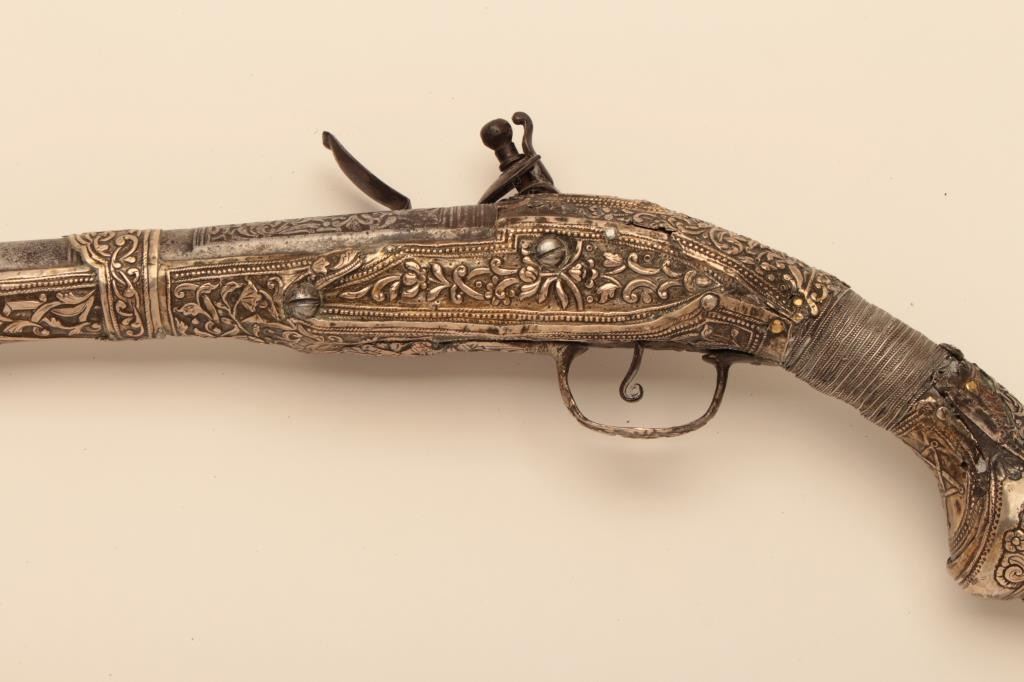 Pair of ornate and high quality silver stocked Chieftains pistols with Ottoman (Turk) silver maker’s marks in the stocks. Measures 21 ½” overall with 14 ¾” barrels of .62 caliber smoothbore. The locks and barrels are deeply engraved in a scroll motif. The stocks are nicely cast and chiseled with wire wrap to wrists. The condition is very good plus with minor damage to the silver and slight aging. A much better set of higherquality than normally found. (Antique) Est.: $2000-$4000