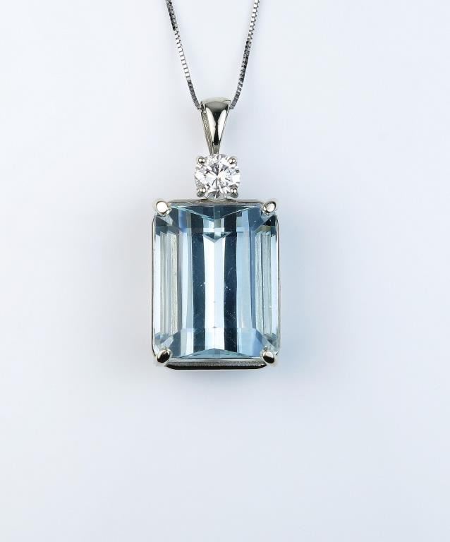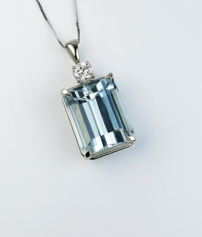 Beautiful Aquamarine and Diamond pendant featuring a large 20.21 carat VS quality emerald cut Aquamarine accented with a 0.58 carat round cut Diamond with F-G colors and SI clarity set in 14 karat white gold custommade setting. Full Appraised Value $21,000.00 Estimates $4,000-$6,000