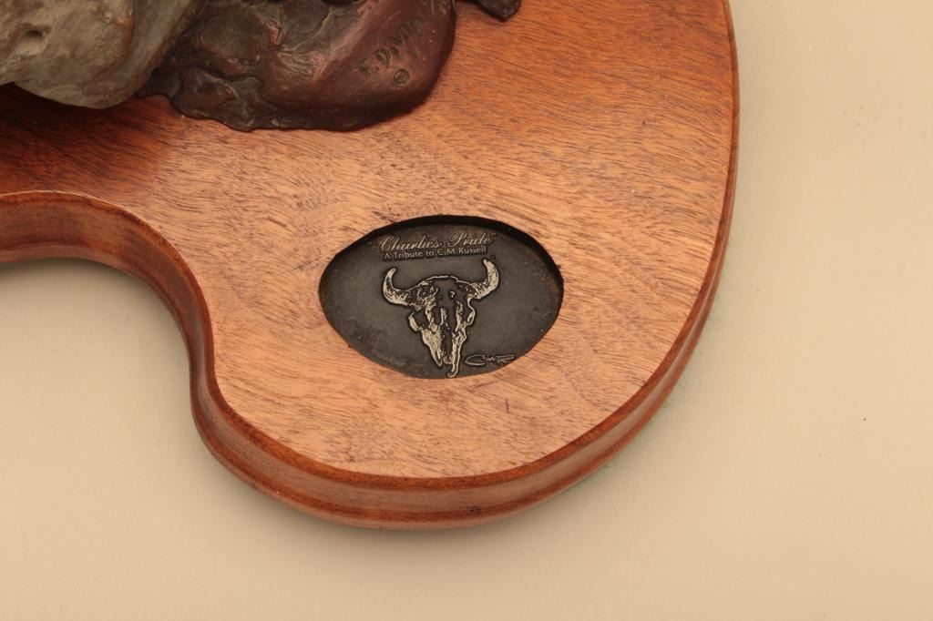 Tribute to Charlie Russel bronze sculpture signed F. Divitt and #13/35.Measures approximately 9” x 15 ½” bronze only. On 1 ½” thick wood base. Polychrome and colored. A well-executed art work. Gallery price at$3200. Est.: $900-$1800