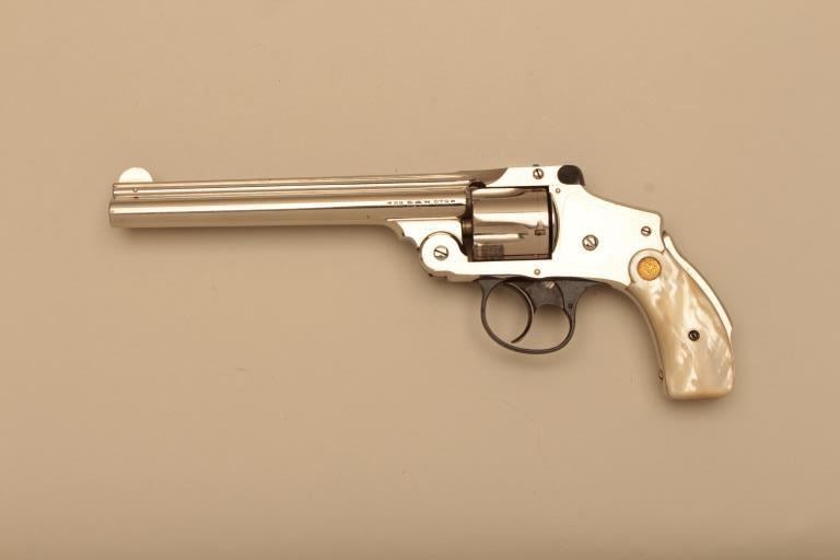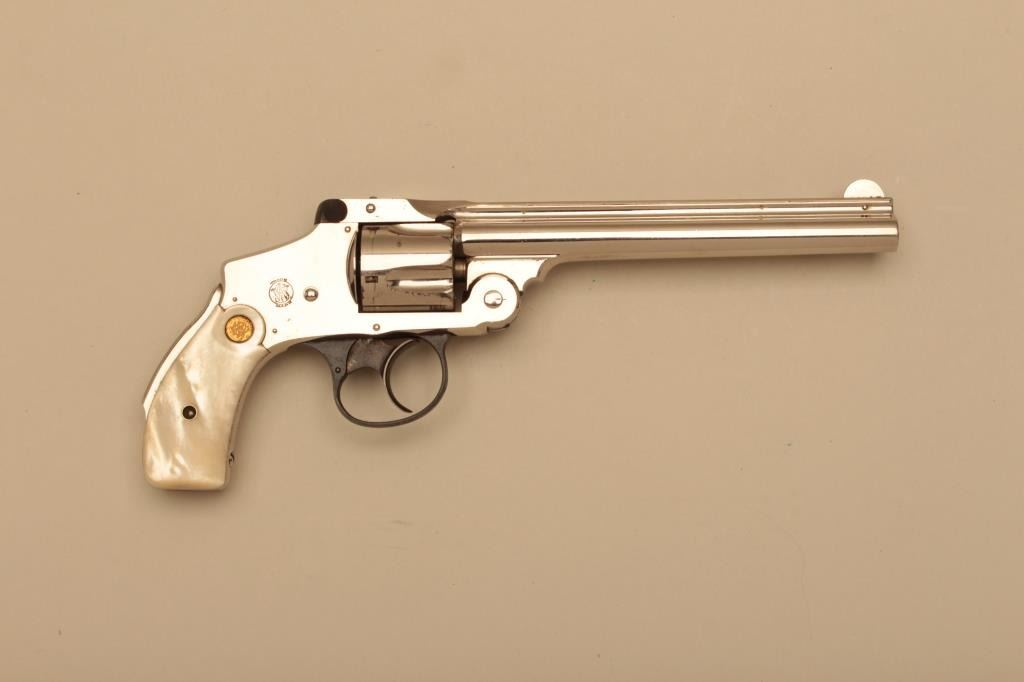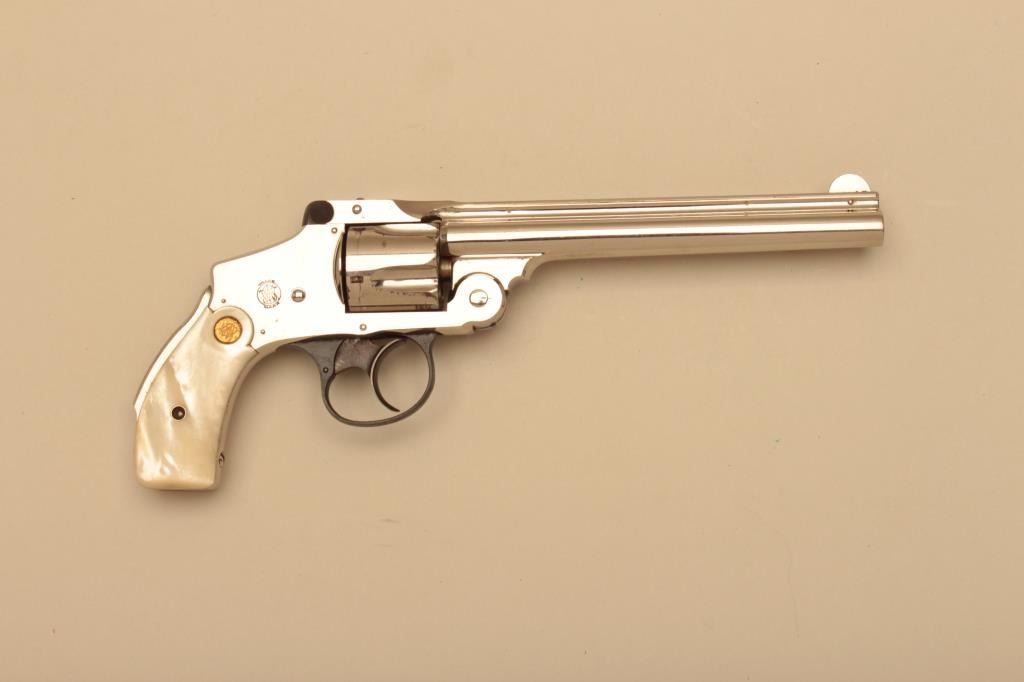 Smith & Wesson 38 Safety Fourth Model DA revolver, .38 S&W caliber, scarce 6” barrel, nickel finish, Smith & Wesson gold medallion pearl grips, S/N 179626; overall fine to near excellent condition with majority oforiginal finish remaining except several areas on the cylinder, fine bore, action, markings and grips. (C&R). Est.: $700-$1,400.