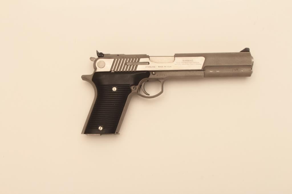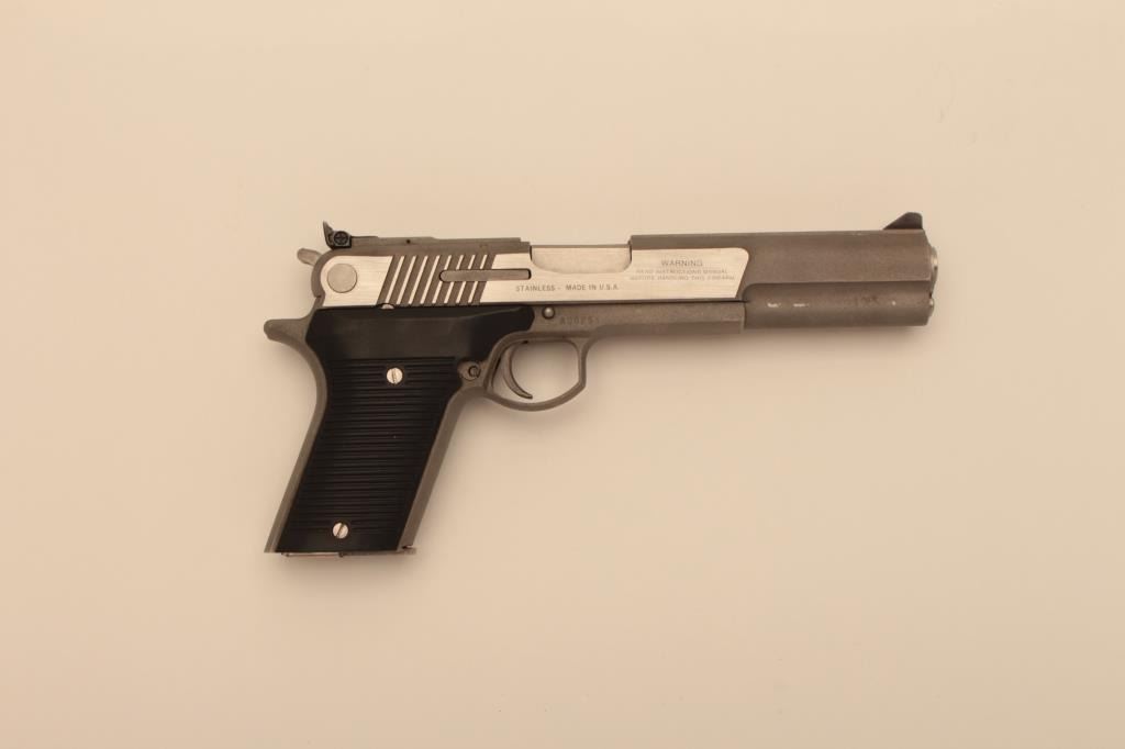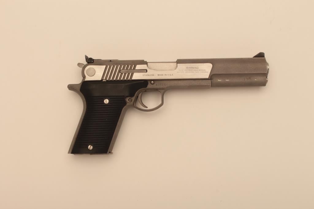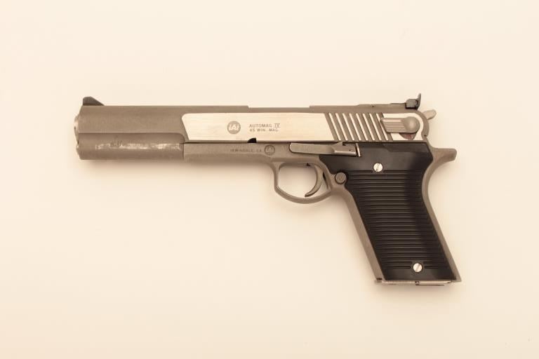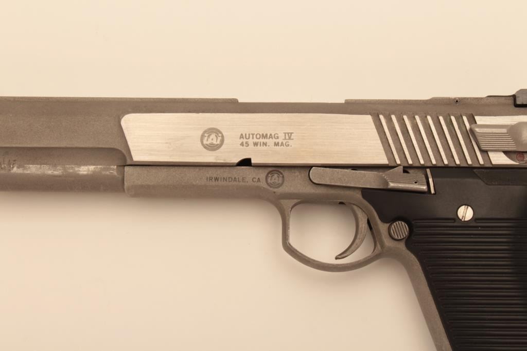 Automag IV (Irwindale, CA.) semi-automatic pistol, .45 Win. Mag. caliber, 6.5 barrel, stainless, hard plastic grips, S/N A00254; overall fine condition with fine bore, crisp action and markings, fine grips.(Modern/NO CAL. SALE). Est.: $700-$1,400.