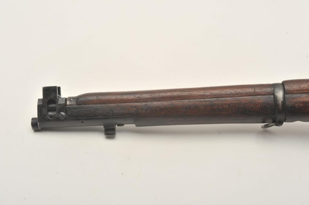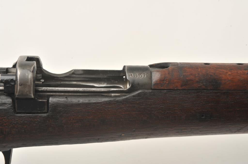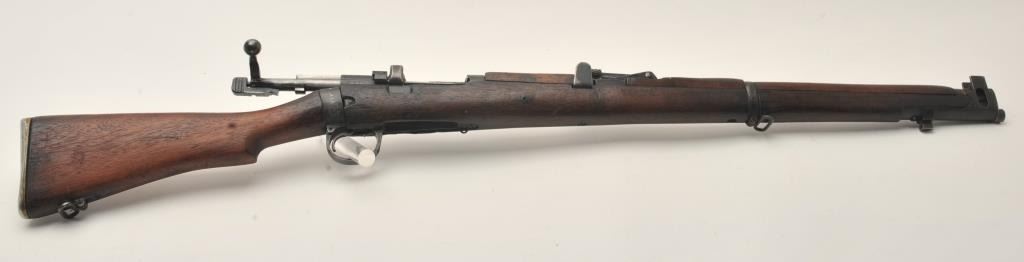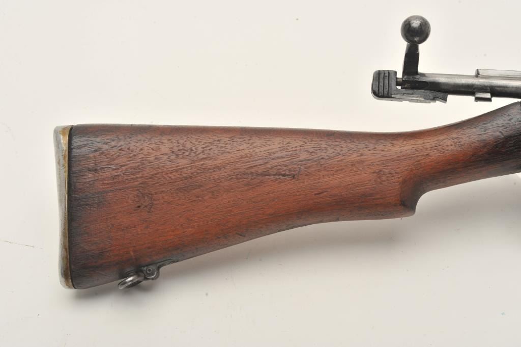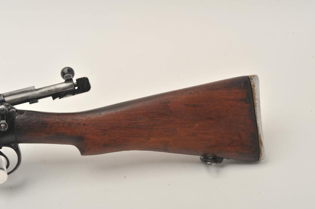 Indian Ishapore Enfield bolt action rifle, .308 caliber, Serial #H6579. The rifle is in good overall condition with a 25” barrel with a blade front and military style tangent rear sights. The metal surfaces retain asignificant amount of their military finish showing moderate to heavy wear, with the bolt having been painted black during the period of use. The full-length wood stock is in fair condition showing heavy use with oilsoaked areas and bruising. The trigger guard is dated 1966 and the rear sight 1959. The bore is fair, the action functions and markings are legible. The lot does not include a magazine. Est.: $250-$500.(C+R).