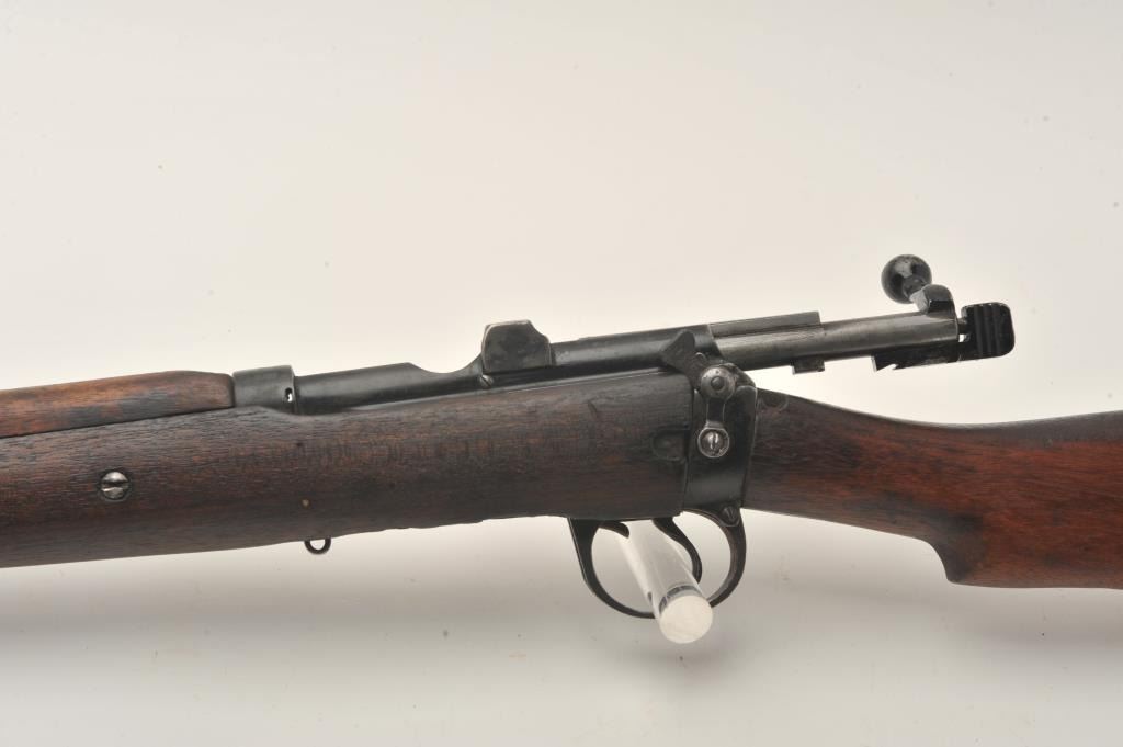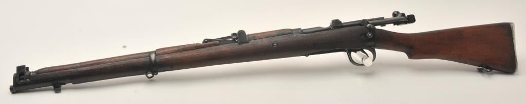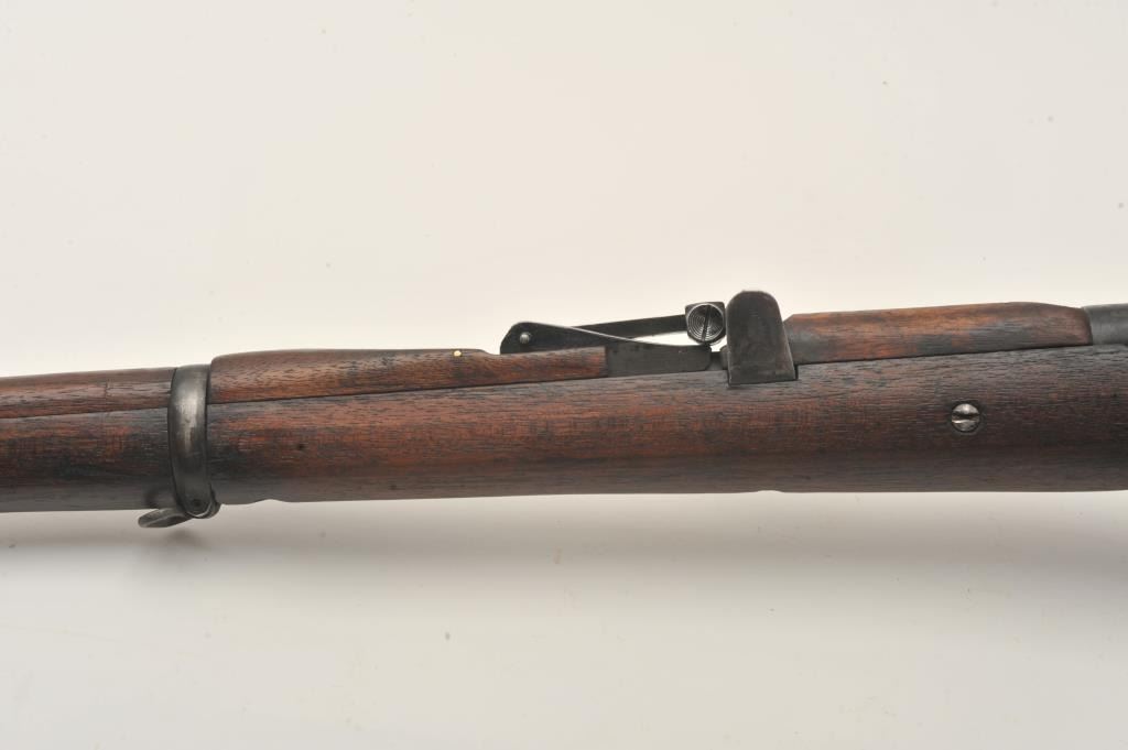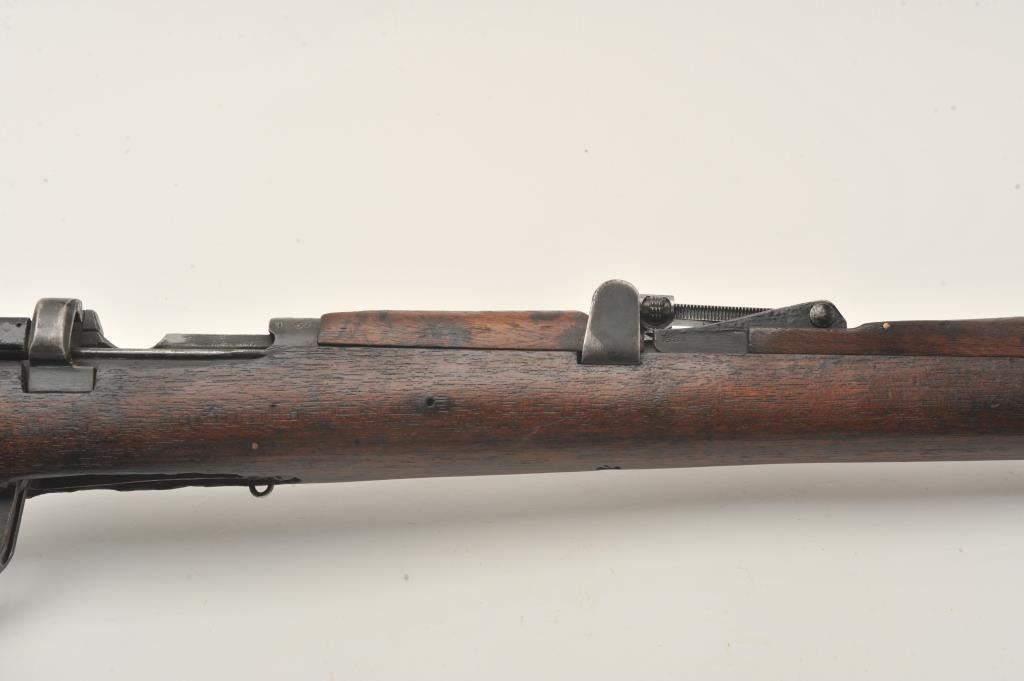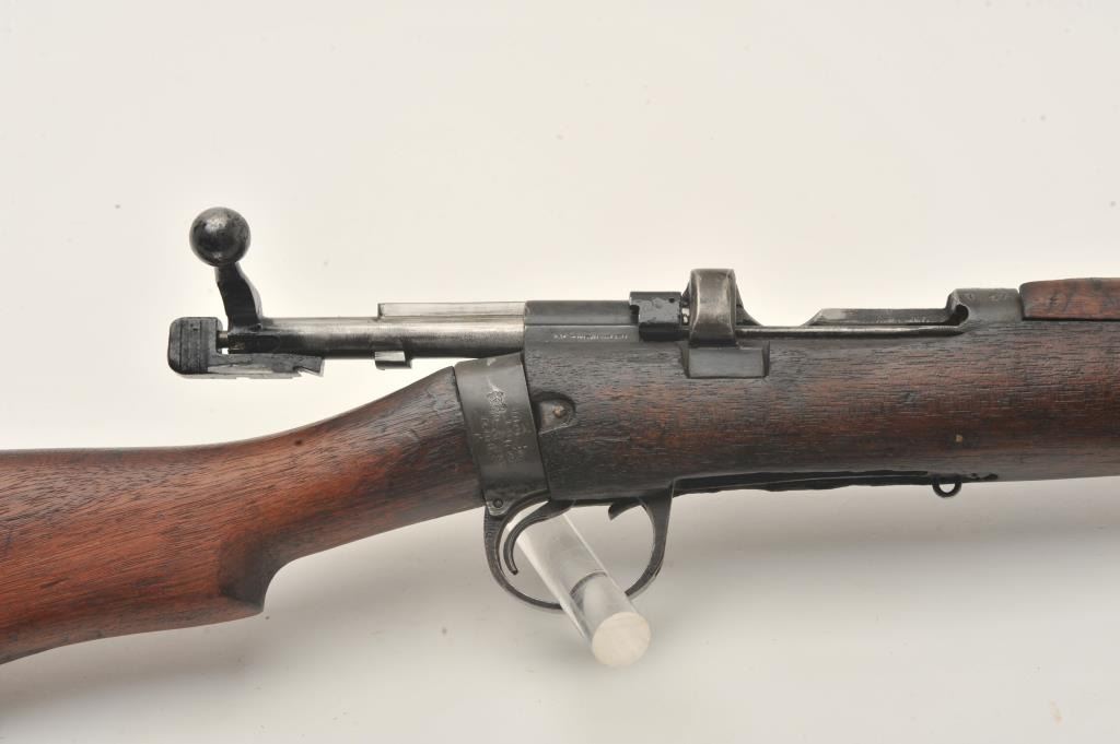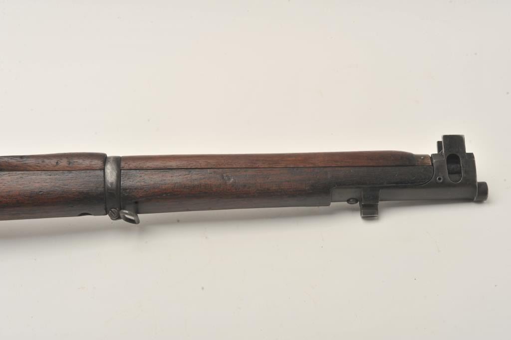 Indian Ishapore Enfield bolt action rifle, .308 caliber, Serial #H6579. The rifle is in good overall condition with a 25” barrel with a blade front and military style tangent rear sights. The metal surfaces retain asignificant amount of their military finish showing moderate to heavy wear, with the bolt having been painted black during the period of use. The full-length wood stock is in fair condition showing heavy use with oilsoaked areas and bruising. The trigger guard is dated 1966 and the rear sight 1959. The bore is fair, the action functions and markings are legible. The lot does not include a magazine. Est.: $250-$500.(C+R).