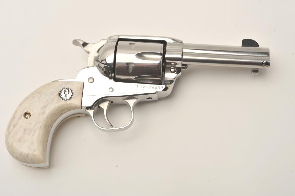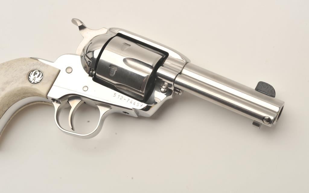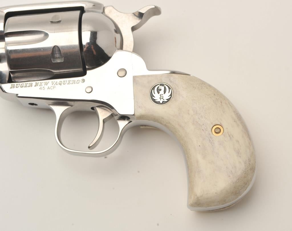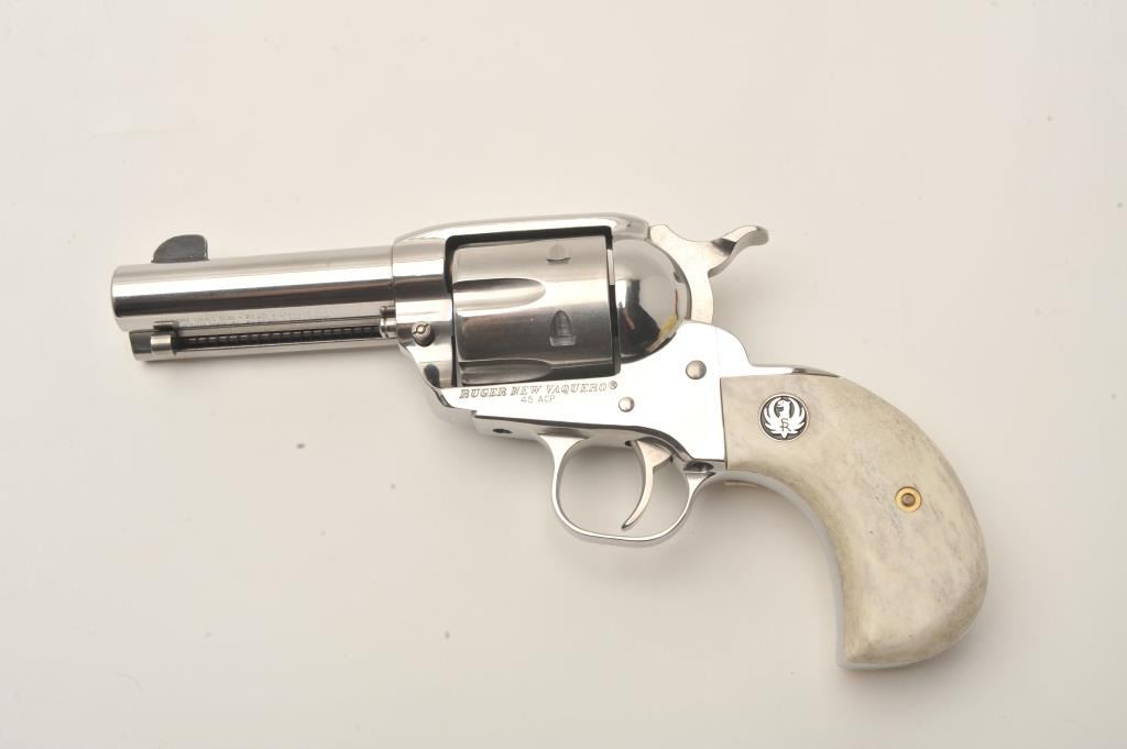 Ruger Vaquero revolver, .45 ACP caliber, Serial #512-74459. The pistol is as new in the box with a 3 5/8” barrel. The metal surfaces retain nearly all of their polished nickel finish with only light handling marks. The front sight has been painted black for increased visibility. The medallion bird’s head grips are custom stag and in very good condition. The lot includes an additional set of black, laminated wood grips as well.The pistol comes in the factory plastic hard case with all associated packaging materials, manuals etc. The bore is very good, the action crisp and markings are sharp on this lightly used Ruger. $300-$600. (Modern/PPT).