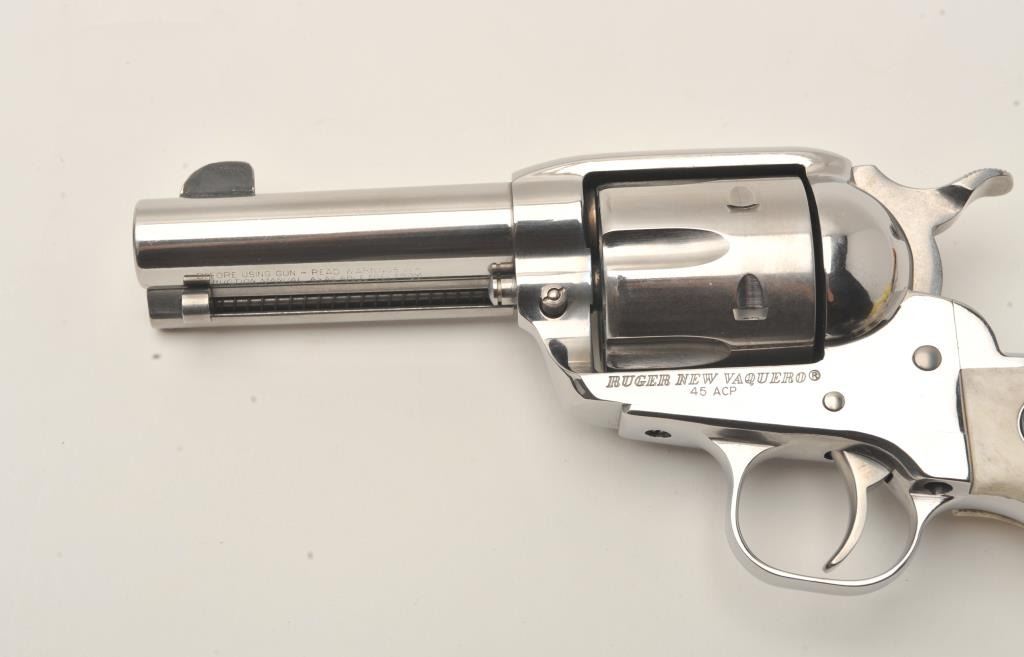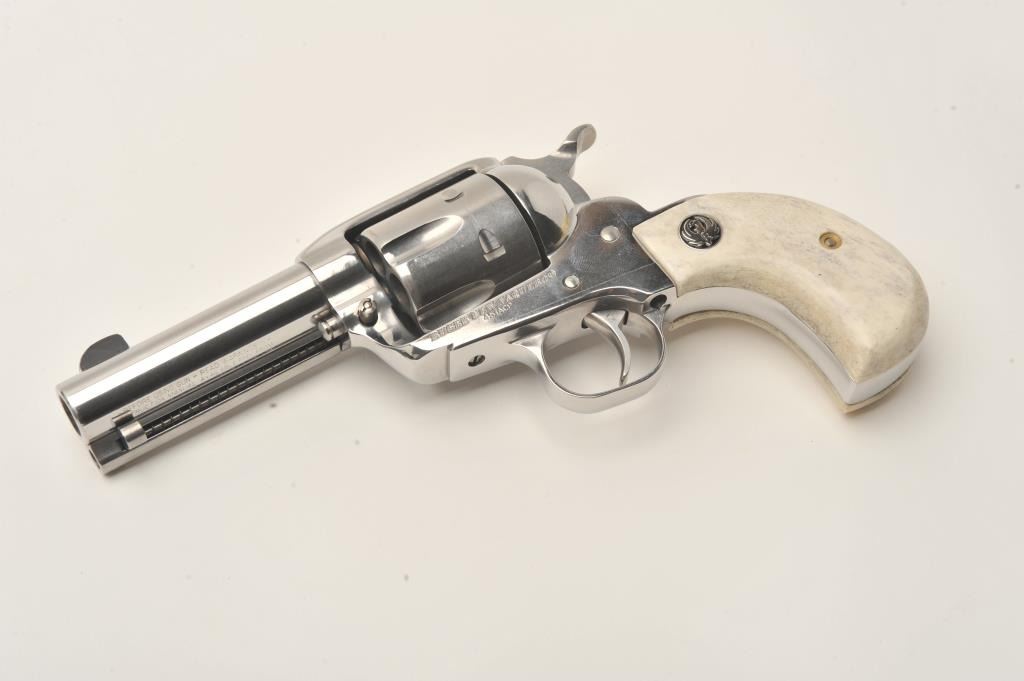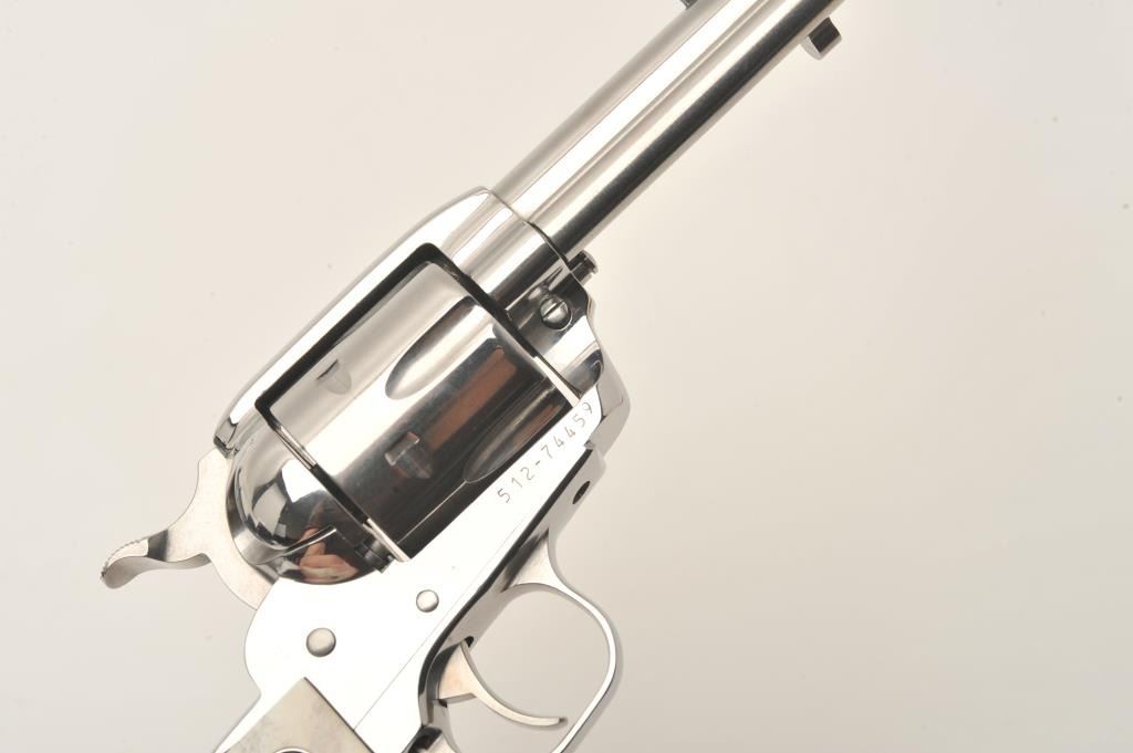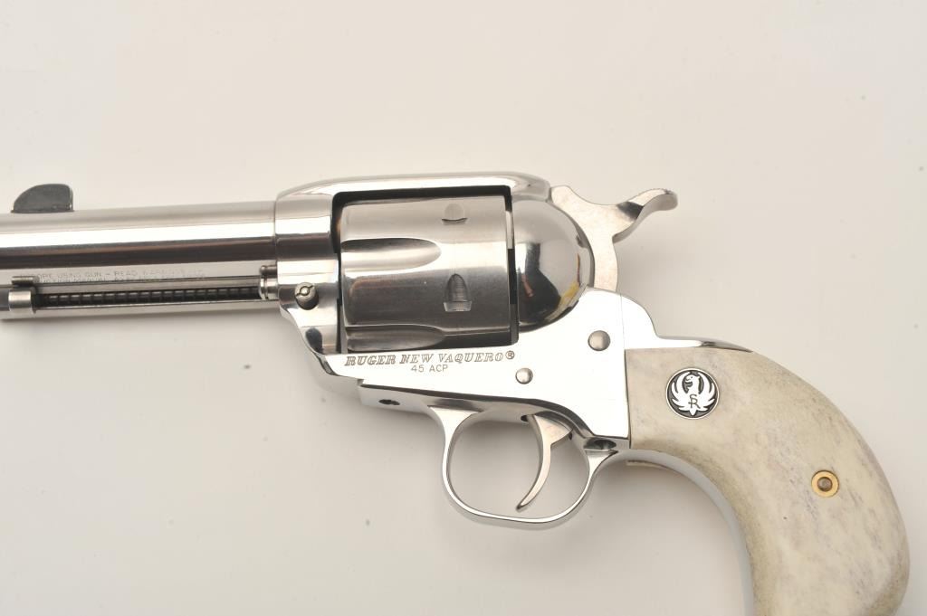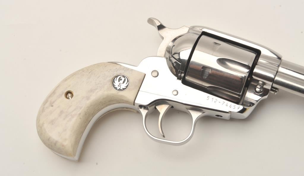 Ruger Vaquero revolver, .45 ACP caliber, Serial #512-74459. The pistol is as new in the box with a 3 5/8” barrel. The metal surfaces retain nearly all of their polished nickel finish with only light handling marks. The front sight has been painted black for increased visibility. The medallion bird’s head grips are custom stag and in very good condition. The lot includes an additional set of black, laminated wood grips as well.The pistol comes in the factory plastic hard case with all associated packaging materials, manuals etc. The bore is very good, the action crisp and markings are sharp on this lightly used Ruger. $300-$600. (Modern/PPT).