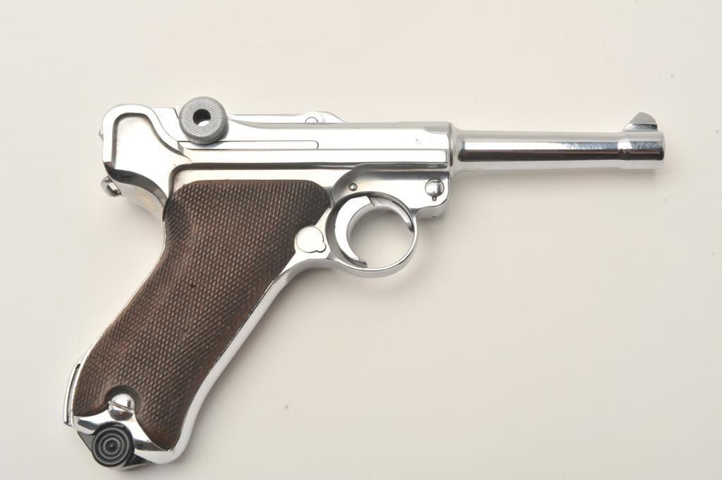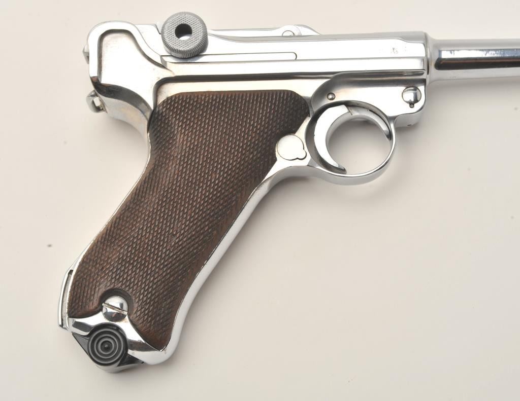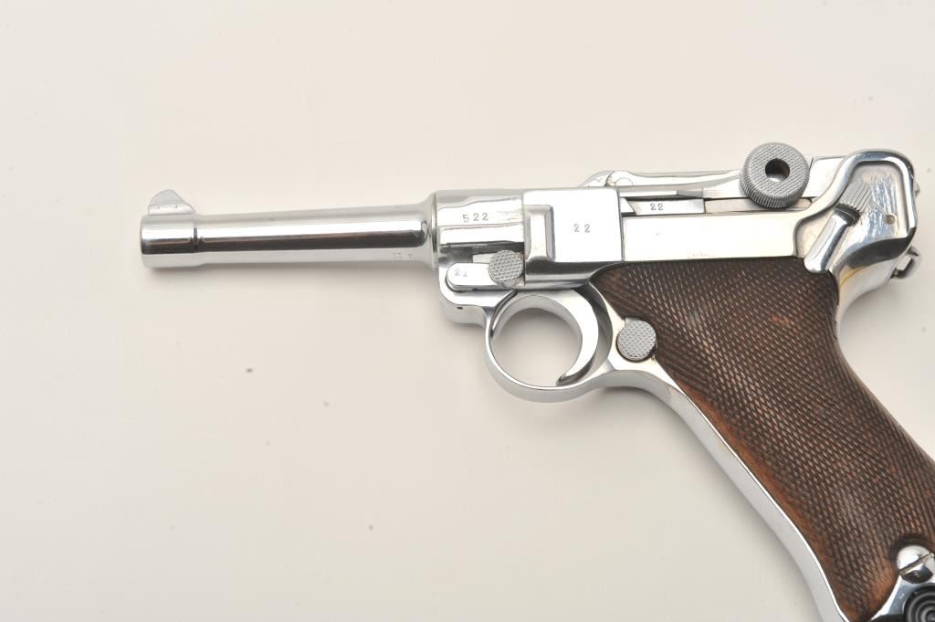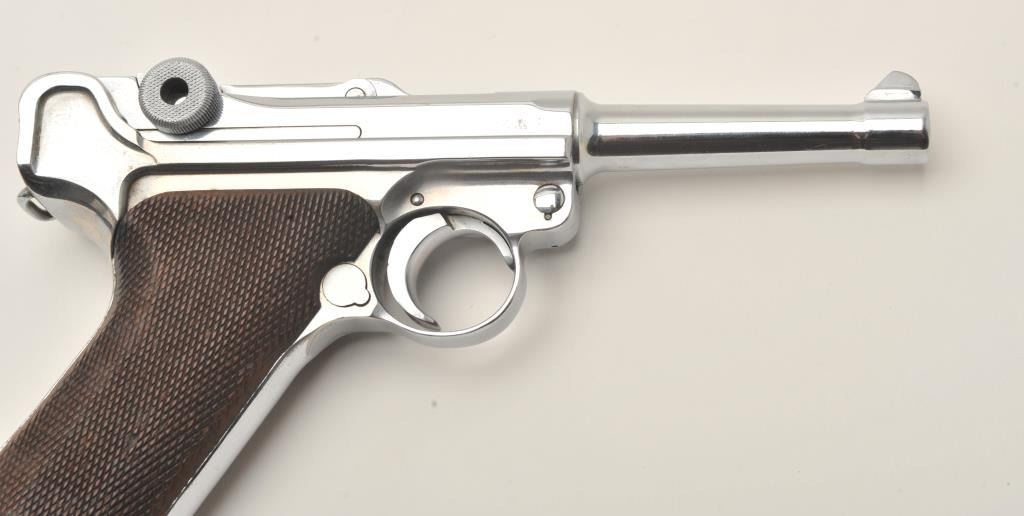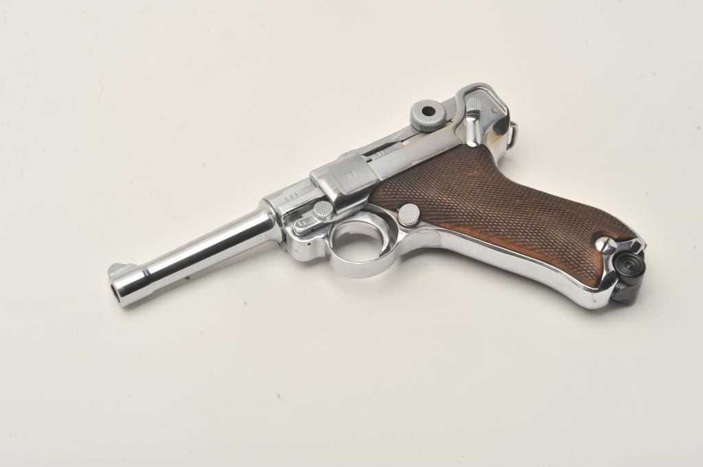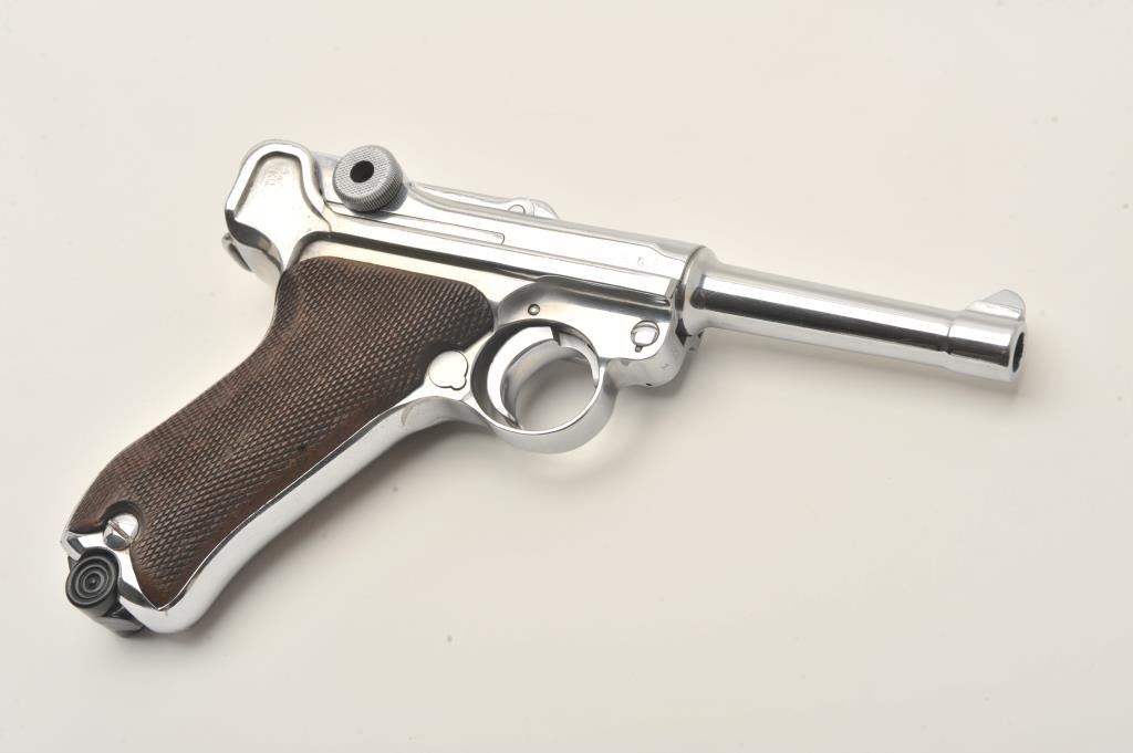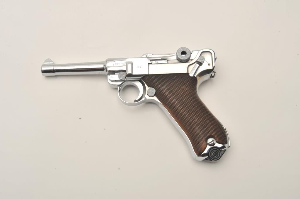 German Luger dated 1939, 9mm caliber, Serial #522. The pistol is in good overall condition as re-finished in nickel. All visible serial numbers are matching with Nazi proofs on the right side of the frame. Thecheckered wood grips are in good condition with some flattening of checkering. The bore is good, the action functions and the markings are legible. The lot includes one correct, after –market magazine. Est.:$300-$600. (C+R/PPT).