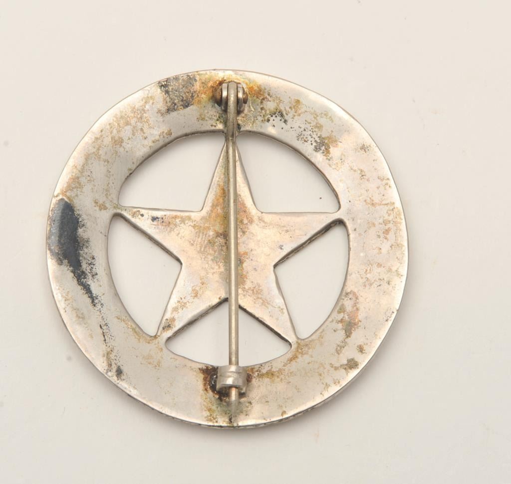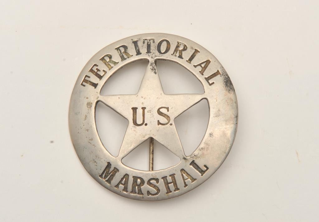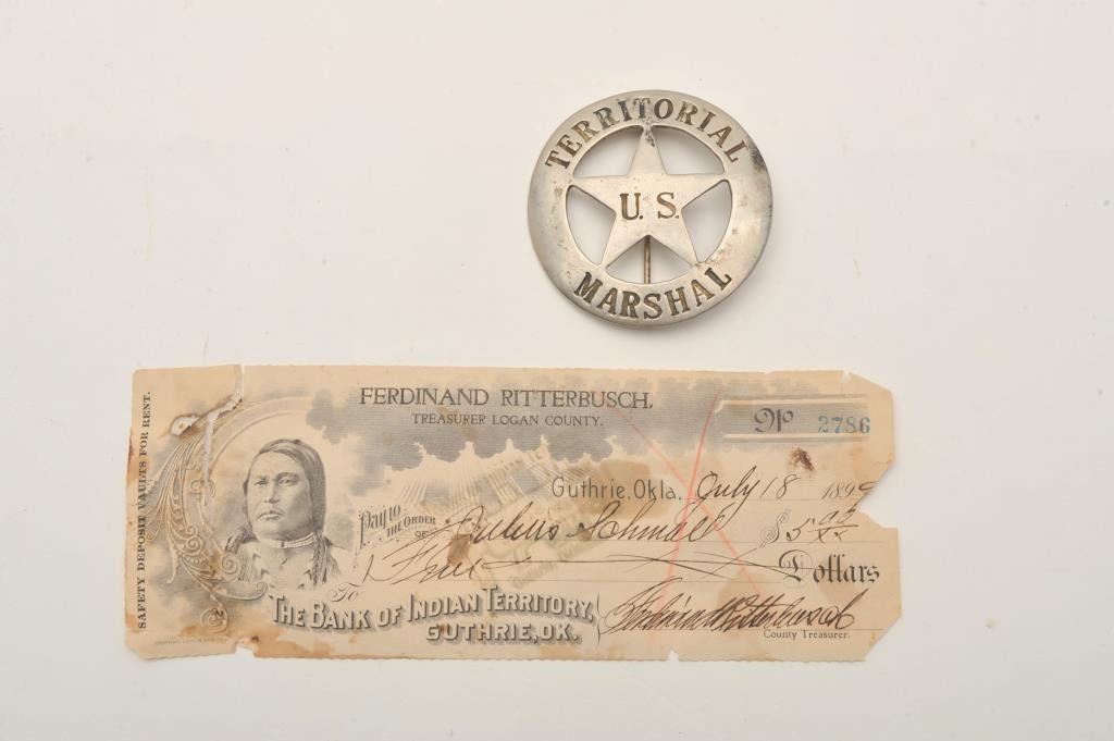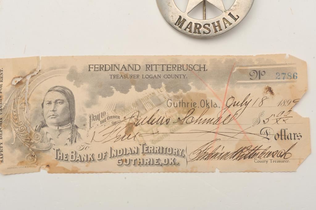 Circular cut out 5 point star badge stamped Territorial U.S. Marshal, 2.75” in diameter, no visible hallmark on reverse; accompanied with an 1890’s check for $5 made out to Julius Schmall by the County Treasurer ofLogan Co. in Guthrie, Okla. Drawn on the Bank of Indian Territory. Est.: $500-$1,000+++.