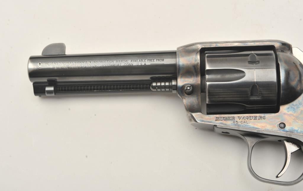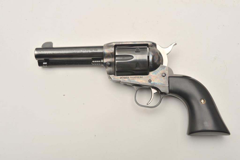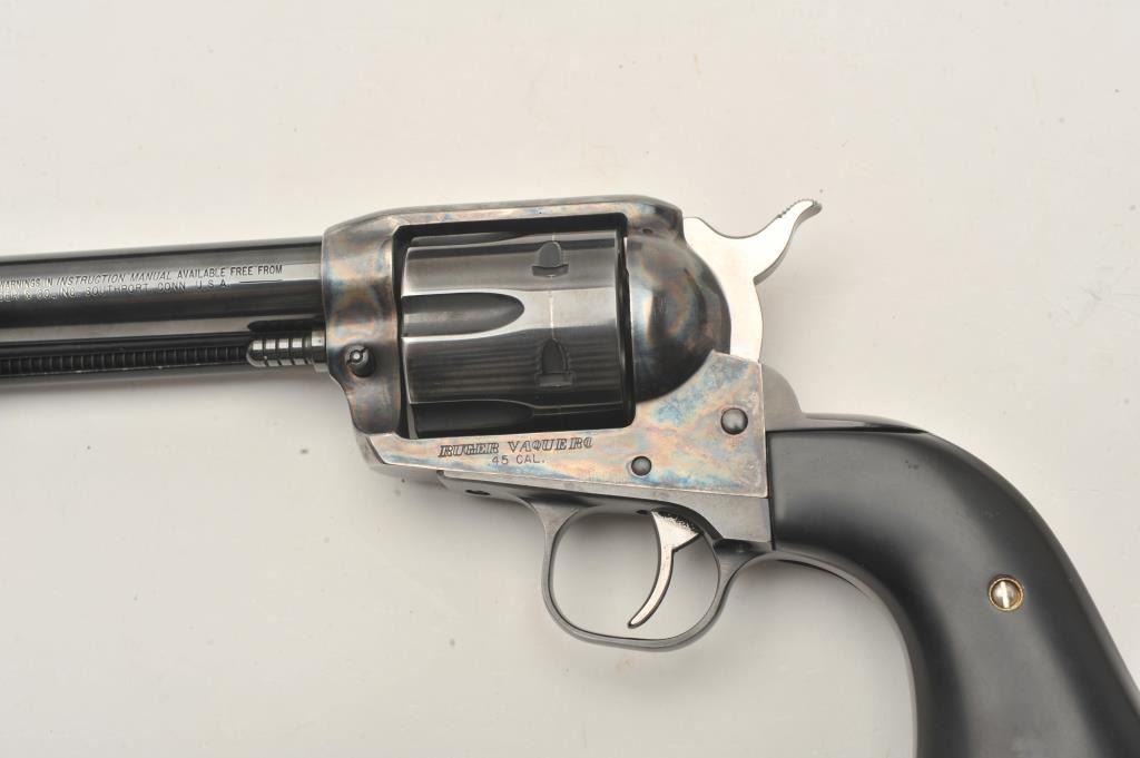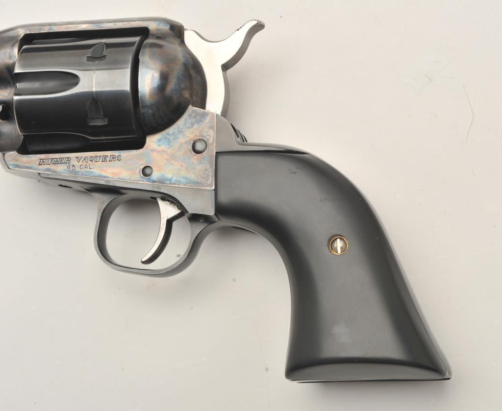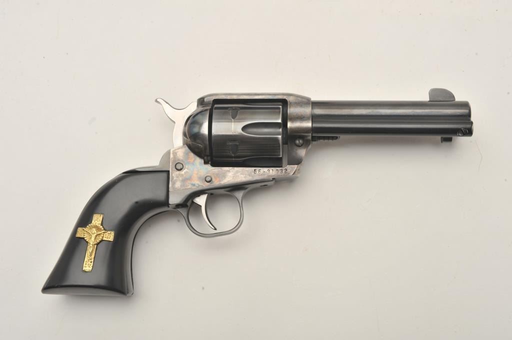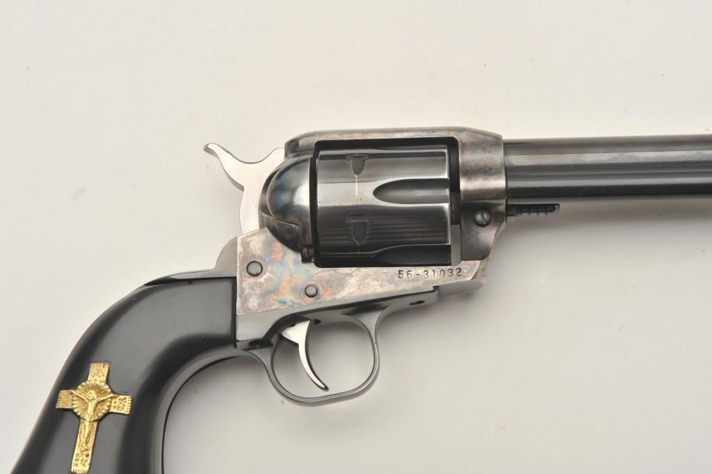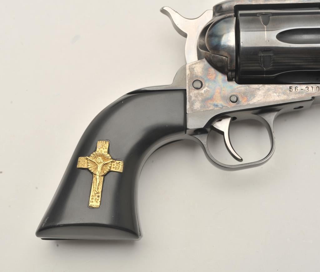 Ruger New Vaquero revolver, .45 caliber, Serial #56-31032. The pistol is in fine overall condition with a 4 5/8” barrel. The metal surfaces retain nearly all of their blue finish with wear at the muzzle and adrag line on the cylinder. The custom smooth ebony grips are in very good condition with a gold tone crucifix inlayed into the right panel. The lot includes the factory plastic hard case and all associatedpackaging materials. The bore is good, the action crisp and markings are sharp on this Ruger. See lot #314 for another Vaquero with the, “3:10 to Yuma” grip treatment. Est.: $300-$600. (Modern/PPT).