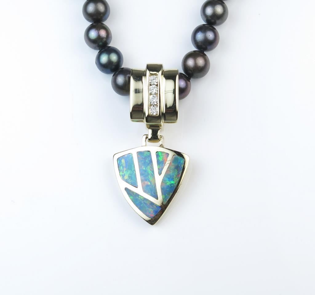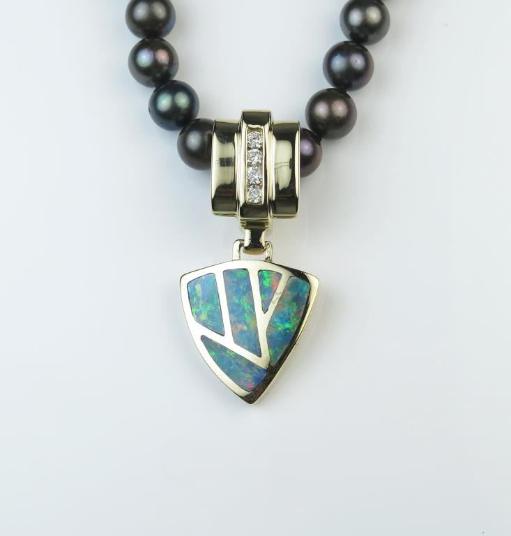 Magnificent fine Black Opal and Diamond pendant with luxurious strand of approx. 6.50 mm Black Pearls with 14 karat gold clasp. Pendant is artisan crafted and stamped in 14 karat yellow gold and accented with 4 roundDiamonds. Quality collection piece. Retail $3,500-$4,000 Estimates $2,000-$3,000