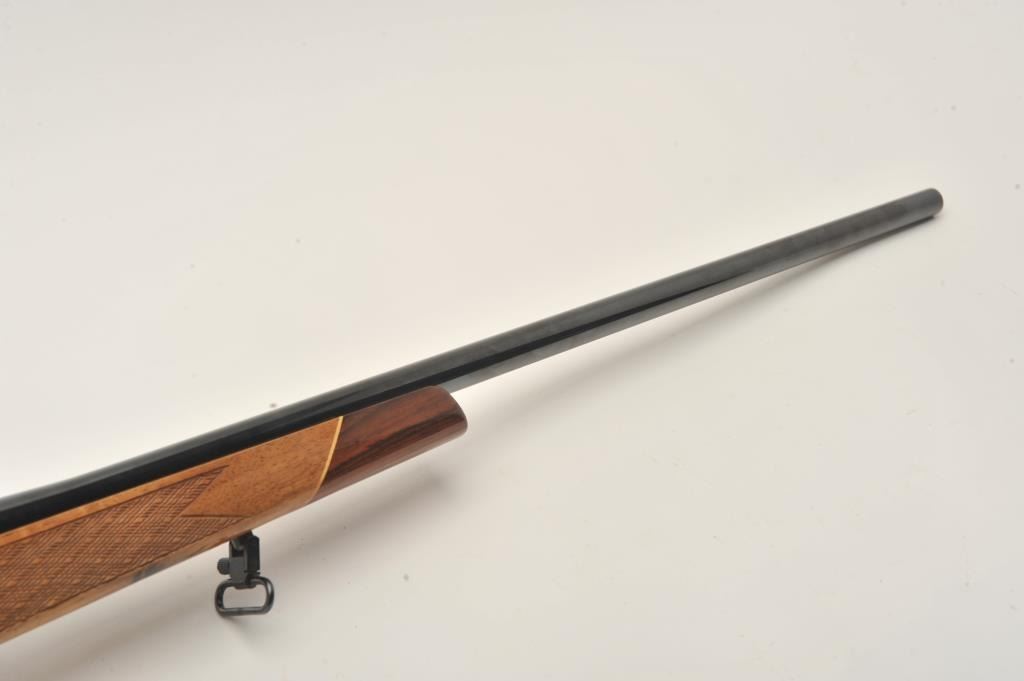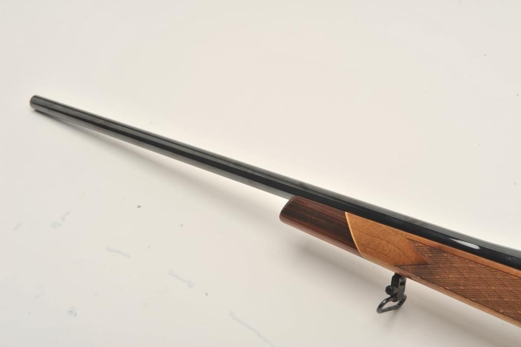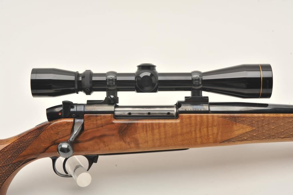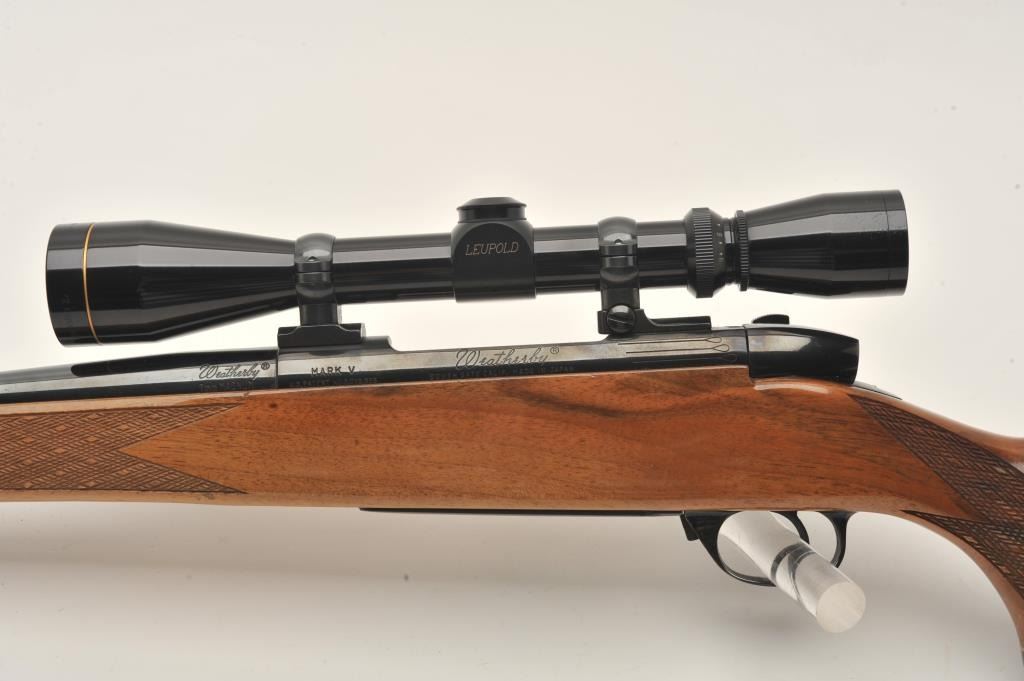 Weatherby Mark V bolt action rifle, 7 mm Remington Magnum caliber, Serial #H130709. The rifle is in fine overall condition with a 26” barrel. The metal surfaces retain nearly all of their high polish blue finishwith light handling marks and faint muzzle wear noted. The receiver is marked South Gate and made in Japan. The finely checkered wood stock is in very good condition with sharp checkering, Rosewood grip cap andforend, ending with a ventilated rubber butt pad providing a 13 ½” LOP. The rifle is topped with Leupold two-piece mounts and a Leupold Vari-X II variable power 3 x 9 rifle scope with clear, crisp optics. The bore isvery good, the action is crisp and markings are sharp on this desirable South Gate Weatherby. Est.: $750-$1,500. (Modern).