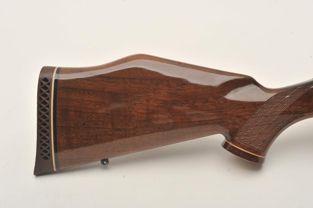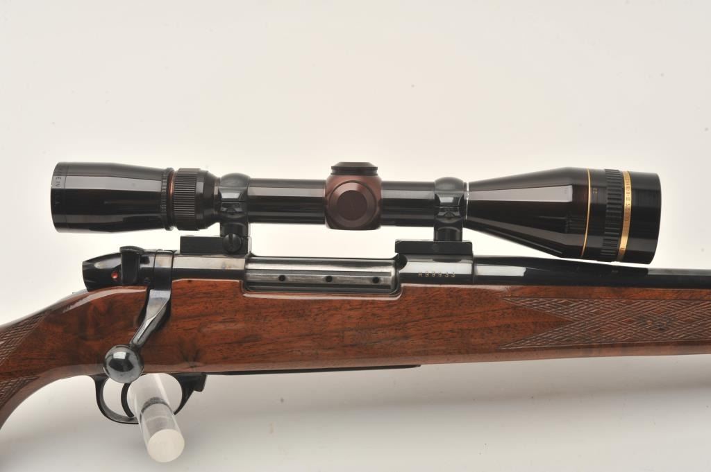 Weatherby Mark V bolt action rifle, 7 mm Remington Magnum caliber, Serial #H99933. The rifle is in fine overall condition with a 24” barrel. The metal surfaces retain nearly all of their high polish blue finishwith light handling marks noted. The receiver is marked South Gate and made in Japan. The finely checkered wood stock is in fine condition with sharp checkering, Rosewood grip cap and forend, ending with aventilated rubber butt pad providing a 13 3/8” LOP. The rifle is topped with Redfield two-piece mounts and a Leupold Vari-X III variable power 3.5 x 10 rifle scope with clear, crisp optics. The bore is very good,the action is crisp and markings are sharp on this desirable, lightly used South Gate Weatherby. Est.: $750-$1,500. (Modern).