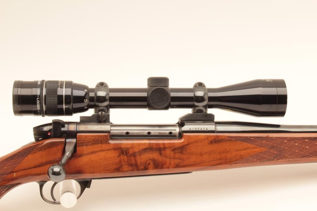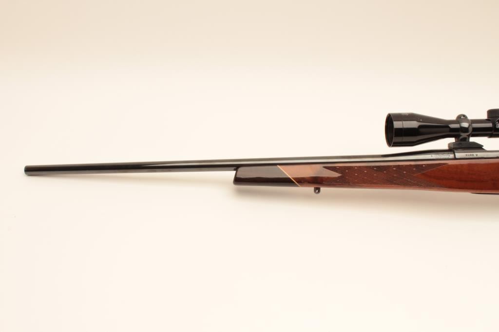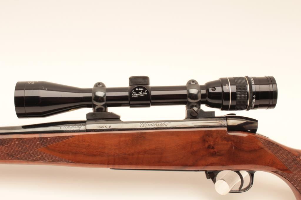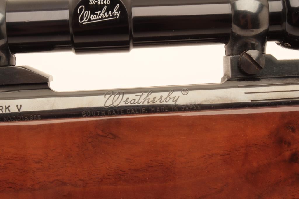 Weatherby Mark V bolt action rifle, .300 Magnum caliber, Serial #H127414. The rifle is in fine overall condition with a 24” barrel. The metal surfaces retain nearly all of their high polish blue finish with lighthandling marks and small mars noted. The receiver is marked South Gate and made in Japan. The finely checkered wood stock is in very good condition with sharp checkering, Ebony grip cap and forend, ending with aventilated rubber butt pad providing a 13 3/8” LOP. The rifle is topped with Buehler two-piece mounts and a Weatherby variable power 3 x 9 x 40 rifle scope with clear, crisp optics. The bore is very good, theaction is crisp and markings are sharp on this lightly used South Gate Weatherby. Est.: $750-$1,500. (Modern).