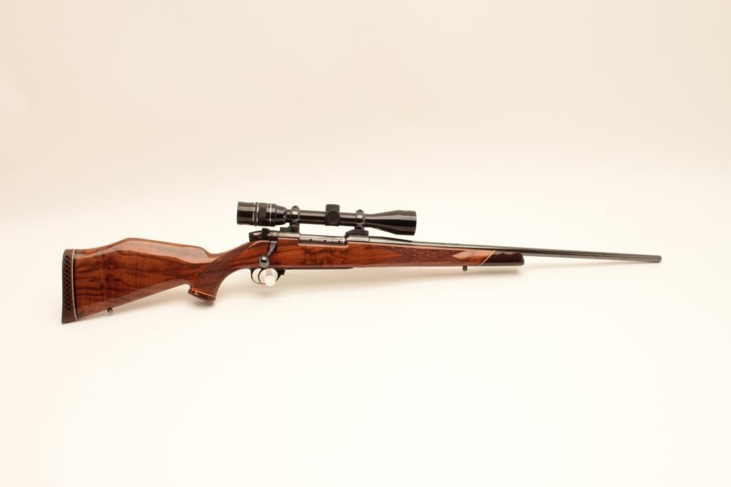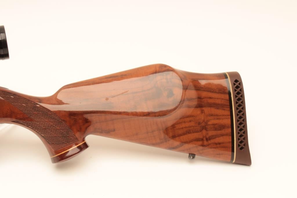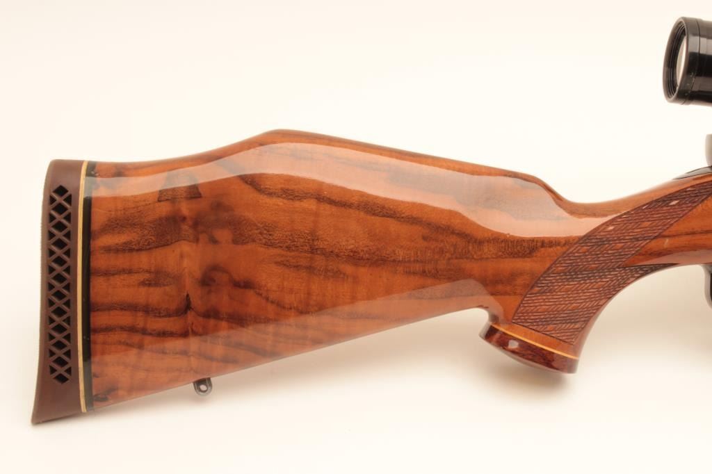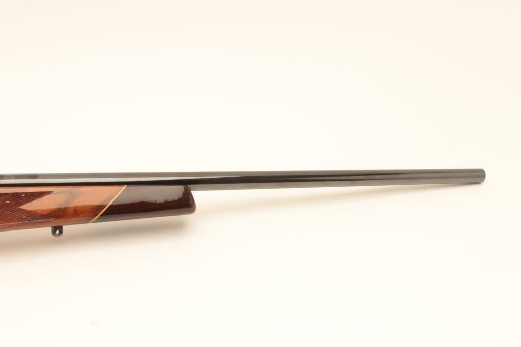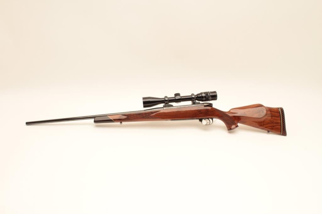 Weatherby Mark V bolt action rifle, .300 Magnum caliber, Serial #H127414. The rifle is in fine overall condition with a 24” barrel. The metal surfaces retain nearly all of their high polish blue finish with lighthandling marks and small mars noted. The receiver is marked South Gate and made in Japan. The finely checkered wood stock is in very good condition with sharp checkering, Ebony grip cap and forend, ending with aventilated rubber butt pad providing a 13 3/8” LOP. The rifle is topped with Buehler two-piece mounts and a Weatherby variable power 3 x 9 x 40 rifle scope with clear, crisp optics. The bore is very good, theaction is crisp and markings are sharp on this lightly used South Gate Weatherby. Est.: $750-$1,500. (Modern).