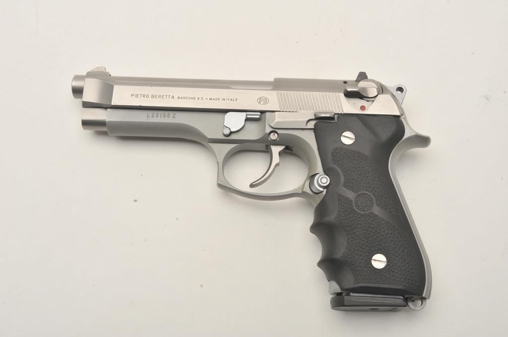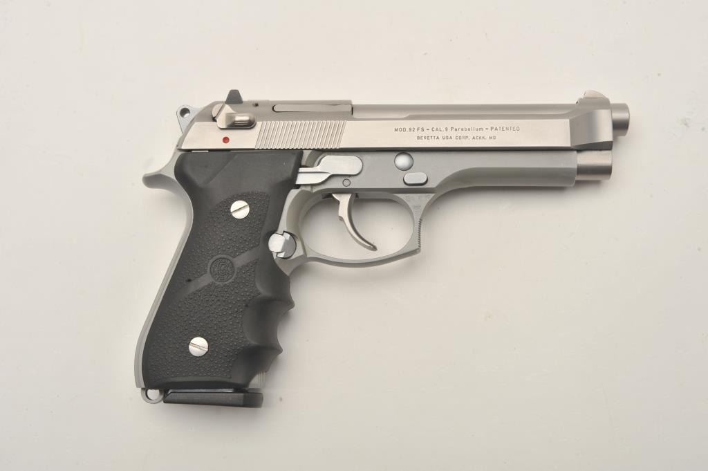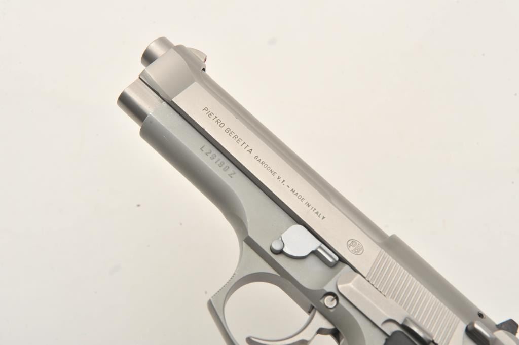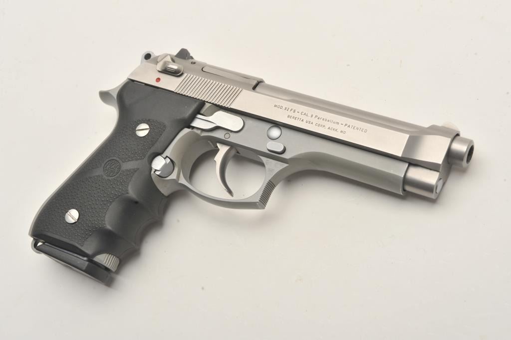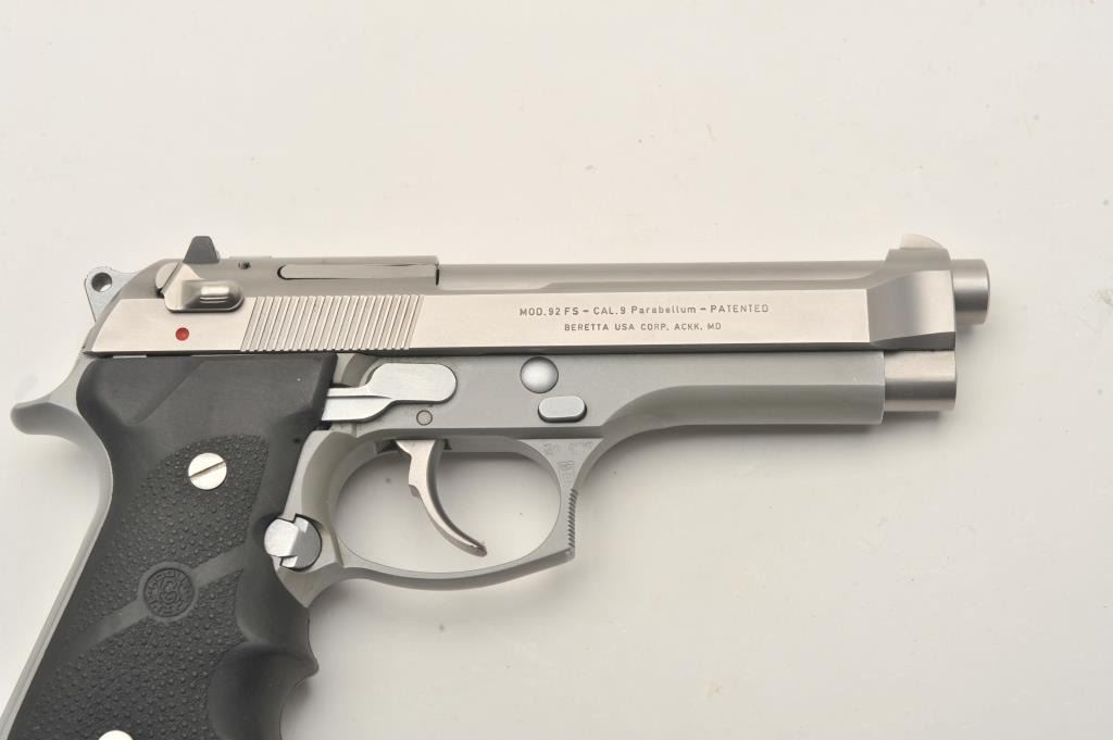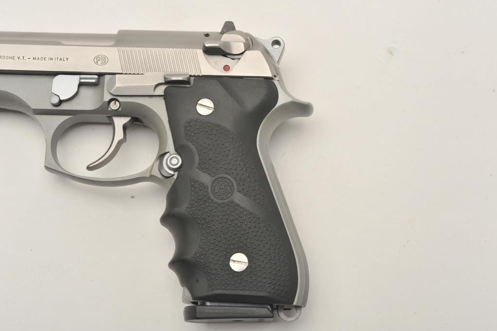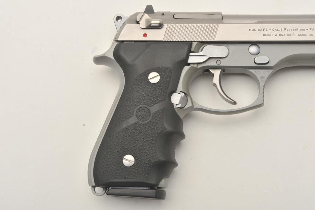 Beretta 92FS semi-automatic pistol, 9mm caliber, Serial #L29198Z. The pistol is in very good overall condition with a 4 ¾” barrel. The pistol retains nearly all of its matte stainless steel finish with only light handling marks. The textured rubber Hogue grips are in very good condition showing little use or wear. The lot includes one correct, Beretta marked magazine. The bore is good, the action is crisp and markings are sharp on this lightly used Beretta. Est.: $350-$700. (Modern/PPT).