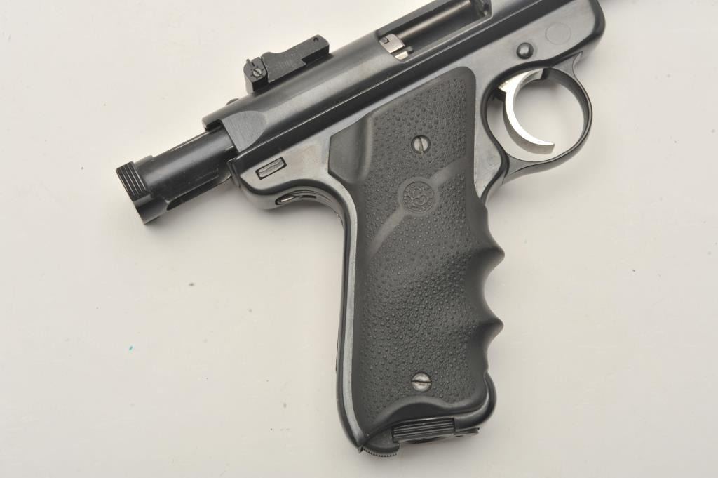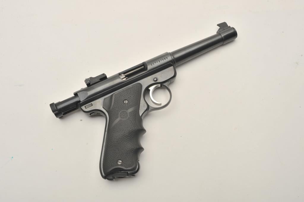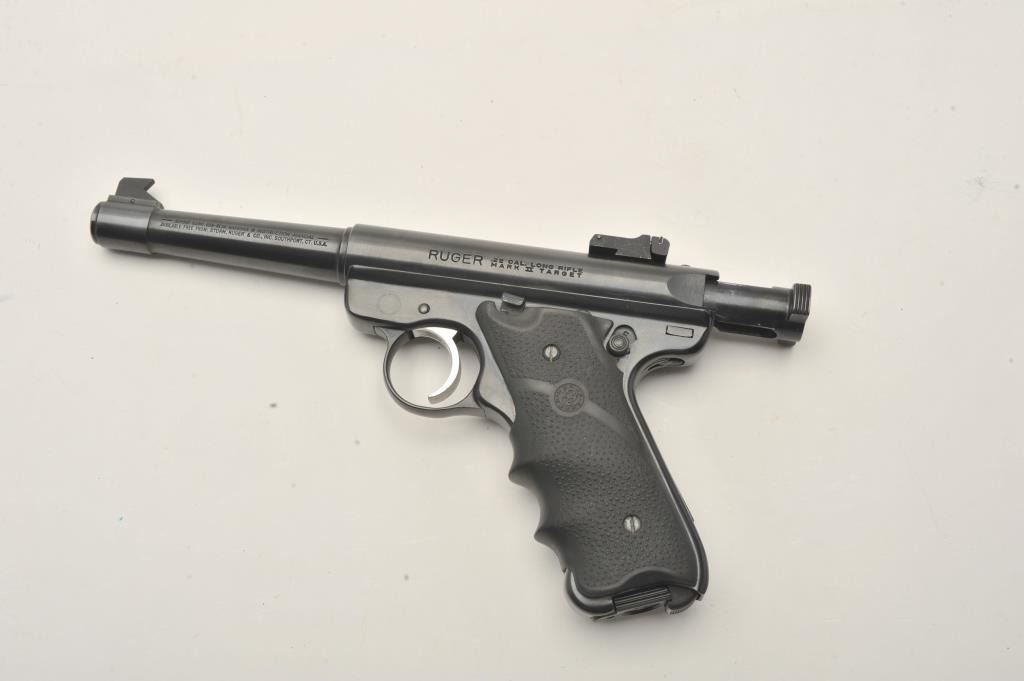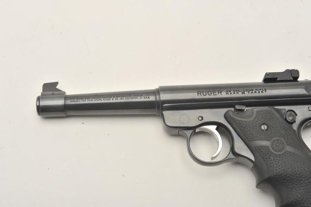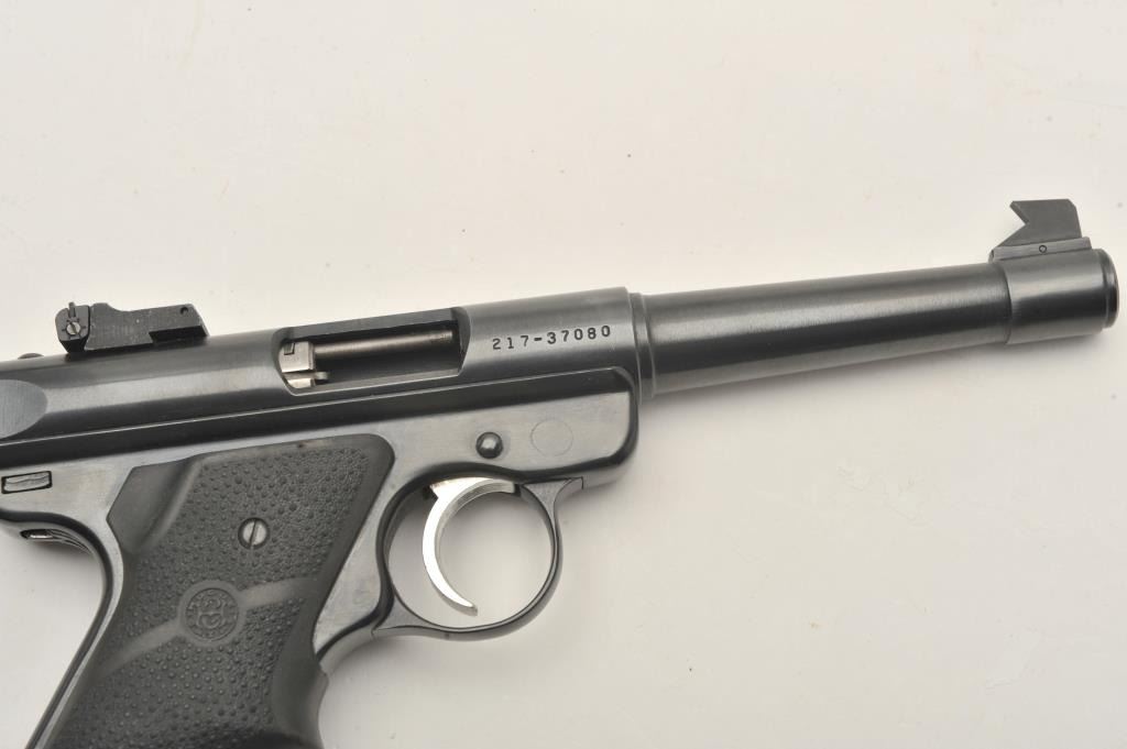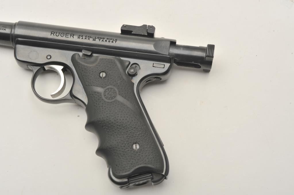 Ruger Mark II Target semi-automatic pistol, .22 Long Rifle caliber, Serial #217-37080. The pistol is in very good to nearly fine overall condition with a 5 ¼” barrel with a blade front and adjustable rear sights. Thepistol retains nearly all of its blue finish with small mars and handling marks. The textured rubber Hogue grips are in very good condition showing little use. The bore is good, the action is crisp and the markingsare sharp. The lot includes one correct, Ruger marked magazine. Est.: $200-$400. (Modern/PPT).