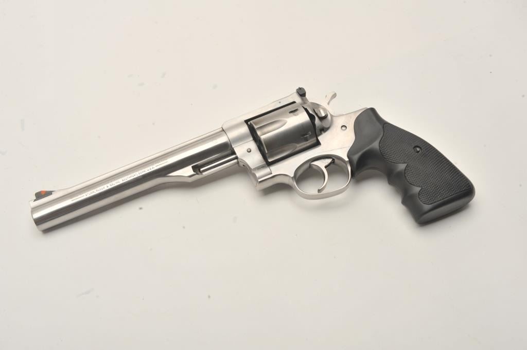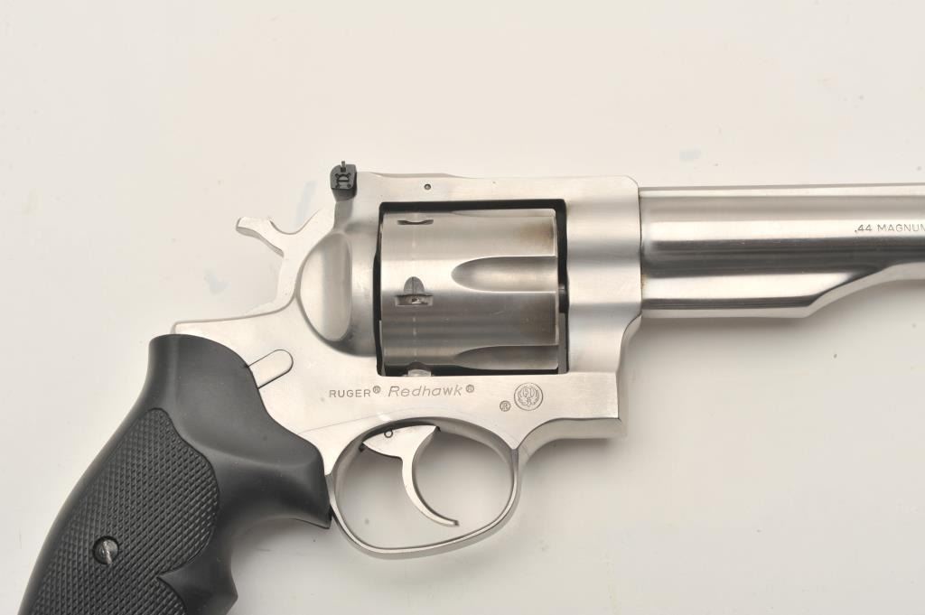 Ruger Redhawk revolver, .44 Magnum caliber, Serial #500-24375. The pistol is in very good overall condition with a 7 ½” barrel with a red ramp front and adjustable rear sights. The pistol retains the majority ofits brushed stainless steel finish with light discoloration and a drag line on the cylinder. The checkered rubber combat grips are in very good condition showing light wear. The bore is good, the action is crispand markings are sharp. The pistol comes in the factory cardboard box with manual. Est.: $350-$700. (Modern/PPT).
