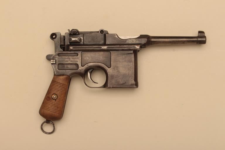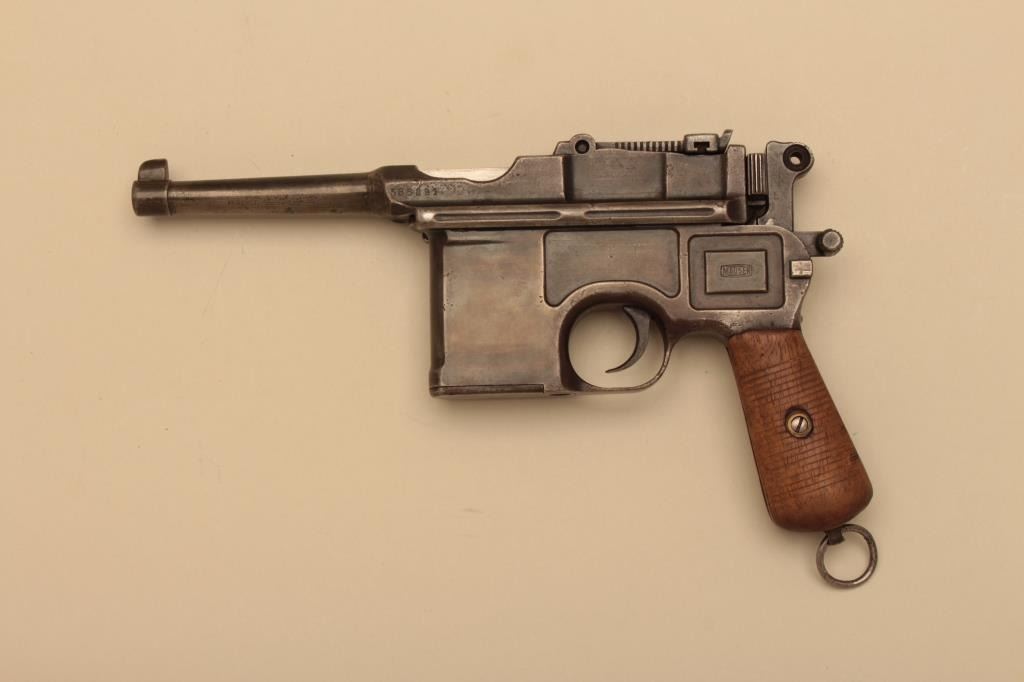 Mauser Broomhandle “Bolo” Semi-Auto .30 caliber pistol with a 4” barrel, S/N 585891. Rear sight graduated to 1000 meters. No import marks. 10%-30% blue mixed in a mostly gray/brown patina. The grips are good withfinish stripped but not sanded. The action is working and the bore is poor. Purportedly Vietnam bring back by Marine NCO and consigned by his estate. (C&R/PPT) Est.: $700-$1400