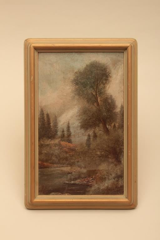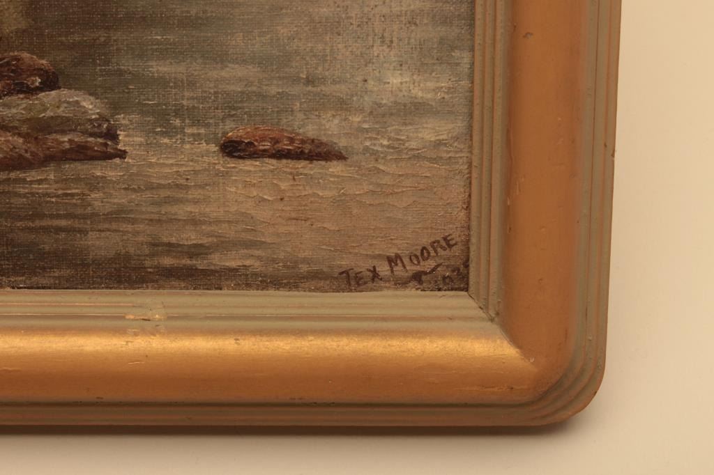 Pair of landscape paintings signed lower right βTex Moore 1935β with trail skull vignette. Approximately 12 ½β x 7 ½β in vintage frames needing minor cleaning. Canvas laid down on board. John Moore painted nearYellowstone and in Wyoming and Montana. He was self-taught and encouraged by Frederic Remington. Born near Ft. Worth, TX his father pioneered the Abilene Trail. He was a real cowboy, Texas Ranger, and Indian scout forGen. Crook. In 1935 he was designated the official cowboy artist of the Lone Star state. John Moore was born 1866 and died 1948. Est.: $1500-$3000