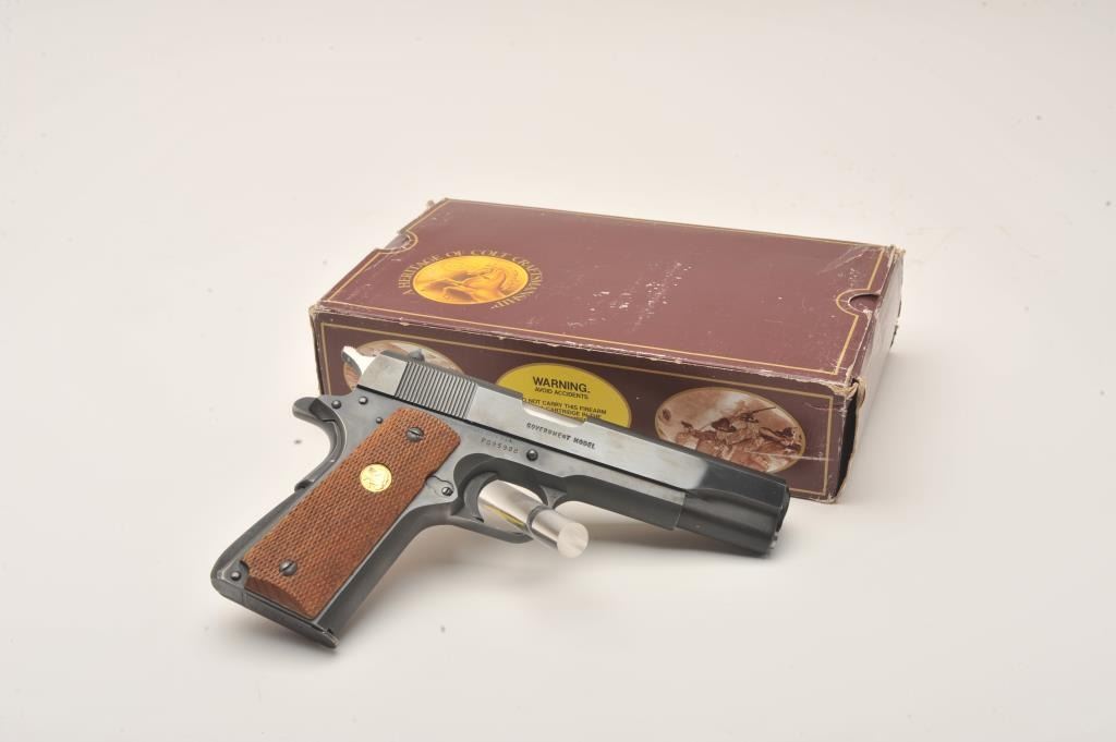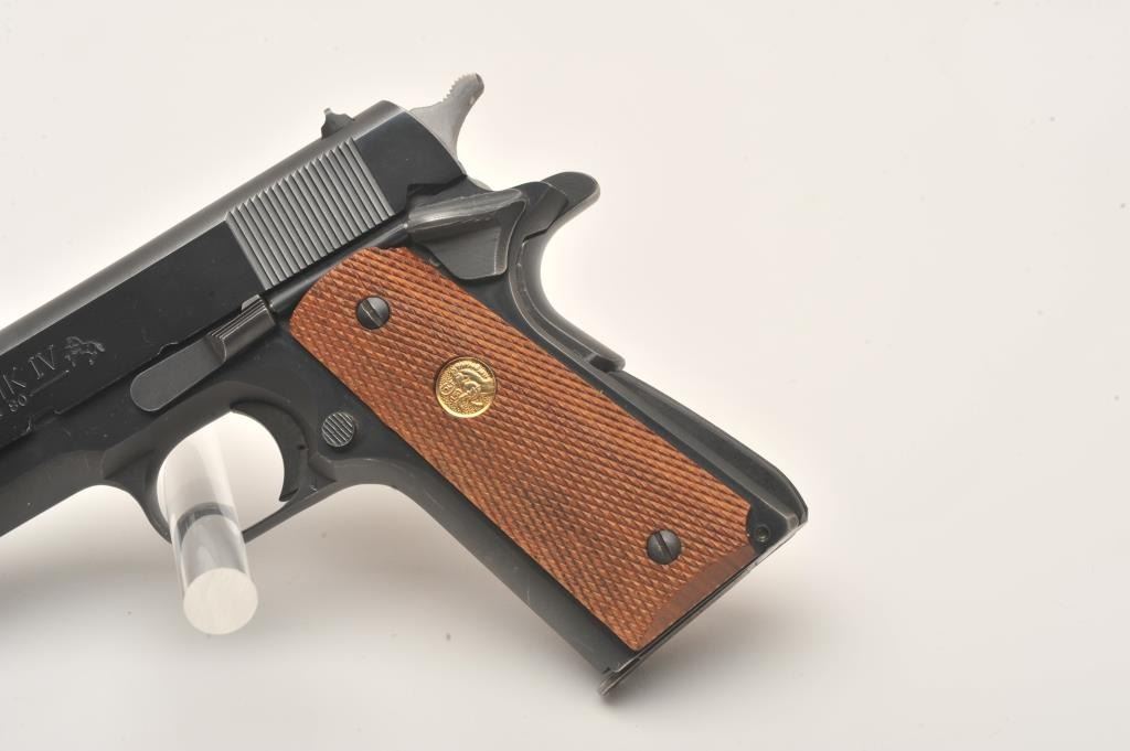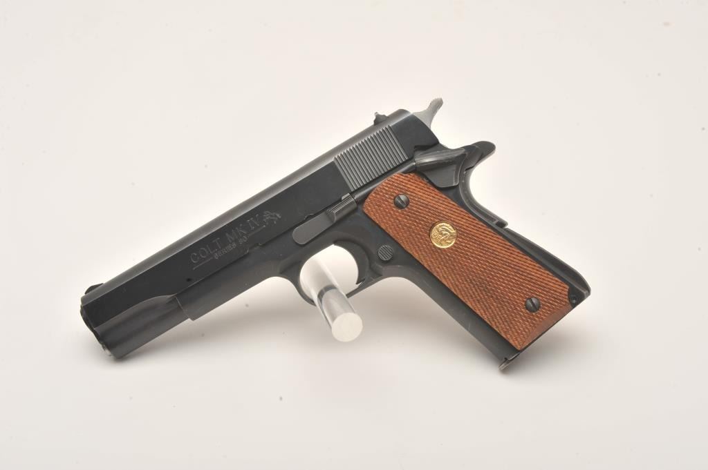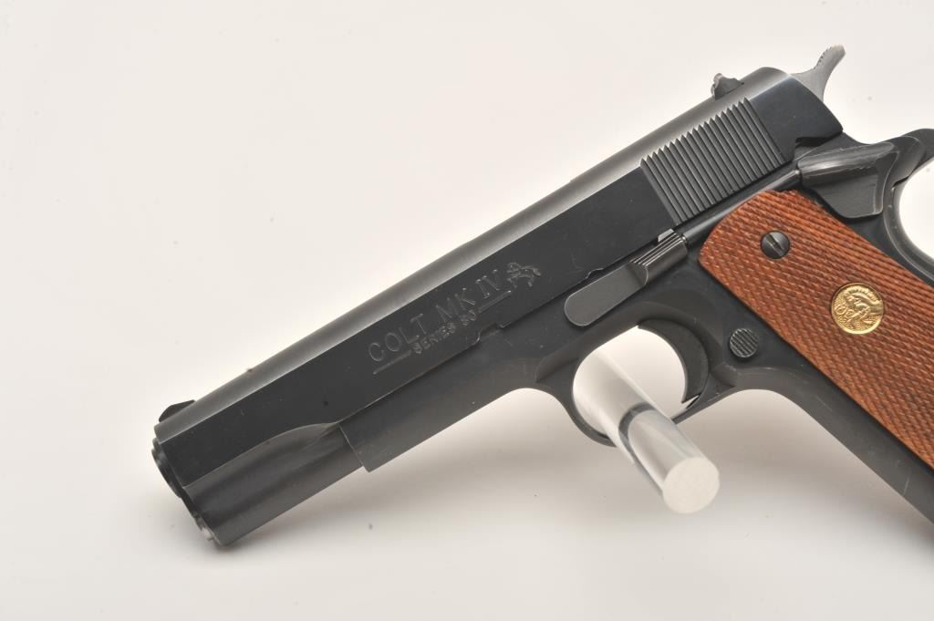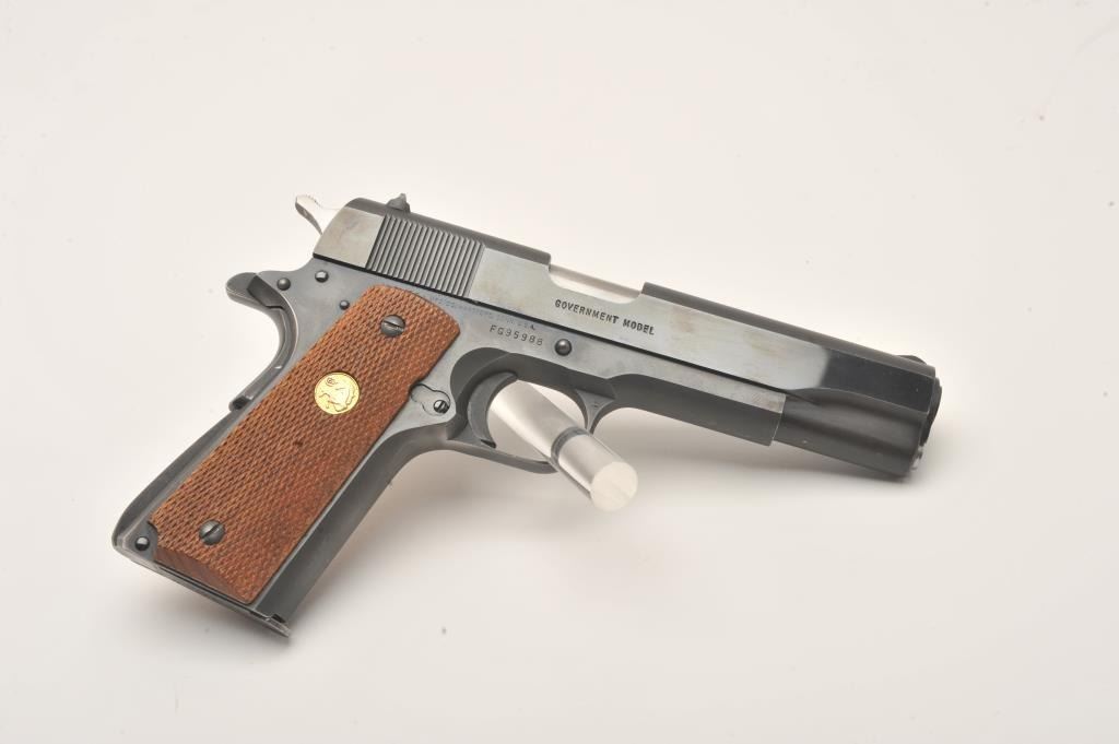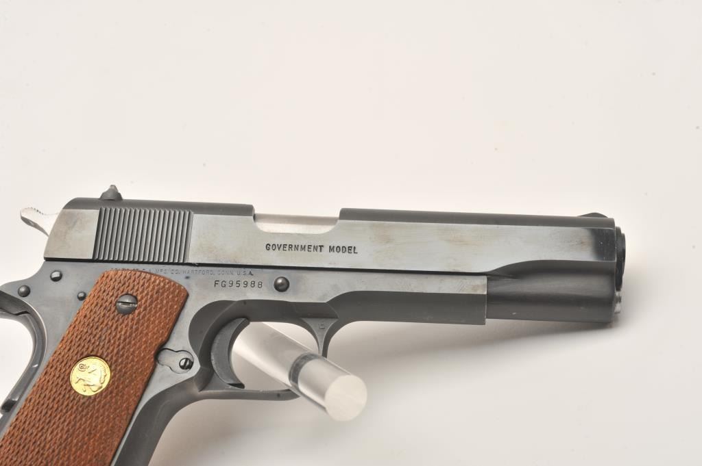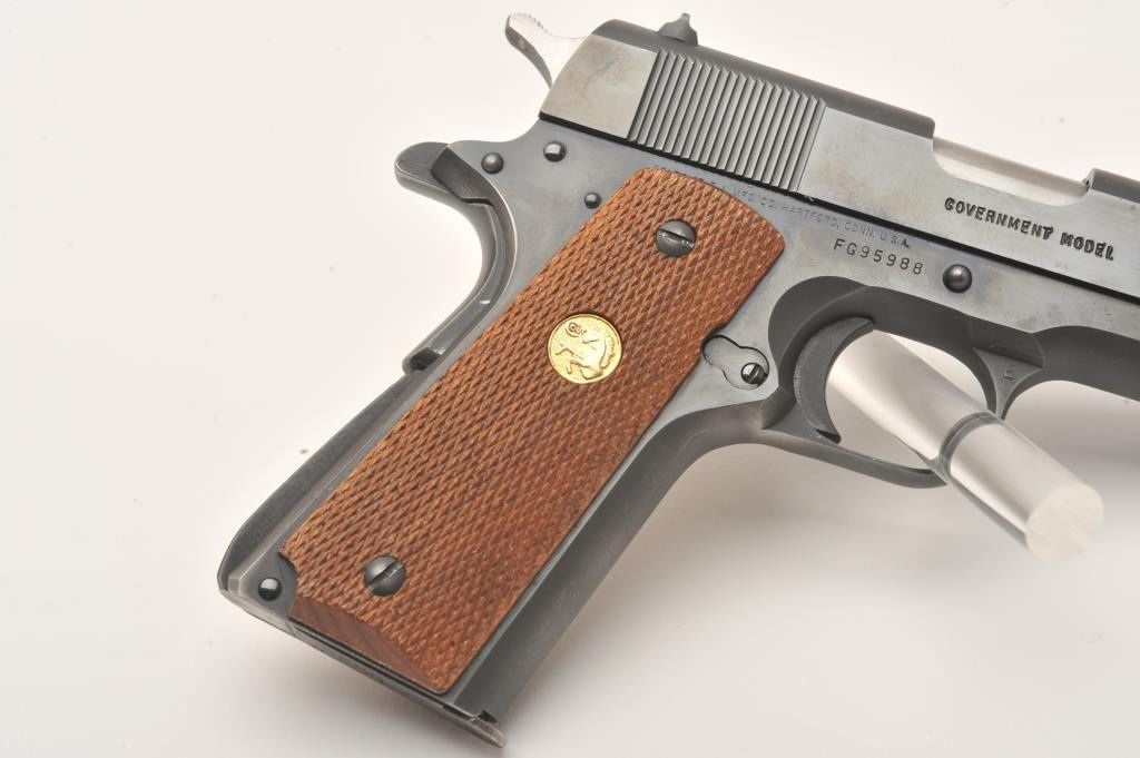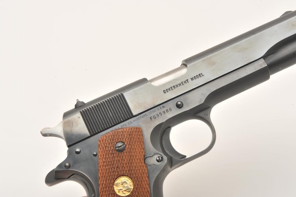 Colt MK IV/Series 80 Government Model semi-automatic pistol, .45 caliber, 5” barrel, blued finish, checkered wood medallion grips, S/N FG95988, like new in cardboard factory box with Styrofoam inserts; end label numbered to this gun. (Modern/PPT). Est.: $600-$1,200.