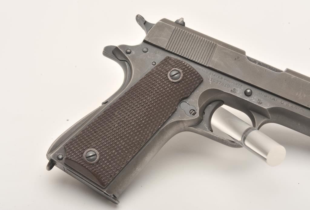 Colt Model 1911-A1 British Lend Lease semi-automatic pistol, .45 ACP caliber, 5” barrel, no import marks, parkerized finish, British proofed, checkered brown plastic grips, S/N 1637810; overall good to very good condition with good bore, crisp action, very good markings and grips. Consignor notes indicate information on British Lend Lease pistols with notation that this one stayed in .45 caliber and was not converted to .455Webley. (C&R). Est.: $750-$1,500.
