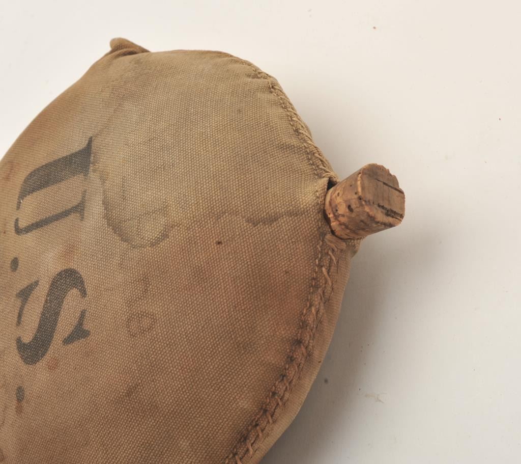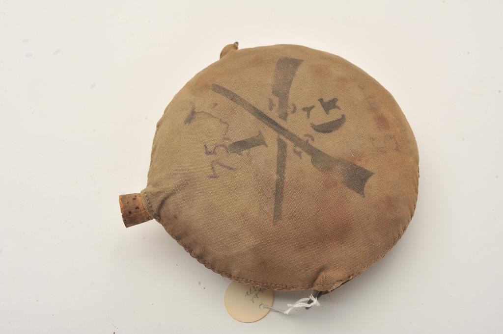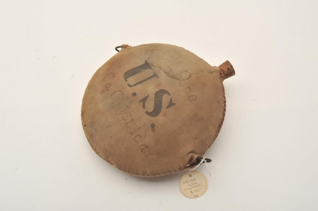 Indian Wars circular metal canteen with tan canvas cover stenciled “75 1G with crossed rifles” on one side and “U.S.” stenciled on the other side plus “J.L. Pope and Co. C 1st I____” inked on the other side; overall goodcondition with strap swivels retained and old cork stopper; some fading and staining to cover. Est.: $150-$300.