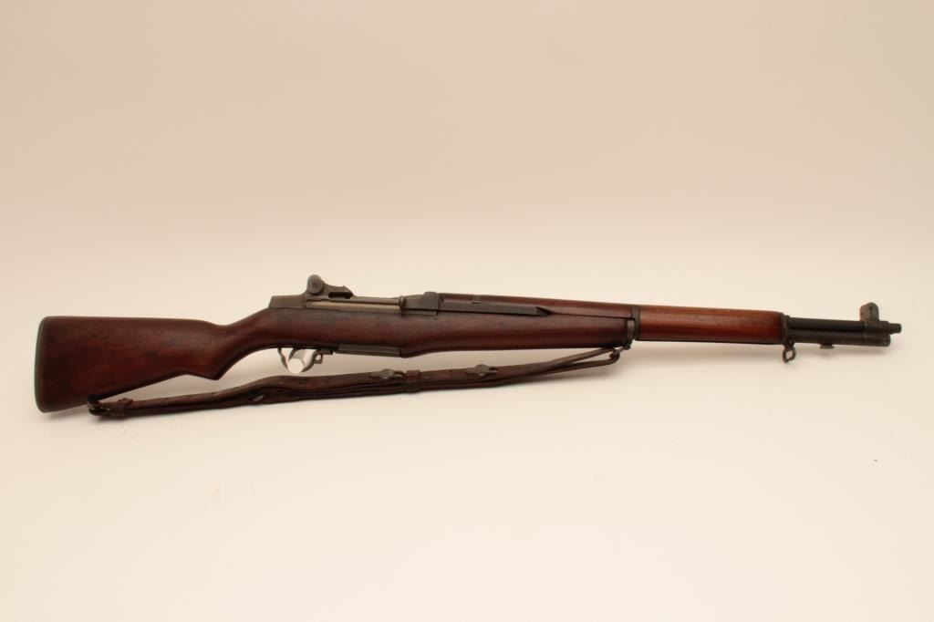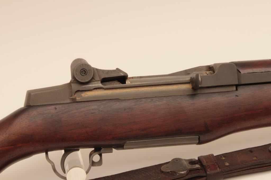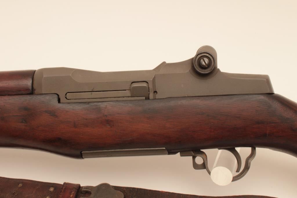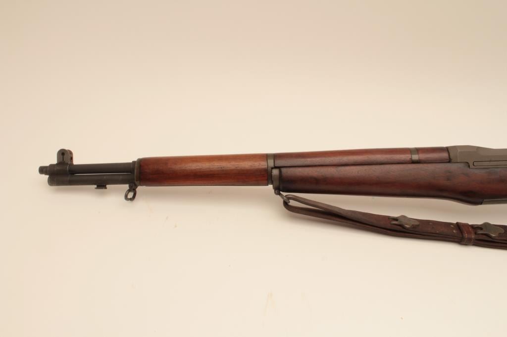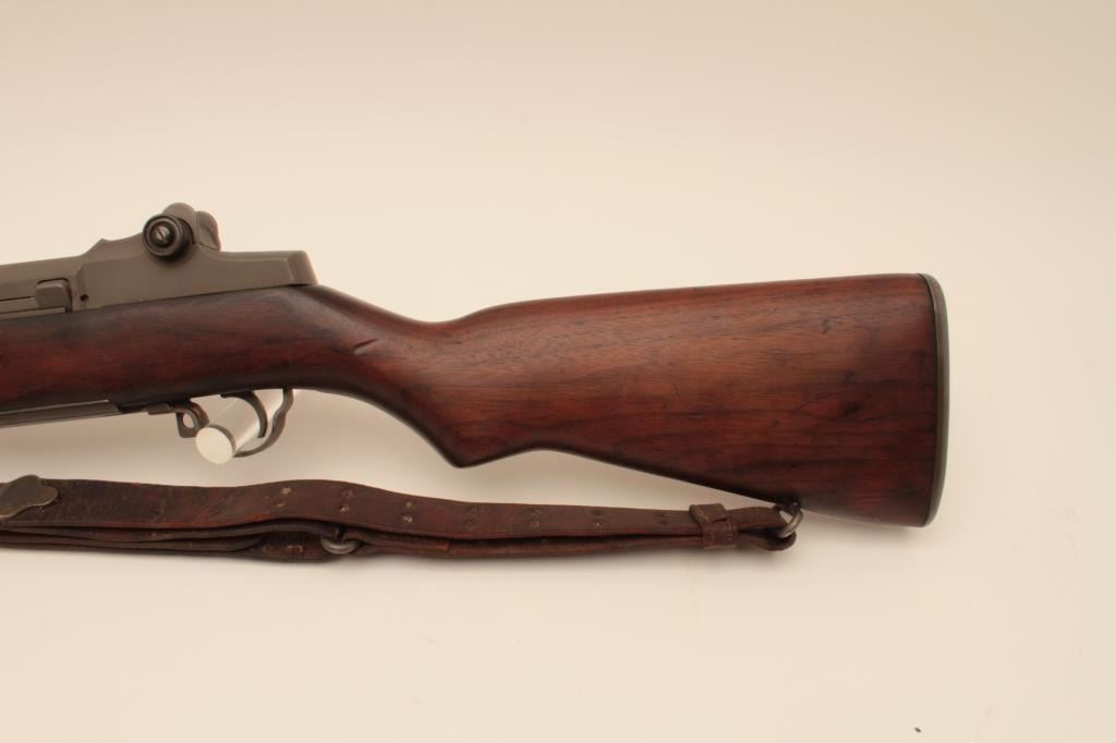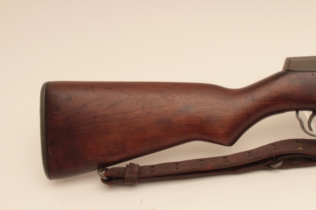Springfield Armory M-1 Garand, #3850006, 30-06 cal., 24" barrel, parkerized finish, walnut stock with "P" proof on pistol grip, leather sling. Rifle is in very good condition as arsenal rebuilt, SA barrel dated 6-45, stock has been lightly sanded. Trigger group is SA, action has copious amounts of dried grease. (C&R) $750-1500