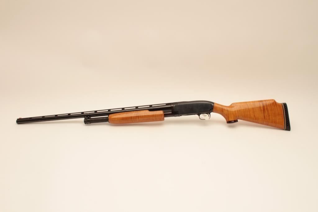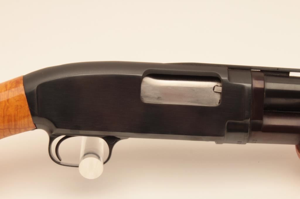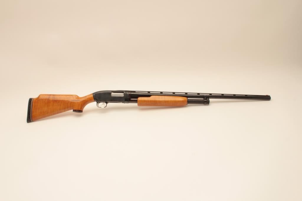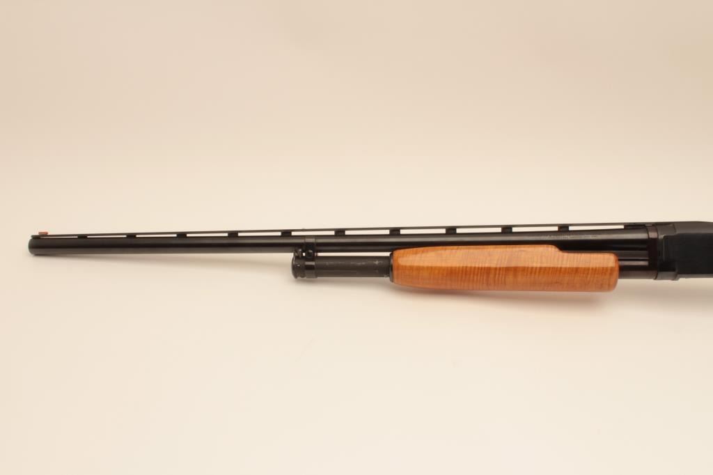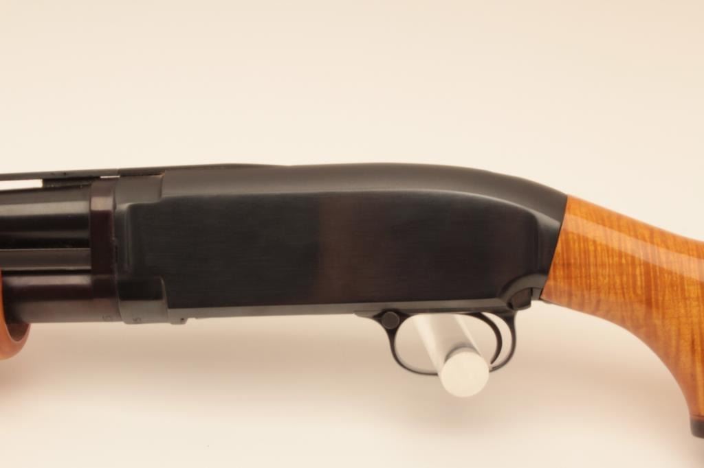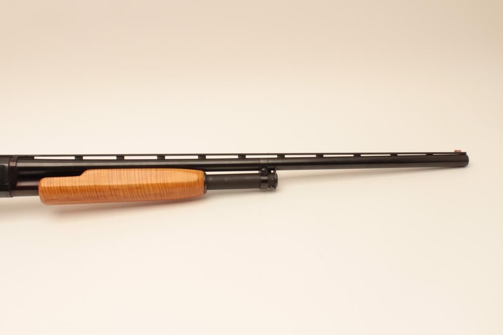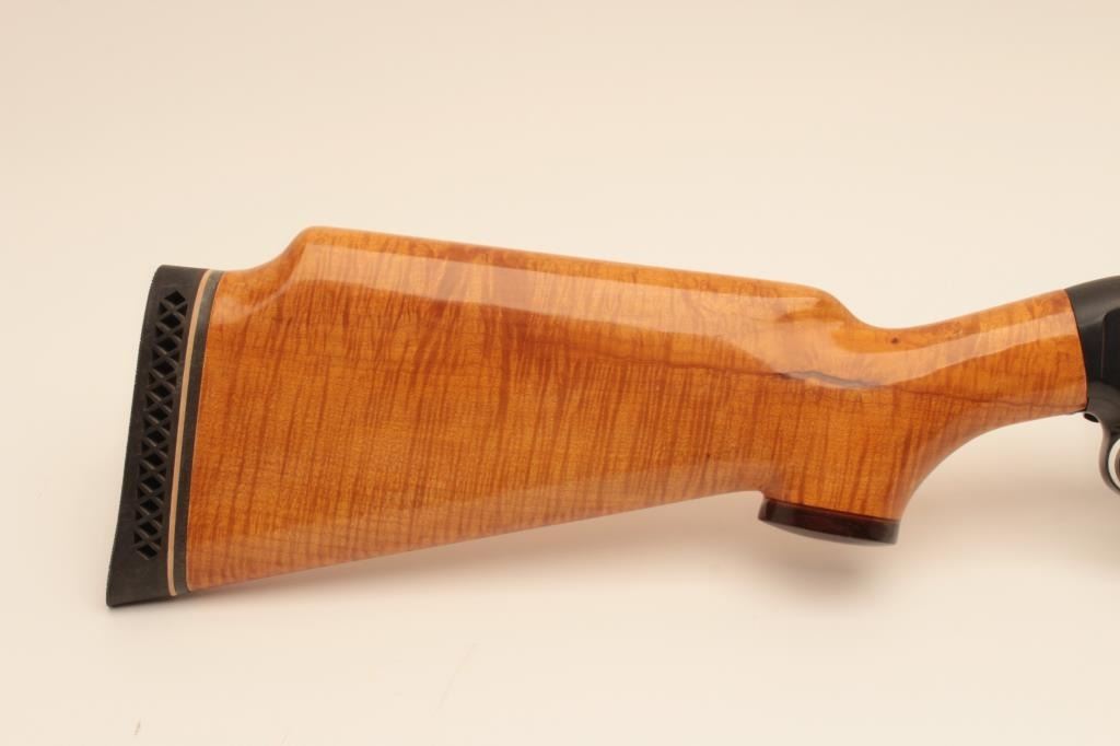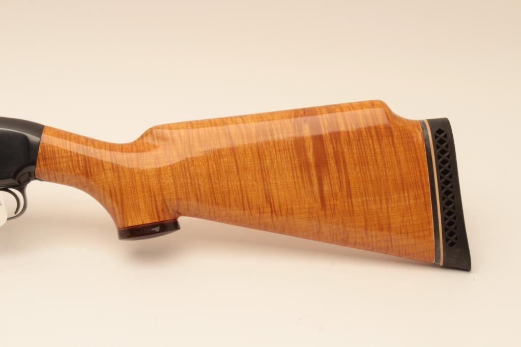 Winchester Model 12, #1764165, 12 Ga, 30" barrel with Simmons rib, custom flame maple stock with rubber recoil pad. Shotgun is in fine condition overall, as refinished after the addition of the Simmons rib. Bore isvery good, as is action, wood is fine with minimal handling marks. LOP is 14 1/4". (C&R) $250-500