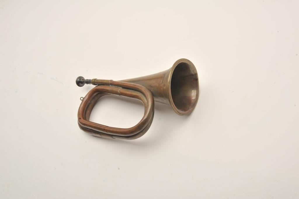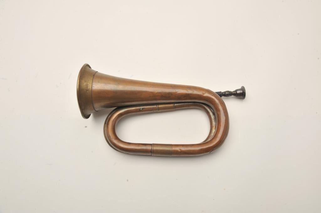 Brass bugle with metal mouthpiece, approximately 12” overall; taffy colored patina; overall good condition. Est.: $200-$400.
