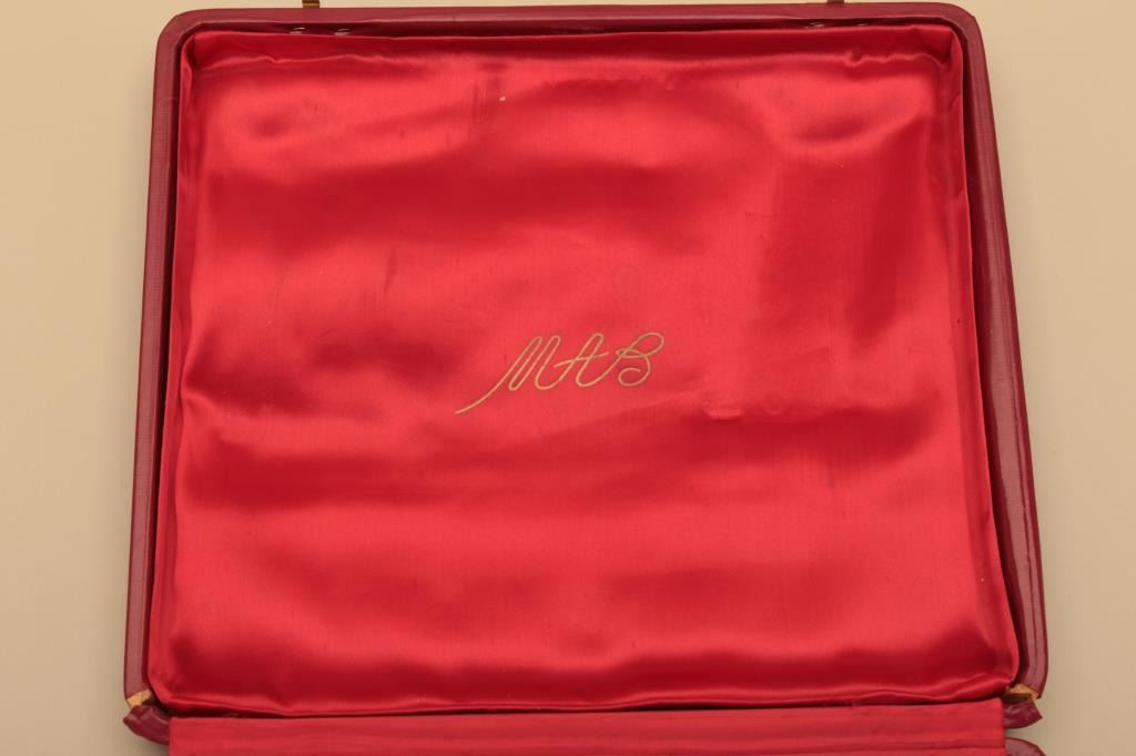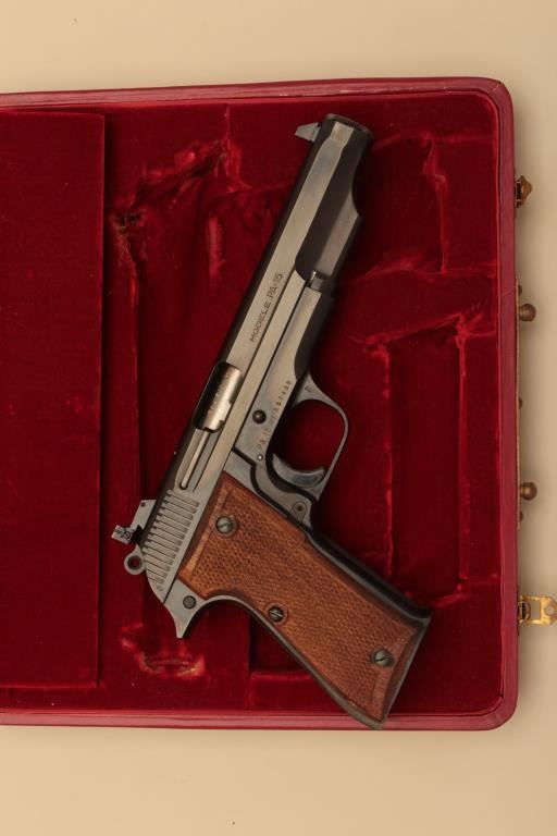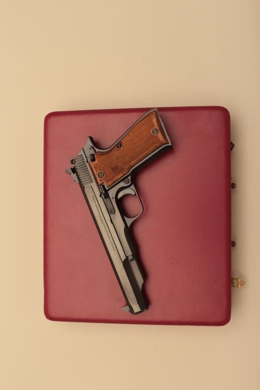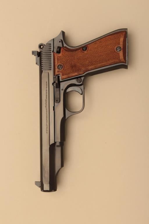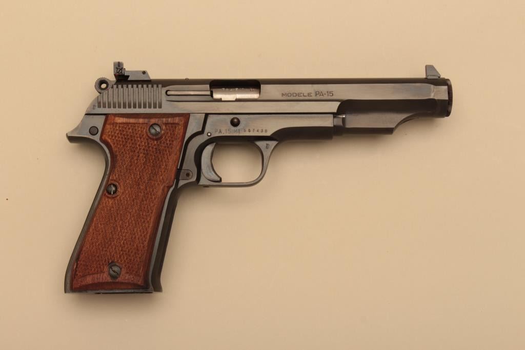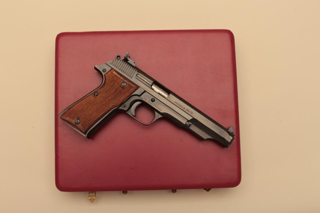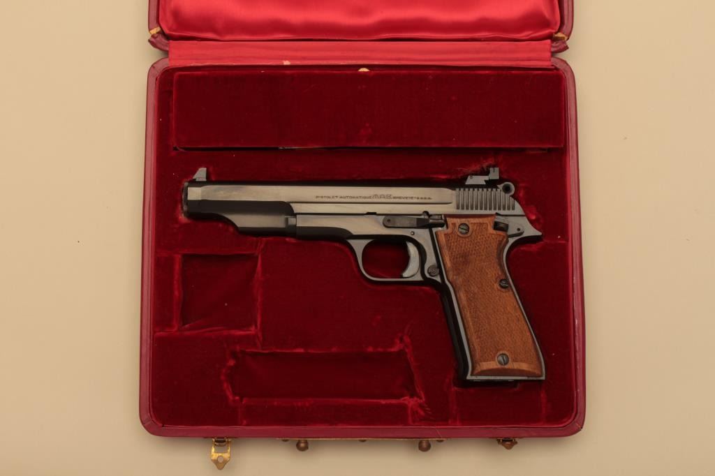 French MAB PA-15 M1 Target, #557438, 9mm, 5 7/8" barrel, blued finish, adjustable sights, checkered wood grips. Pistol is in fine to excellent condition, retaining approximately 96-98% original finish, showing minorhandling marks. Bore is very good, action is excellent, grips are fine. Includes a red deluxe leatherette fitted case, and 2 hi-cap mags (not transferrable to CA or other prohibited states or areas). (Modern/PPT)Est. $700-1400