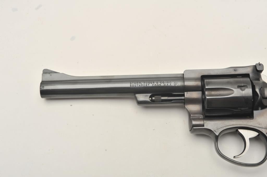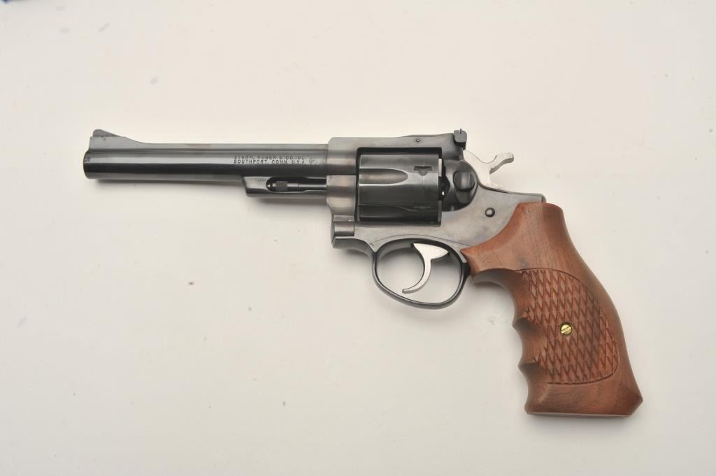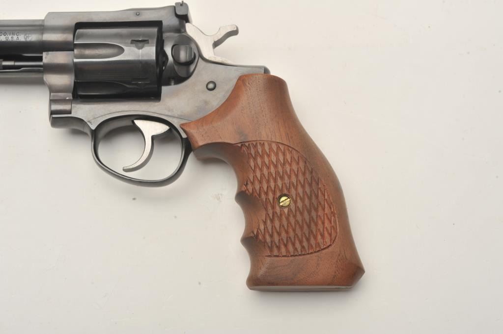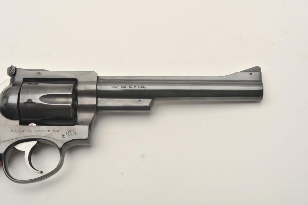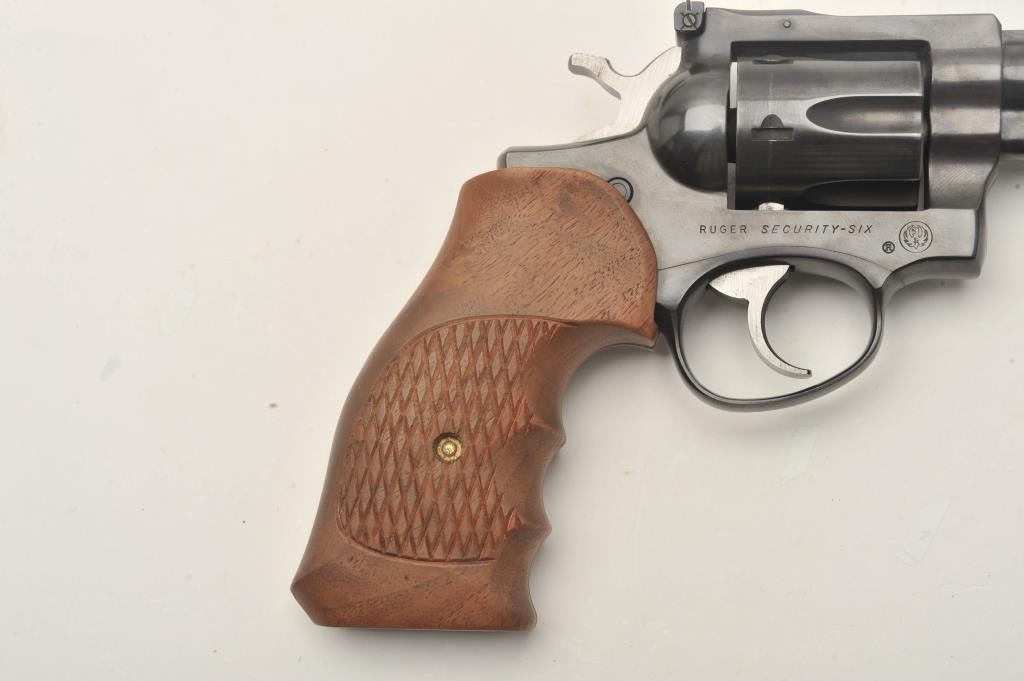 Ruger Security Six revolver, .357 Magnum caliber, Serial #153-87240. The pistol is in very good overall condition with a 6” barrel with a red ramp front and adjustable rear sights. The pistol retains the majority of its blue finish with light handling marks. The custom checkered wood grips are in very good condition. The bore is good, the action is crisp and markings are sharp on this lightly used Ruger. Est.: $300-$600.(Modern/PPT).