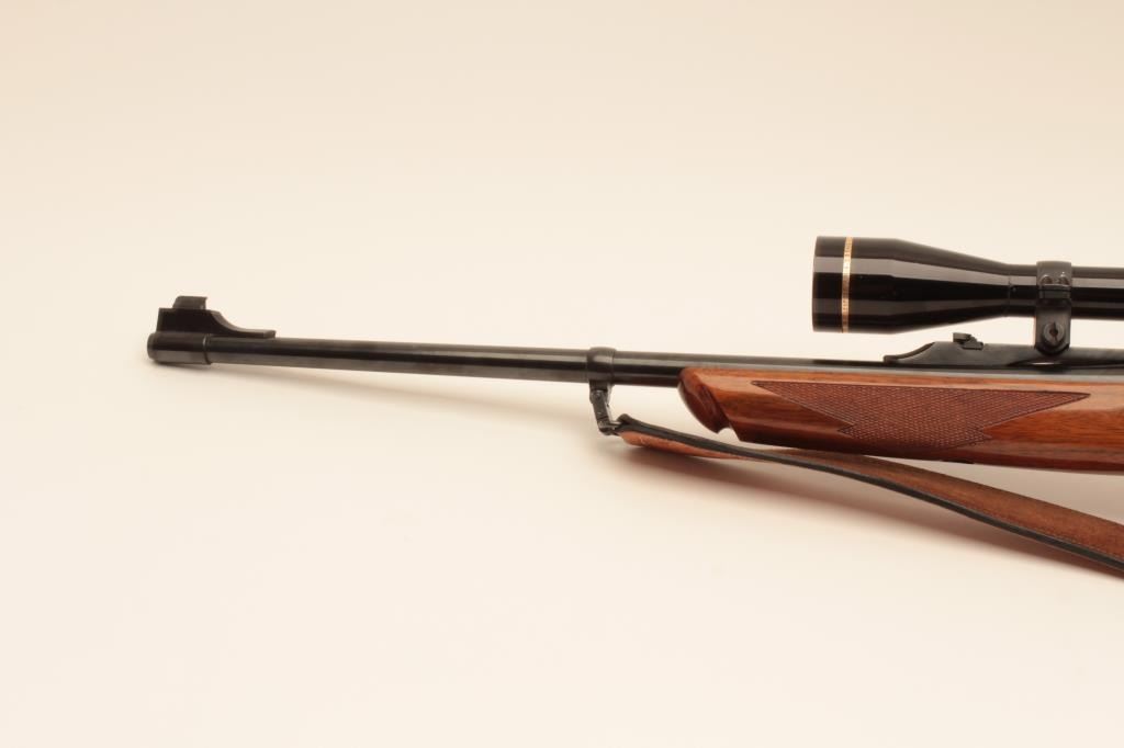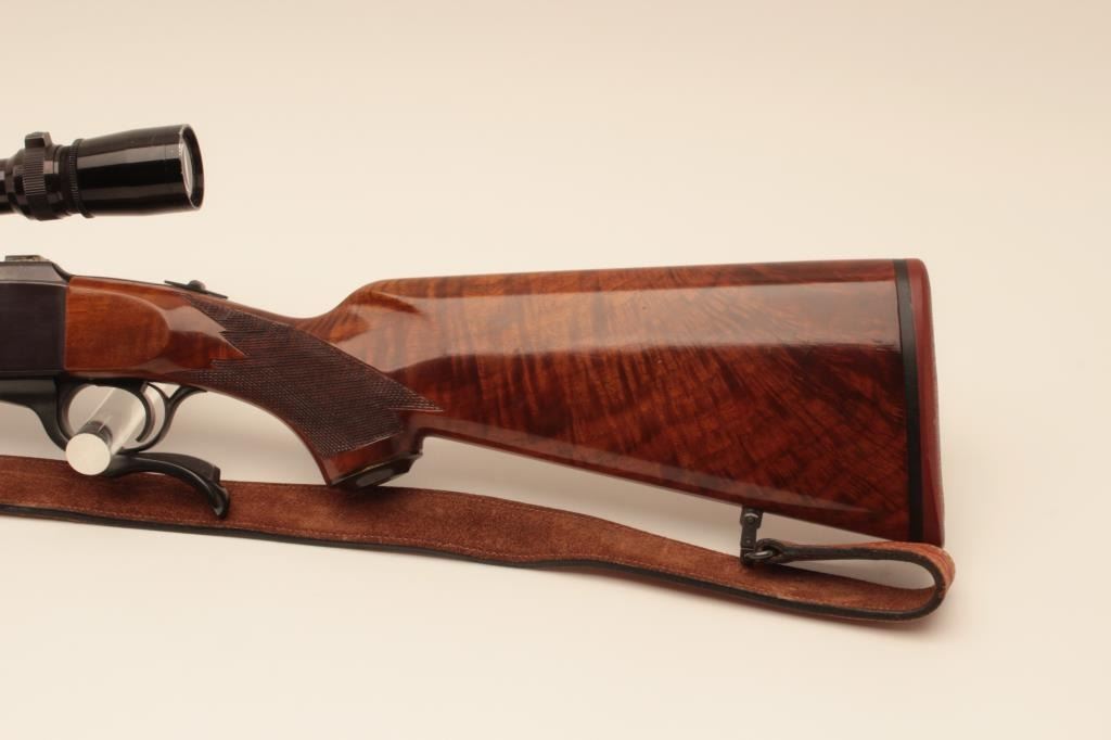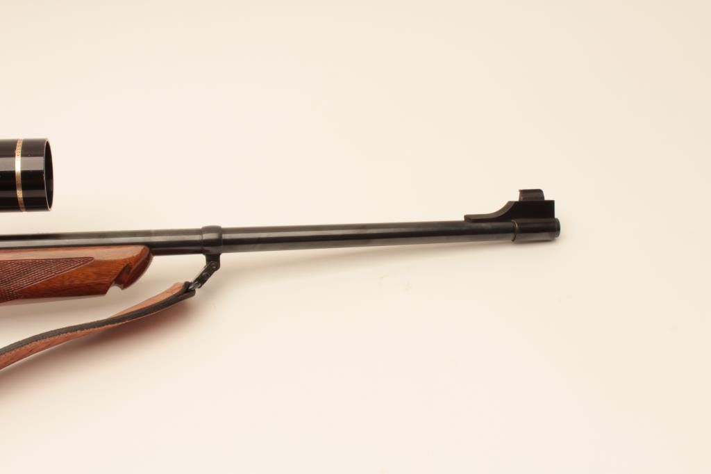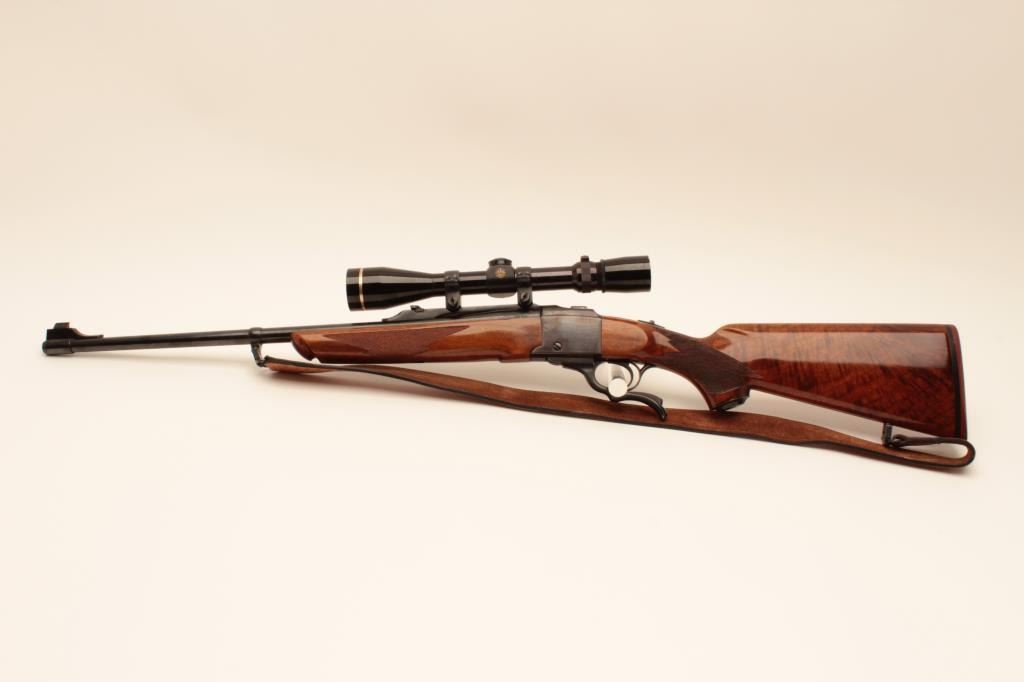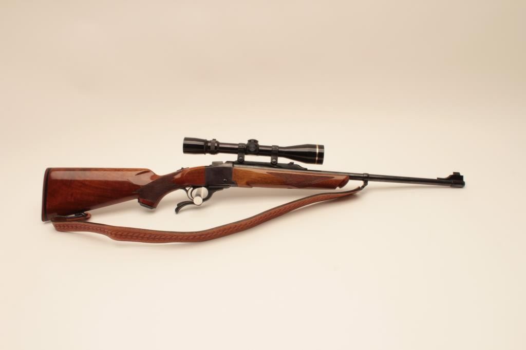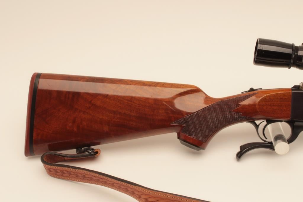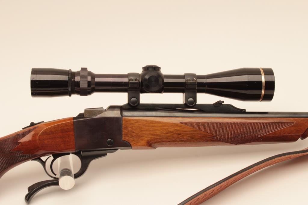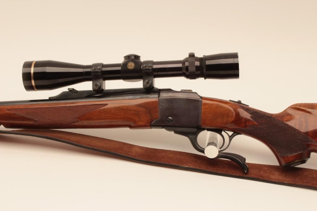 Ruger No1 single shot rifle, #131-12584, .243 Win cal., beautifully figured stock, quick detatchable sling swivels with leather sling. Rifle is in near fine condition overall, showing approximately 95% original blue, bore is good, action is good, stock is very good with minor handling marks and slight nicks at front of comb. Mounted with a Leupold Vari-X III 3.5-10 scope with good optics. (Modern) Est $600-1200