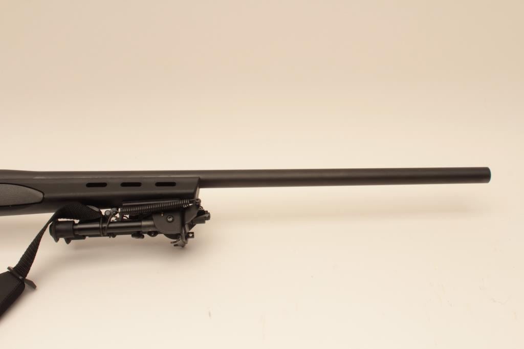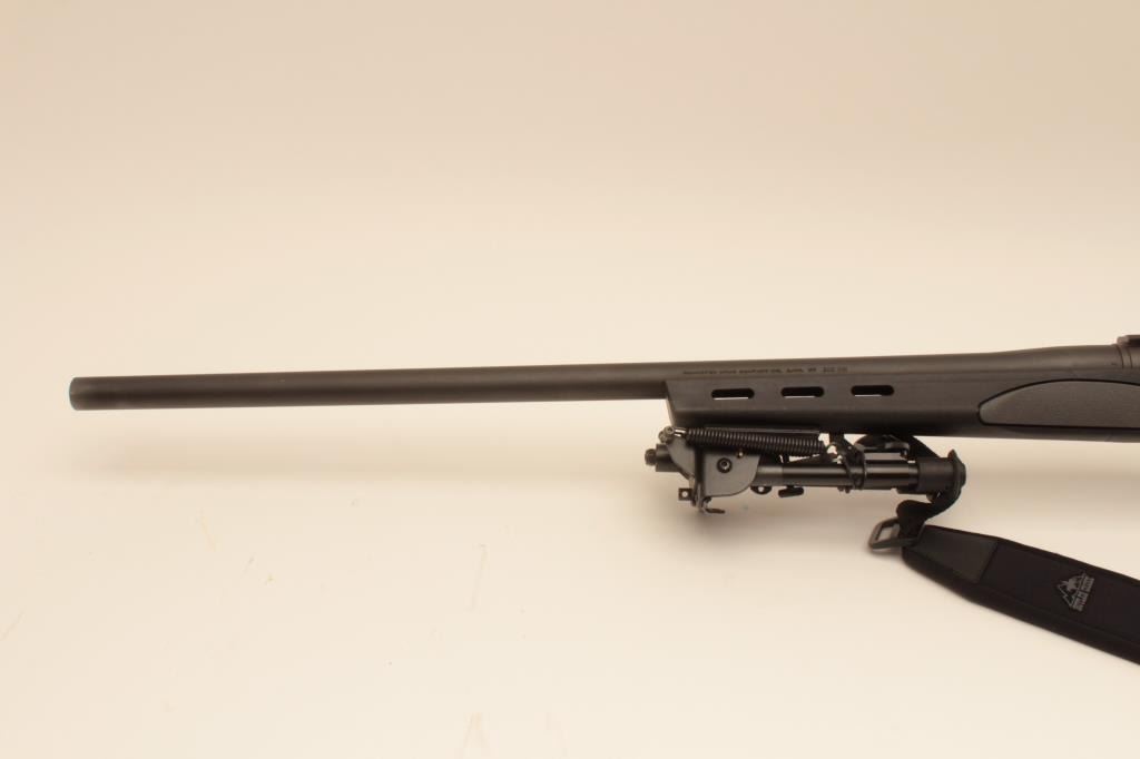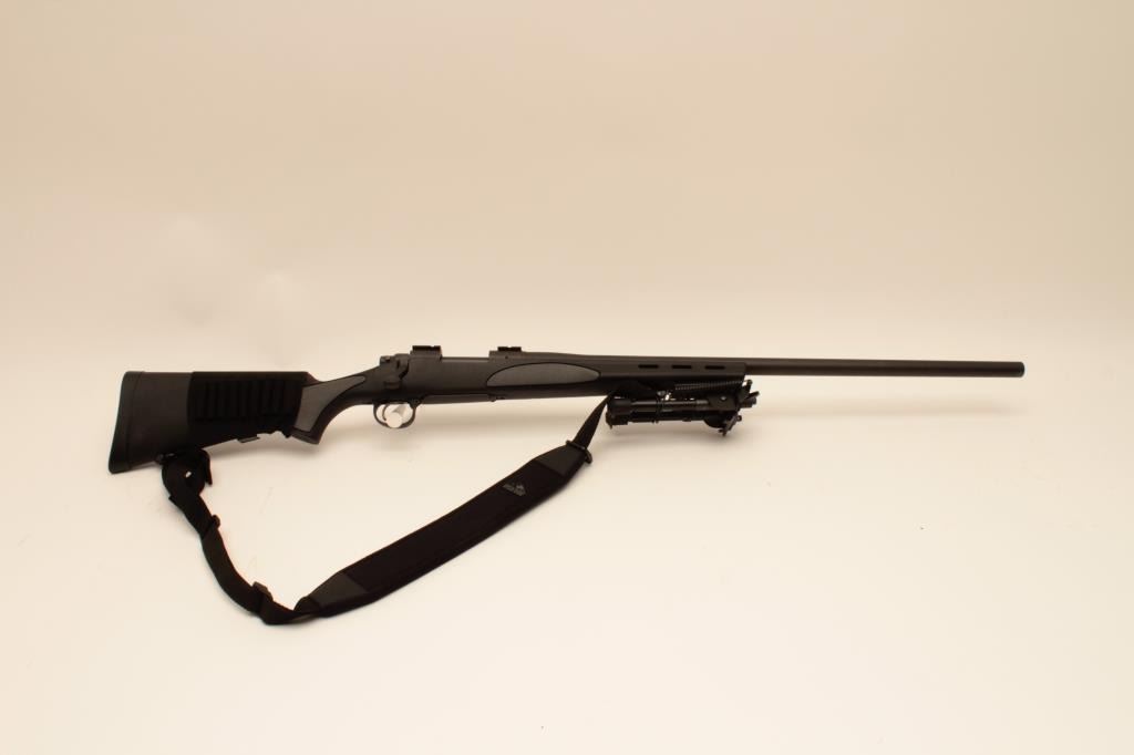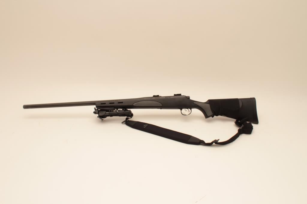 Remington 700, #RR28805B, .308 cal, 26" heavy harrel, matte finish with synthetic stock, tactical bipod, nylon sling and mounts for scope rings. Rifle is in near fine condition, showing little use, excellent bore and action, rifle shows just minimal marks from storage and use. (Modern) Est. $400-800