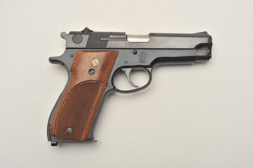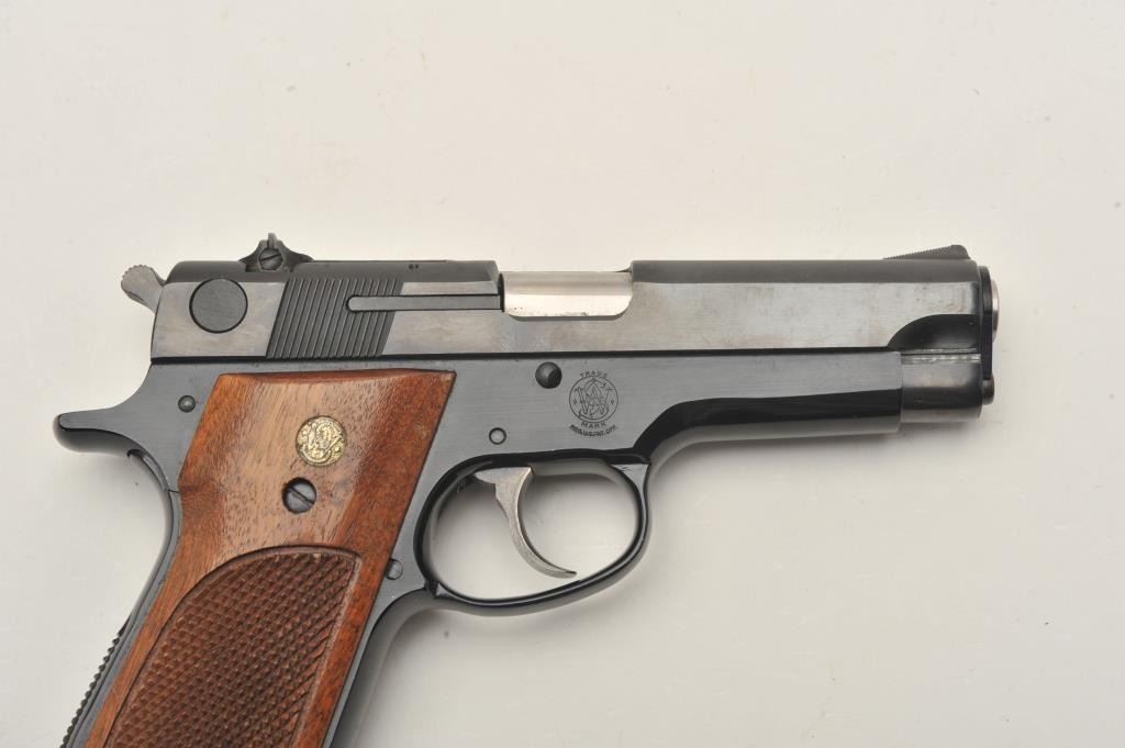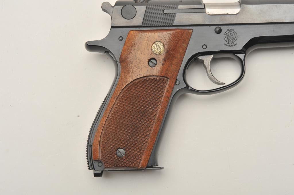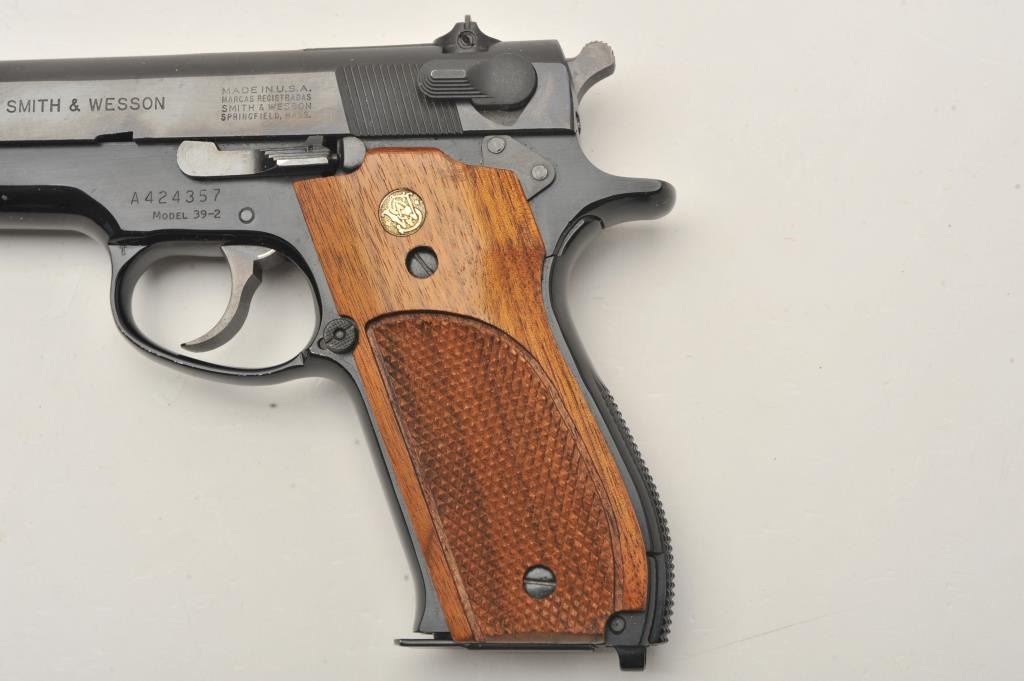 Smith & Wesson Model 39-2 semi-automatic pistol, 9mm caliber, Serial #A424357. The pistol is in very good overall condition with a 4” barrel. The pistol retains the majority of its blue finish with small marsfrom carry and use. The gold medallion checkered wood grips are in very good condition with sharp checkering. The bore is good, the action is crisp and markings are sharp on this desirable S& W. The lotincludes the original blue cardboard factory box with all associated packaging materials, manual and two magazines. Est.: $400-$800. (Modern/PPT).