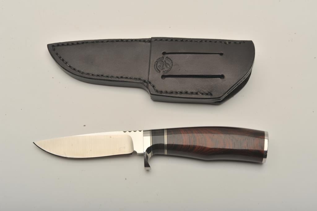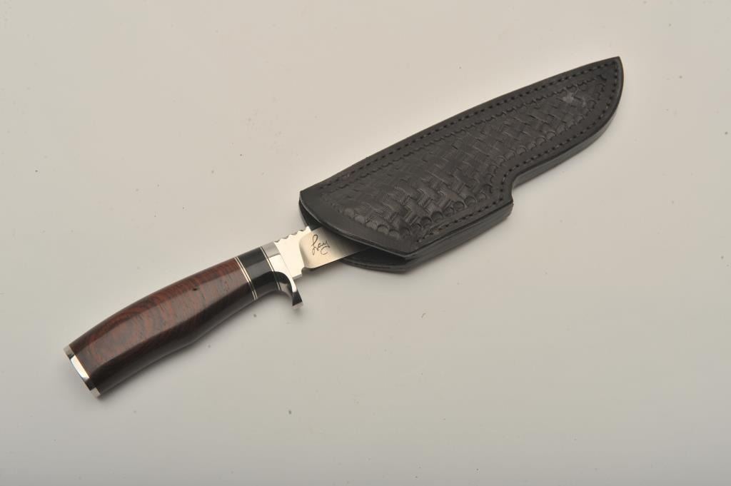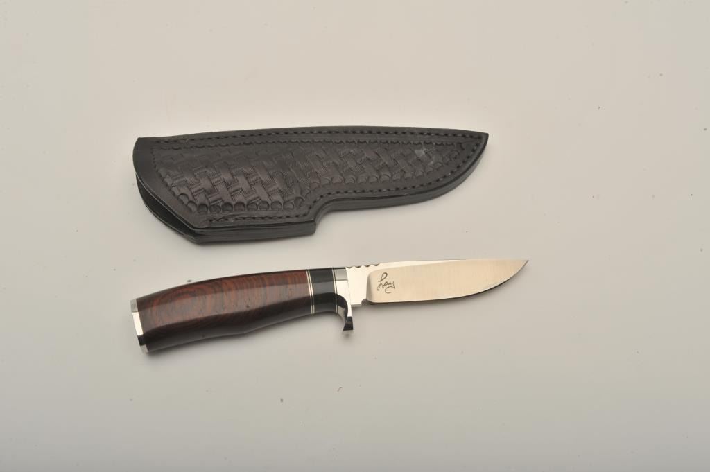 Custom Bob Lay Personal fixed blade knife. The knife is 8β in total length with a 4β blade of 440C steel, marked βLayβ on the blade. The scales are smooth Cocobolo wood with a sheep horn spacer and a polishednickel handguard and pommel. The lot includes a basket weave leather sheath marked Lay on the back. A nice knife by a great maker in very good condition. Est.: $150-$300.