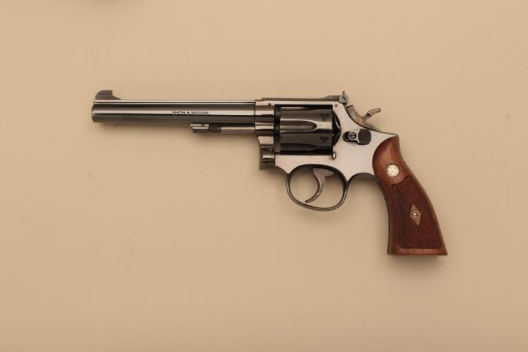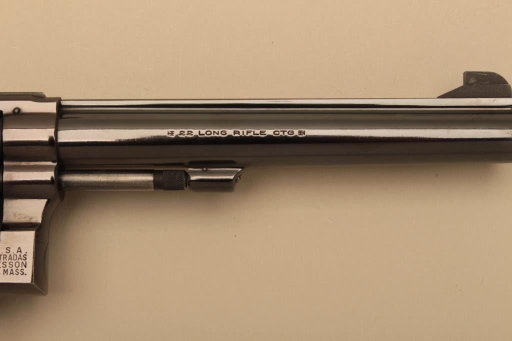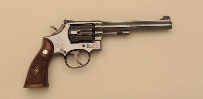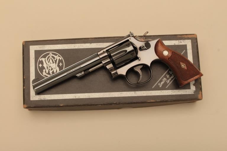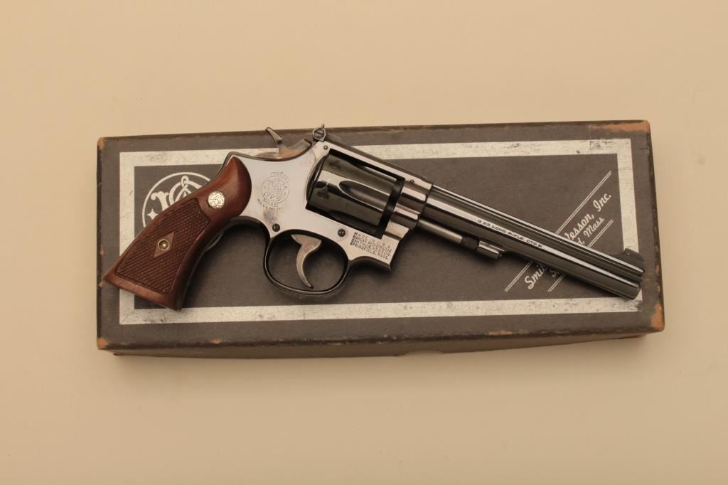 Smith & Wesson Model 17-1 K-22 Masterpiece DA revolver, .22LR caliber, 6” barrel, blued finish, checkered wood medallion grips, S/N K427747; overall near new condition with slight muzzle wear; accompanied by a factorytwo piece cardboard box with instructions printed on inside of lid and end label. (C&R). Est.: $700-$1,400.