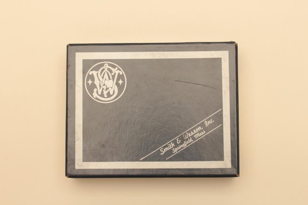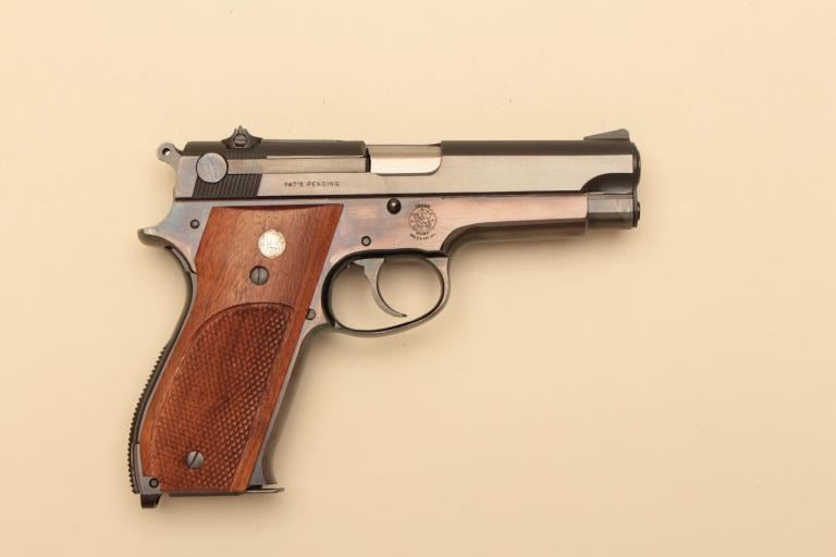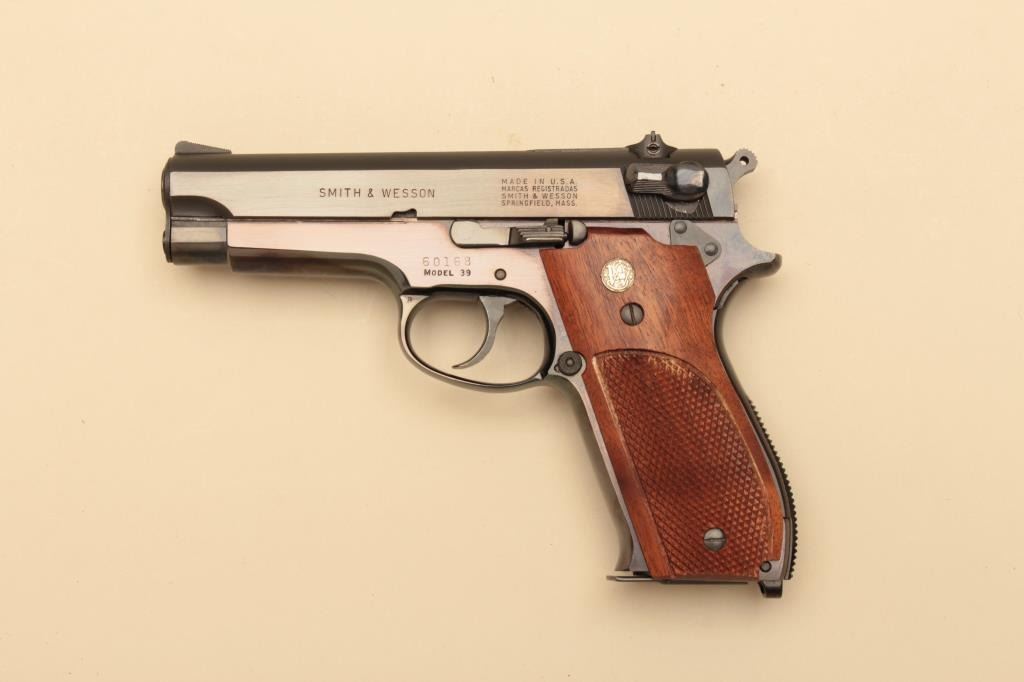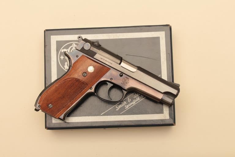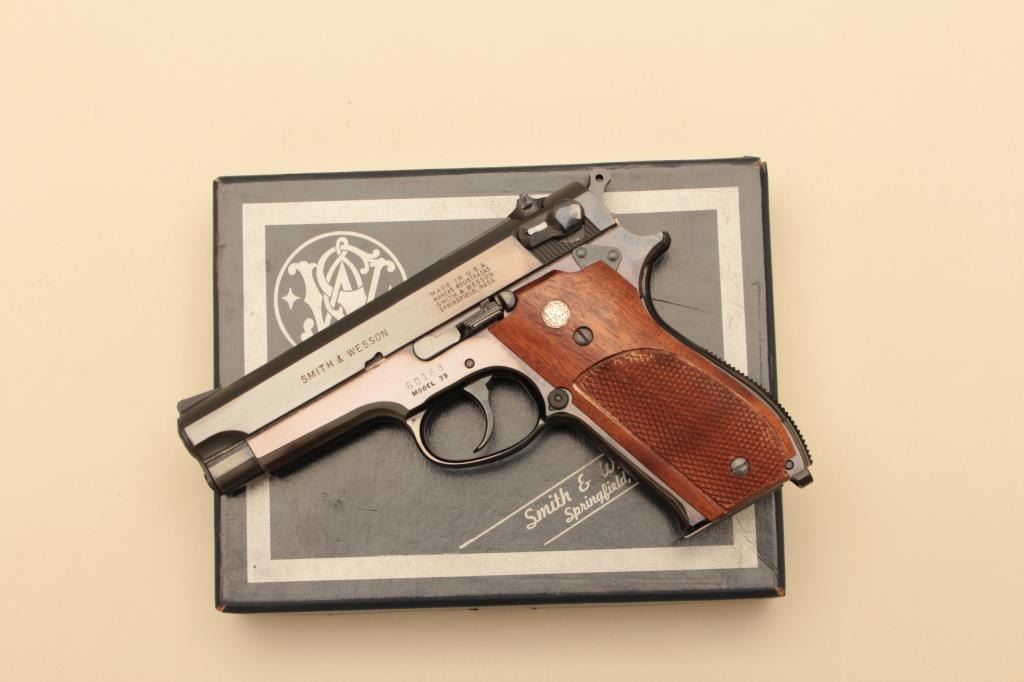 Smith & Wesson Model 39 steel frame, #60168, 9mm, 4" barrel, blued finish, adjustable sights, checkered medallion walnut grips. There were only 927 steel frame model 39s produced, making it very collectable. Pistol is in fine condition overall, showing 95-98% original finish, excellent action, minty bore, grips are fine with no chips or cracks and have crisp checkering. Minor scratches from handling. Includes original two piecebox numbered to the gun, instructions and 2 mags. (C&R/PPT) Est. $800-1600