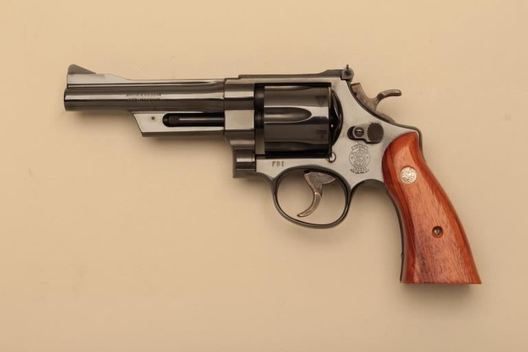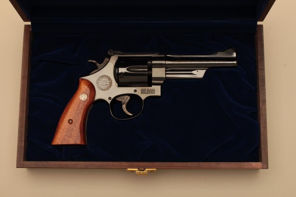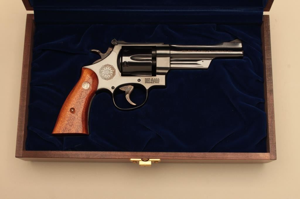 Smith & Wesson DOJ/FBI Commemorative Model 27-3 DA revolver, .357 Magnum caliber, 5” barrel, blued finish, smooth wood medallion grips, S/N FBI0560; overall like new condition in factory Commemorative DOJ/FBIpresentation wood case, with cleaning tools. (C&R). Est.: $800-$1,600.