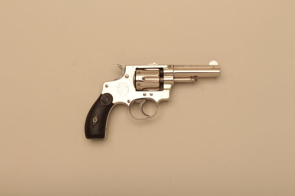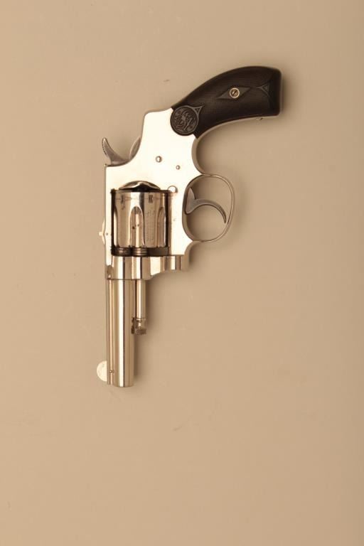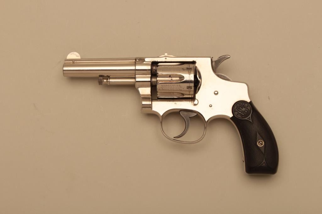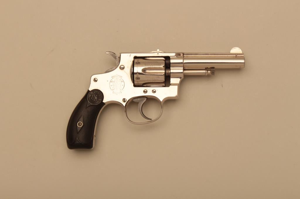 Smith & Wesson 32 Hand Ejector First Model DA revolver, .32 Long caliber, 3.25” barrel, nickel finish, checkered hard rubber grips, S/N 12115; overall fine to excellent condition. (Antique). Est.:$300-$600.