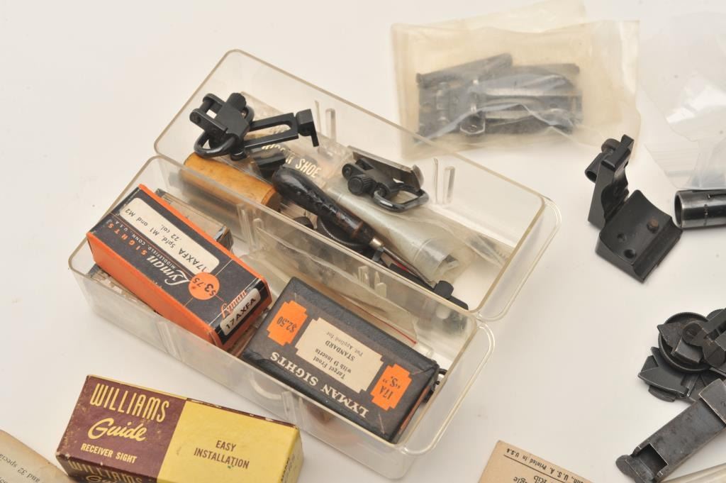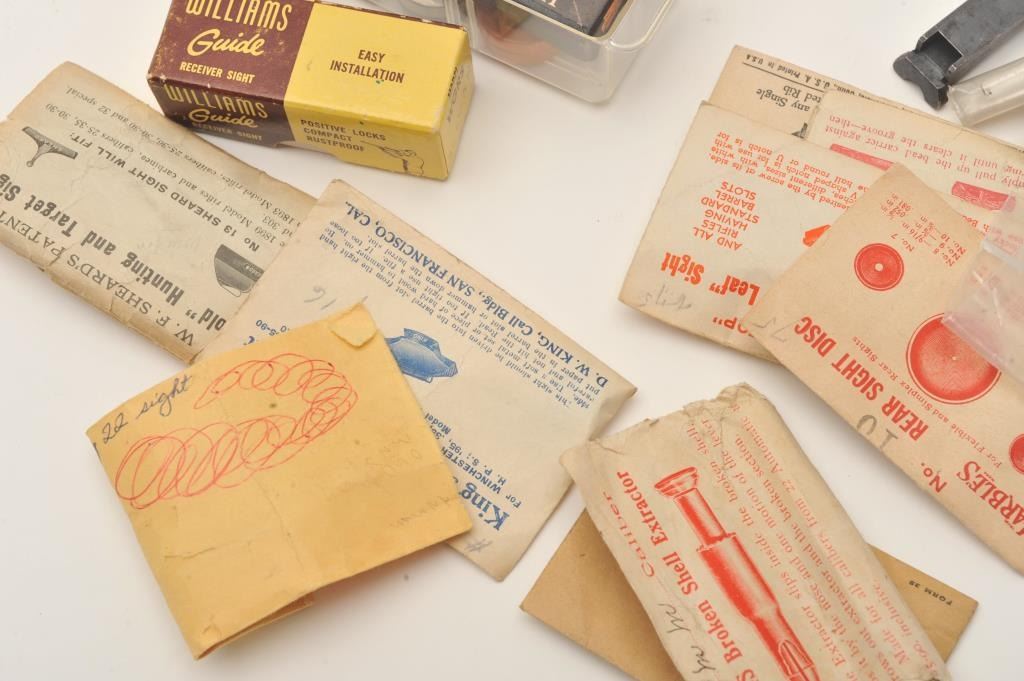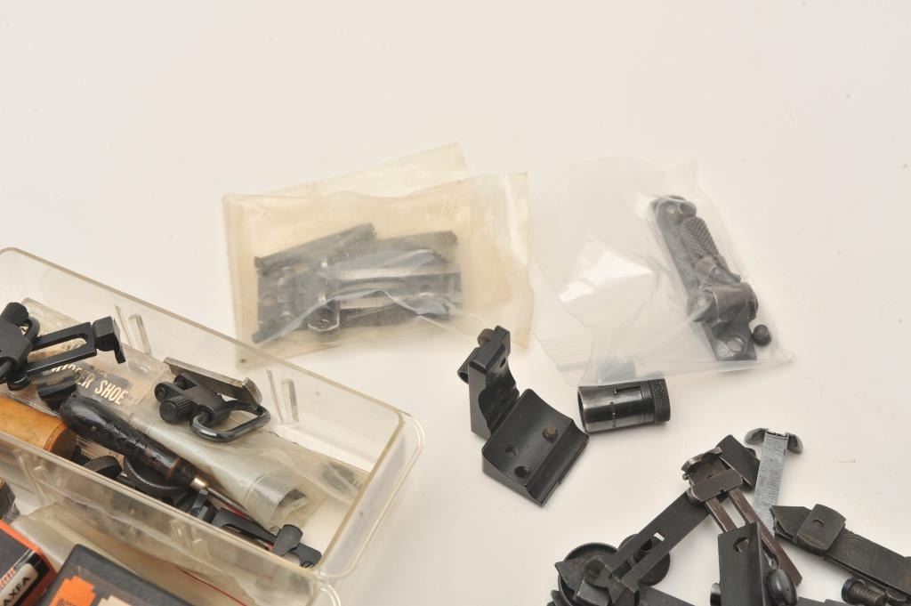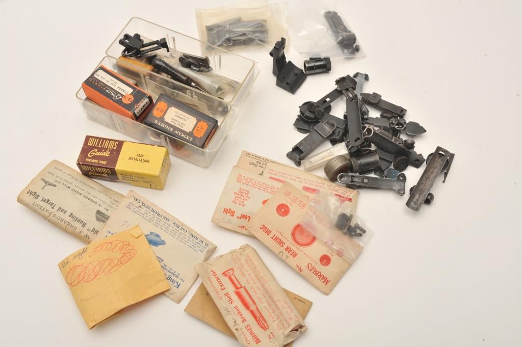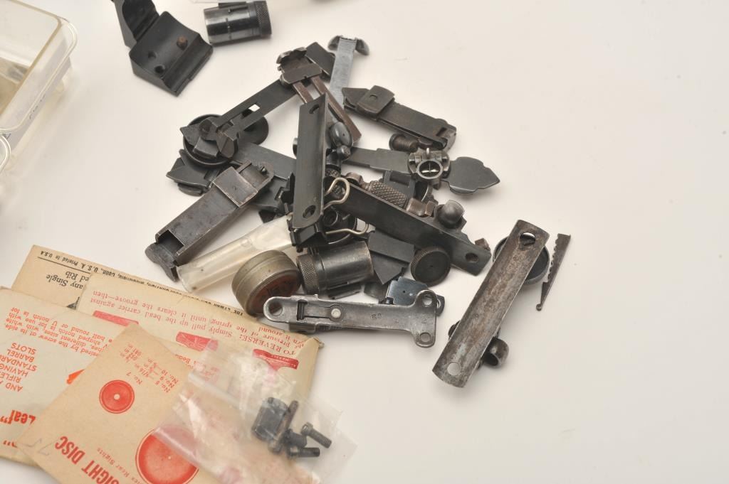 Lot of old misc. longarm and revolver sights and sight accessories; some in original boxes; sling swivels, etc. Est.: $200-$300.