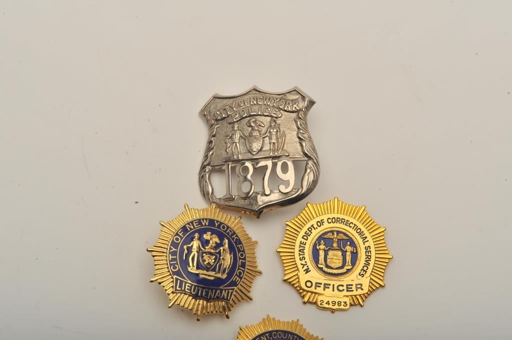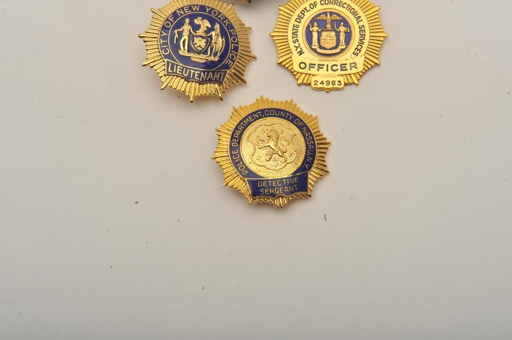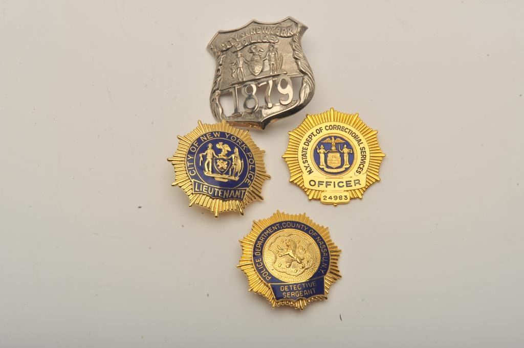 Lot of 4 badges including a N.Y. State Dept. of Correctional Services Officer clip shield badge #24983, a Det. Sgt. Police Department County of Nassau N.Y. pin shield badge, a City of New York Police Lieutenant cap badgeand a City of New York Police cap badge #1879. Est.: $200-$400.